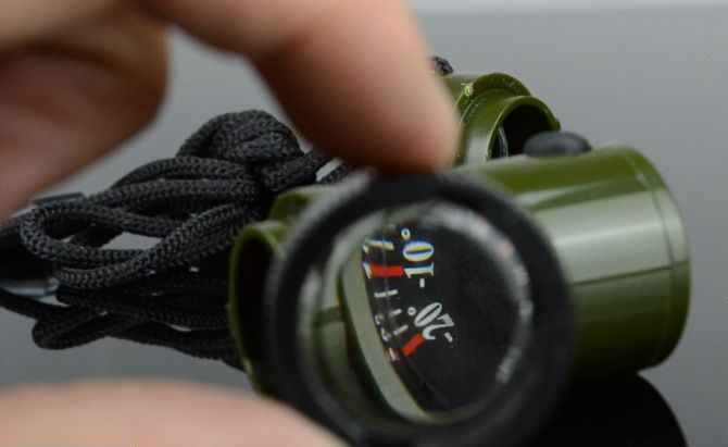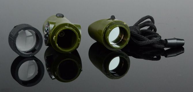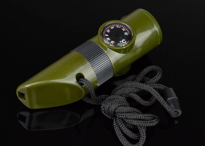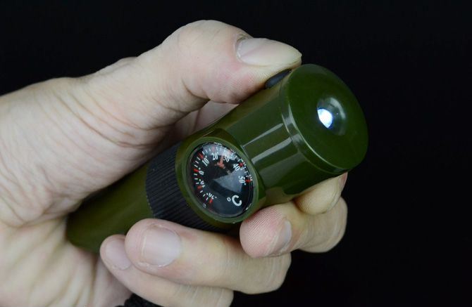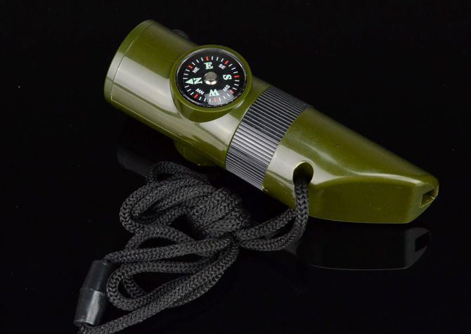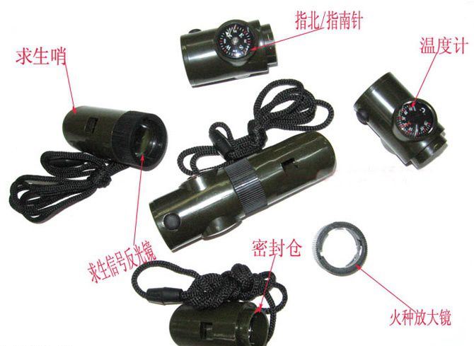 七功能军规高分贝求生哨 七种装备: 1,标准军规高分贝求生哨 2,指北(南)针 3、高精确温度计 4、求生反光信号镜 5、火种放大镜 6、高白光LED手电 7、密封仓 8、尼龙挂绳 尺寸:长9.8cm,直径3cm,重量:42克。