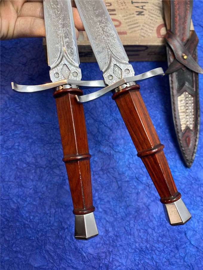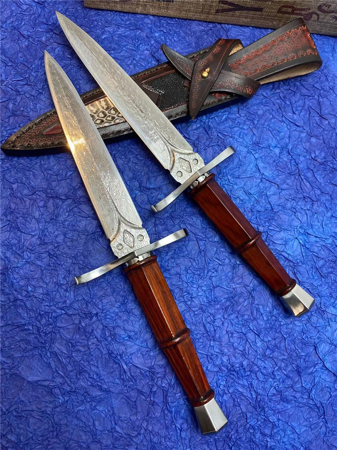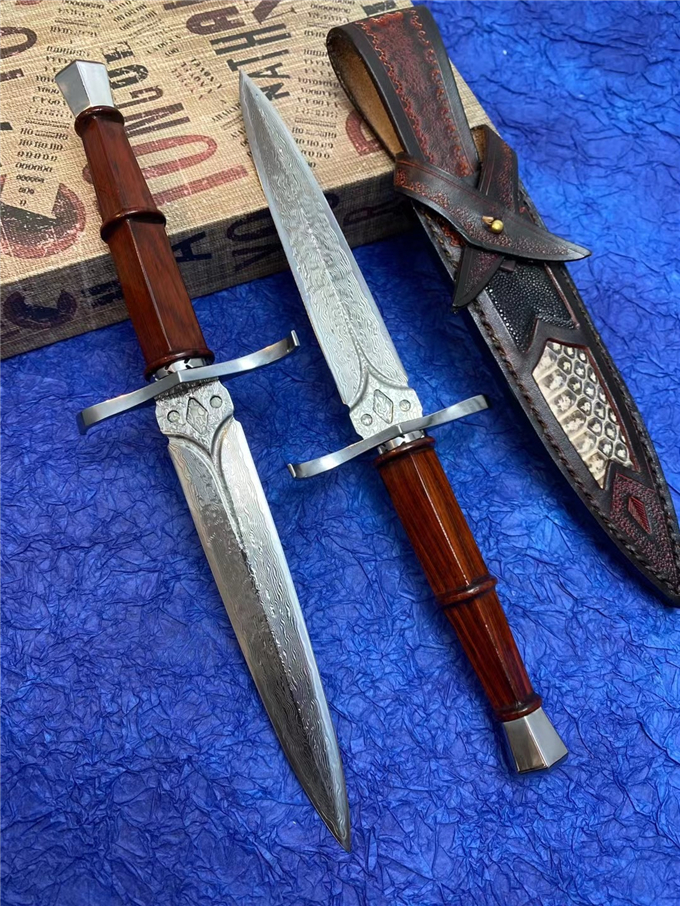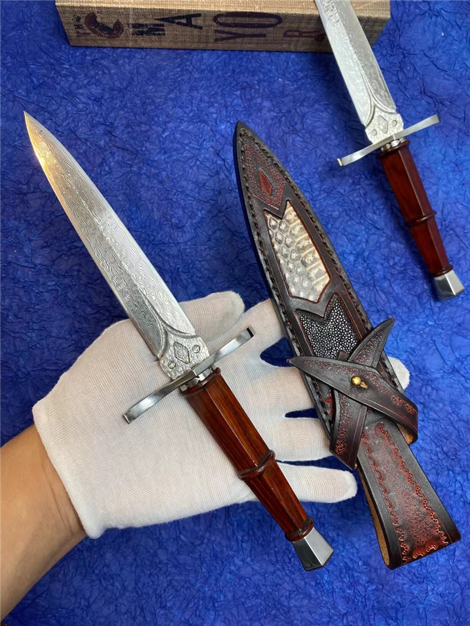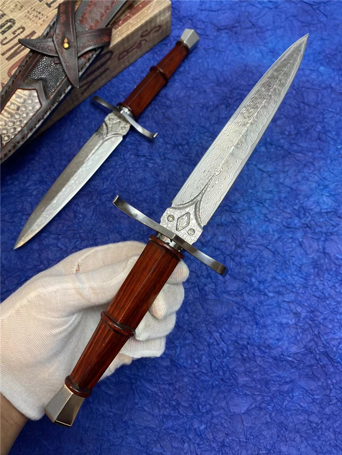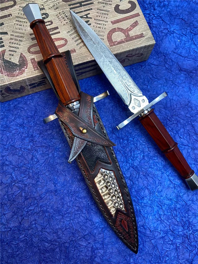 大马士革罗马神剑直刀 总长:28cm刀刃:14.5cm手柄:12cm刃宽:2.5cm厚度:3MM刃材:进口锻造大马士革钢硬度:60HRC手柄:微粒黄檀木皮套:进口植鞣皮镶嵌蛇皮+珍珠鱼皮刀套