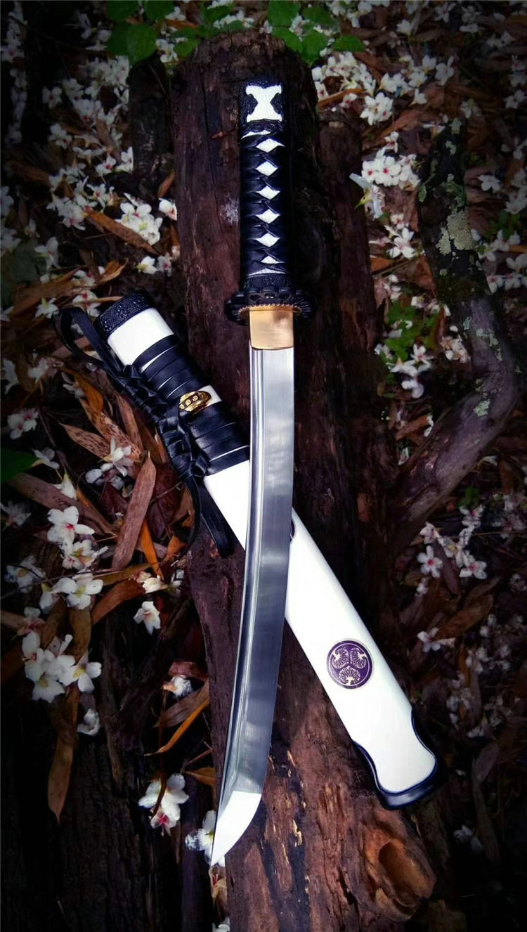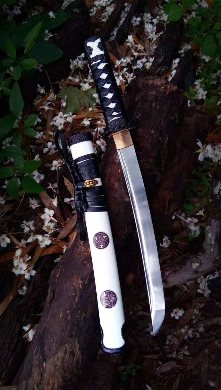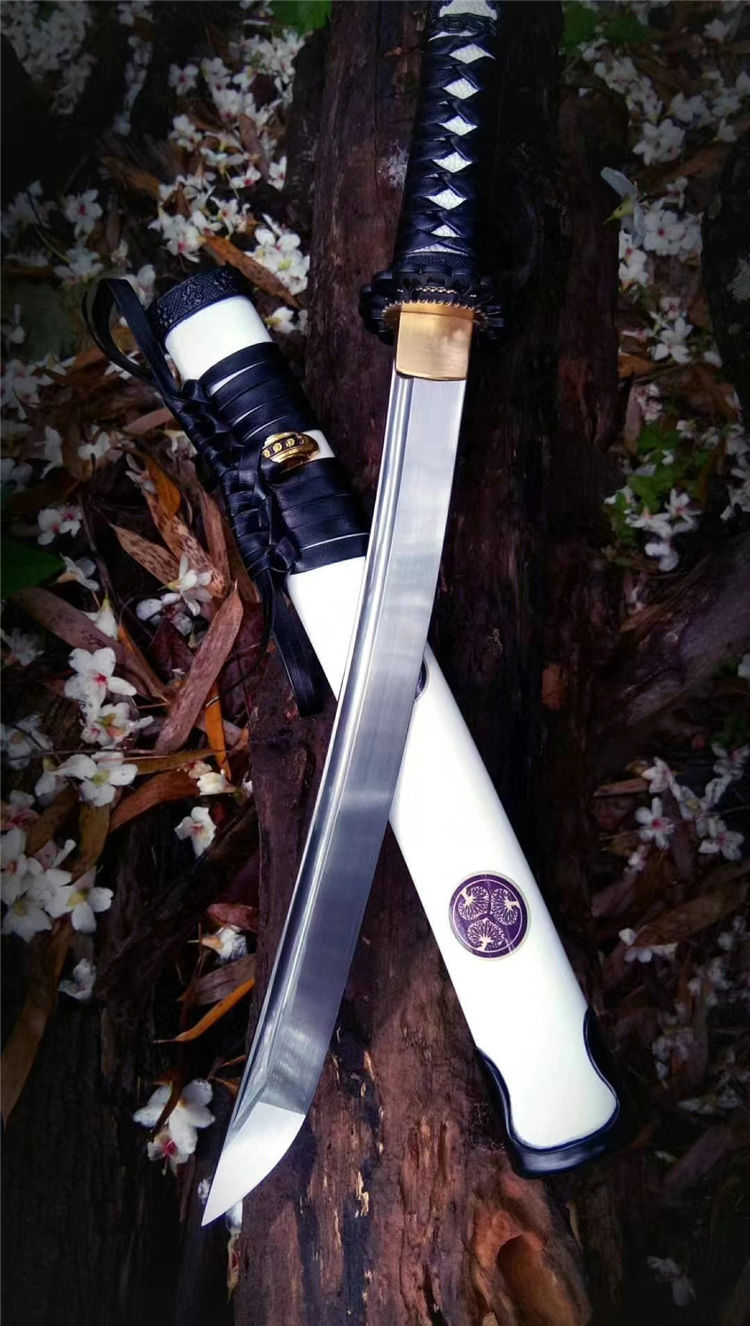德川武士短刀 全长:53cm 刃长:30cm 材质:高锰钢锻造 手工开槽,研磨,配纯铜刀镞,刀鞘铝制贴花烤漆内胆为高强度聚合ABS,手工缠绳,配饰为手工雕刻日式传统家徽纹饰装具
