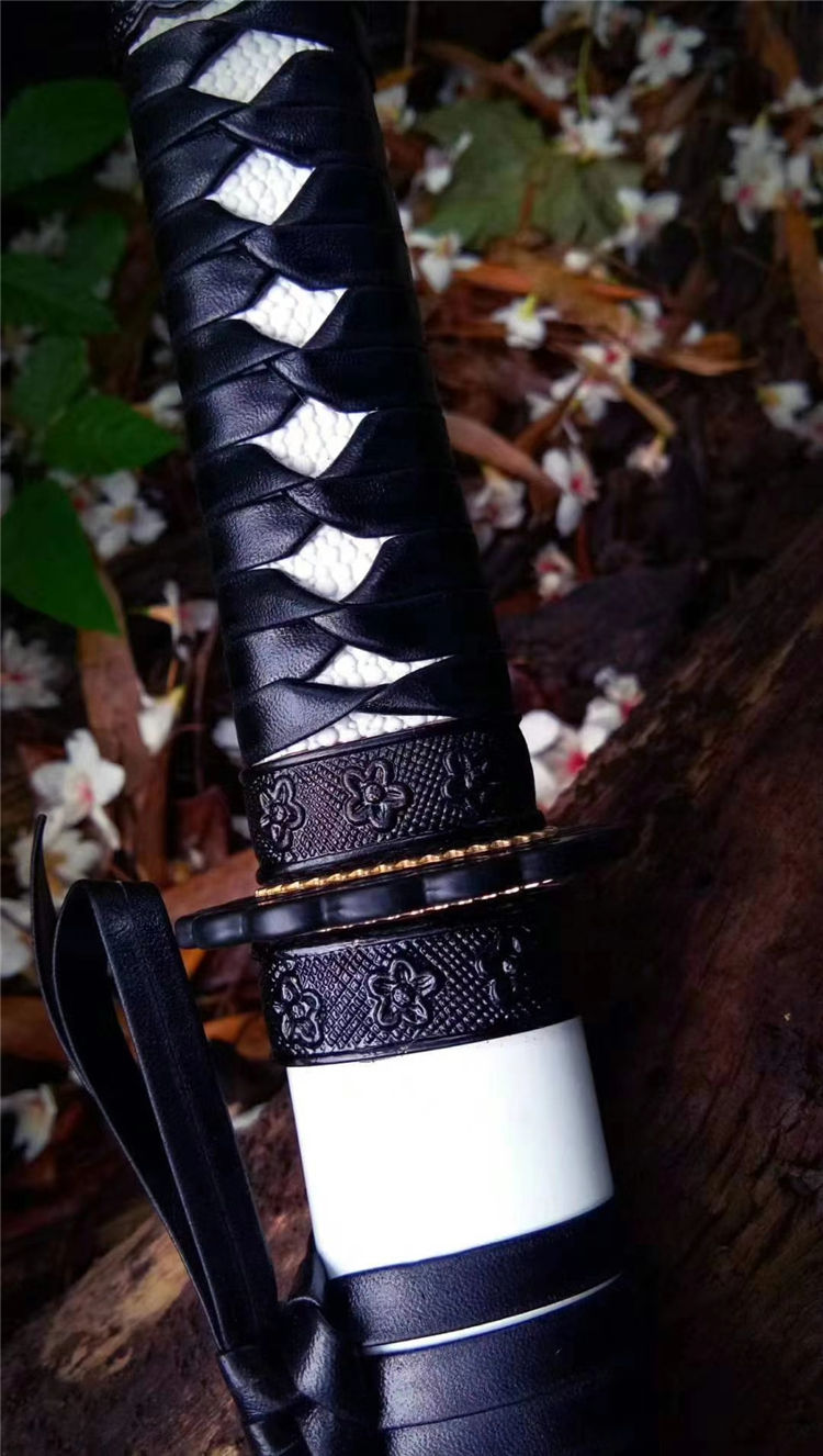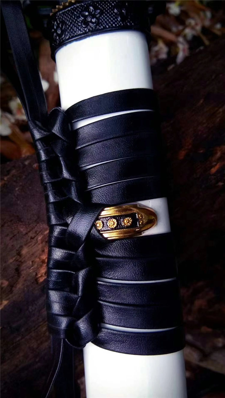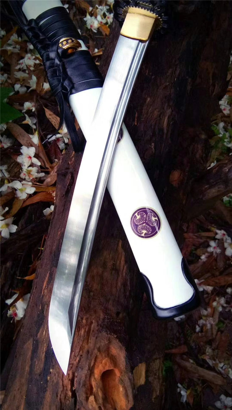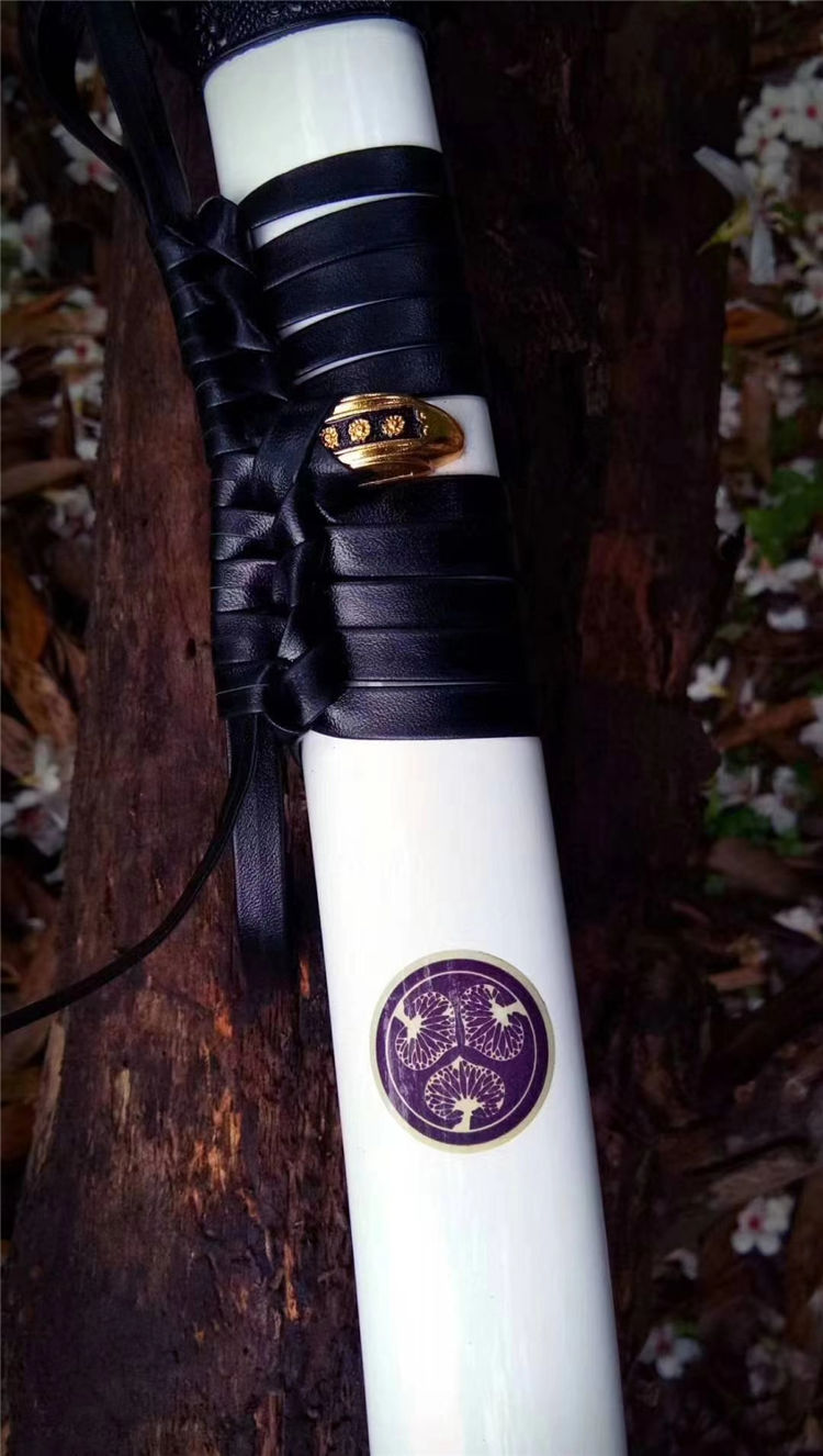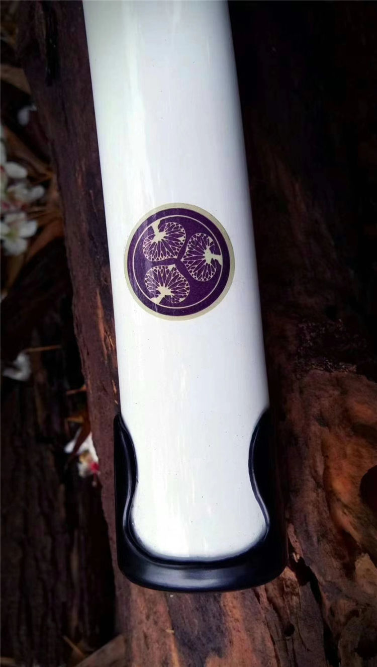 手工开槽,研磨,配纯铜刀镞,刀鞘铝制贴花烤漆内胆为高强度聚合ABS,手工缠绳,配饰为手工雕刻日式传统家徽纹饰装具