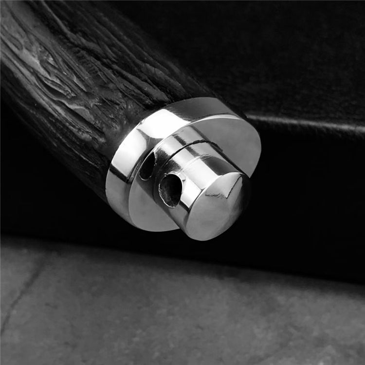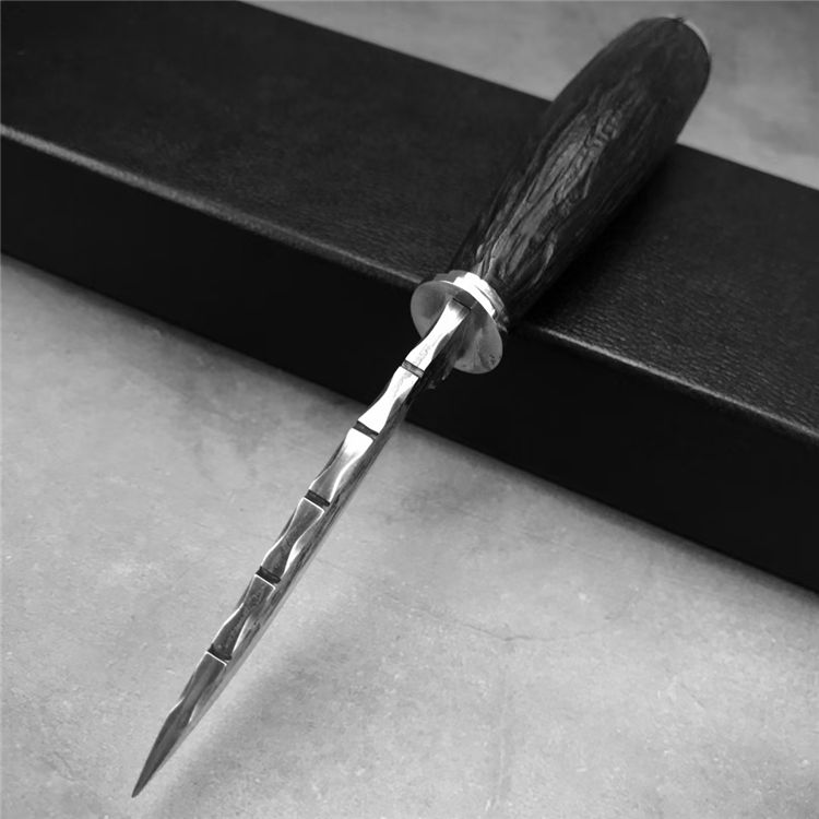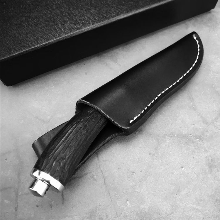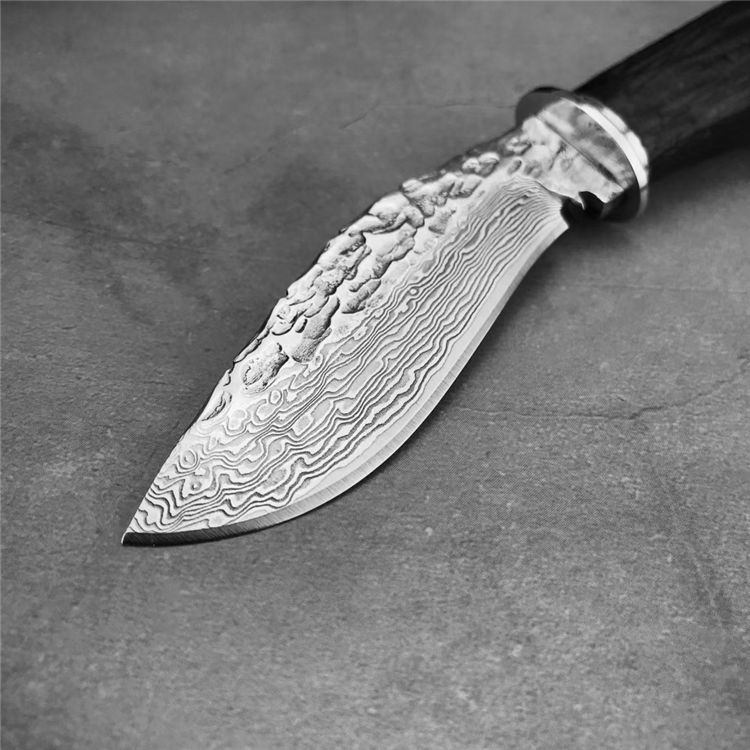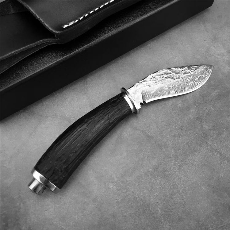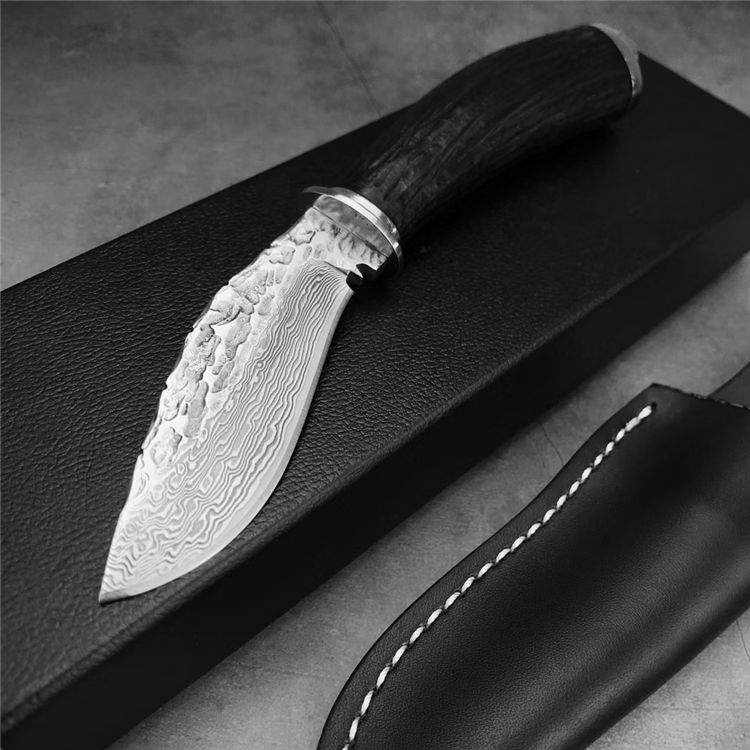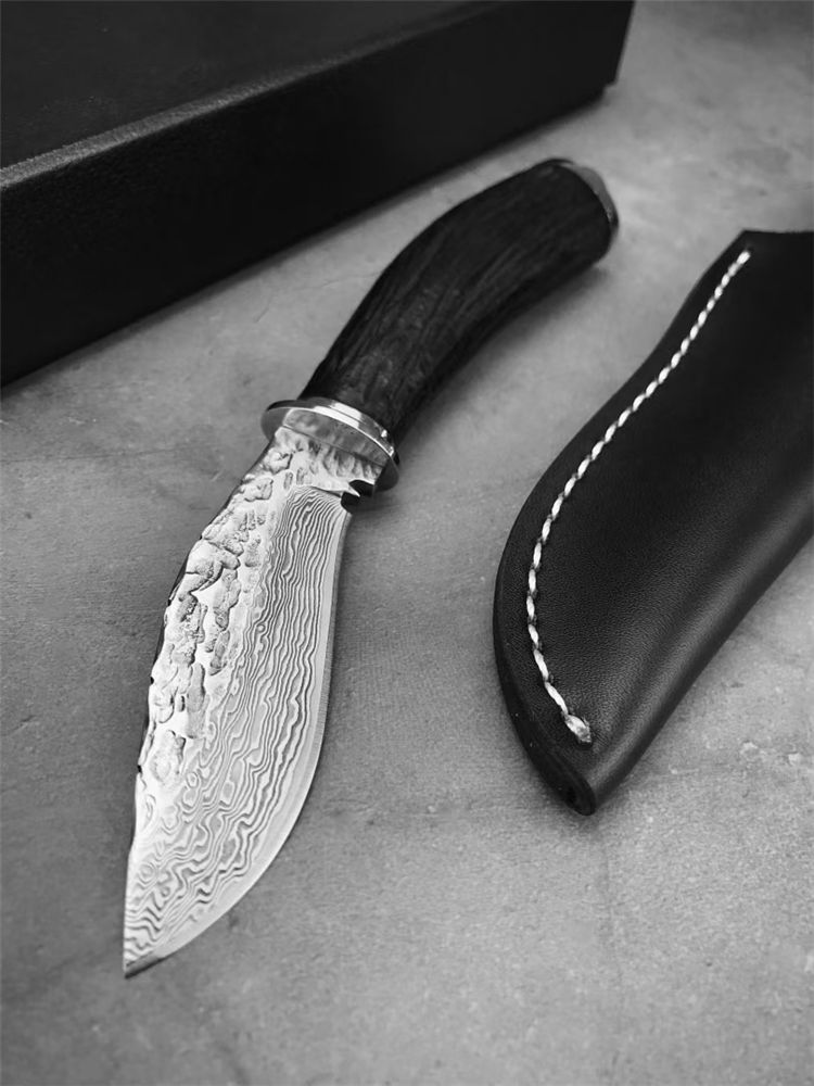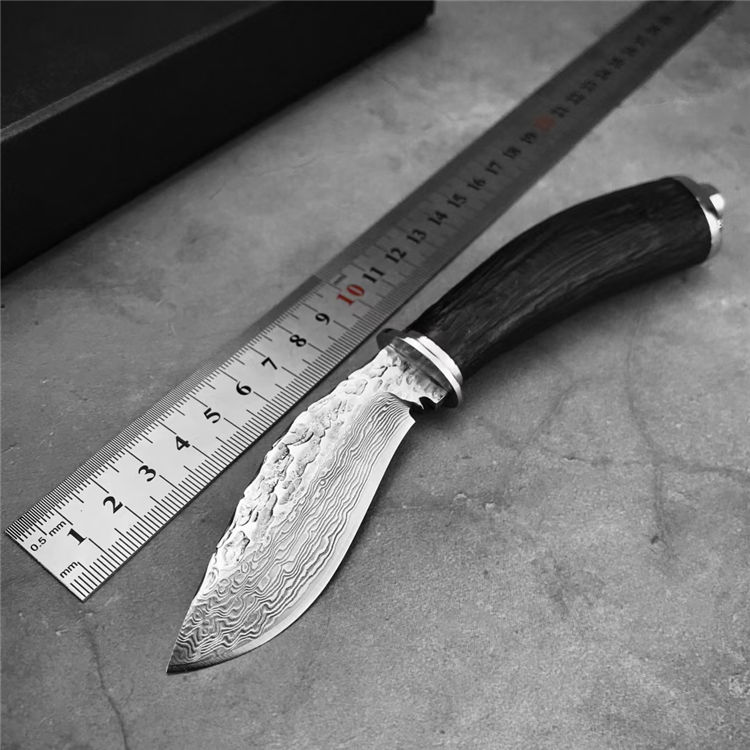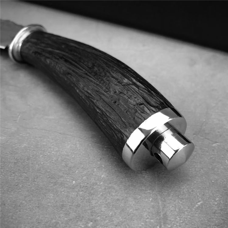 大马士革酷客小狗腿 全长:18.5CM 刃长:8.4CM 刃宽:2.5CM 刃材:大马士革钢 硬度:58 刃厚:4MM 柄长:10.1CM 柄材:黑檀木 重量:230G