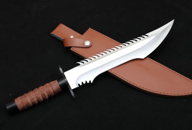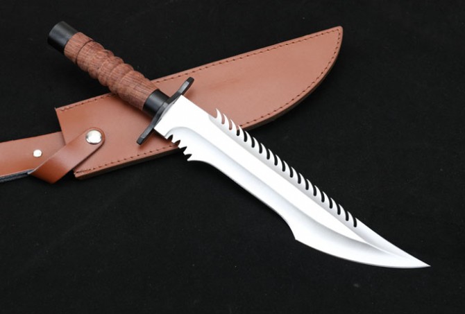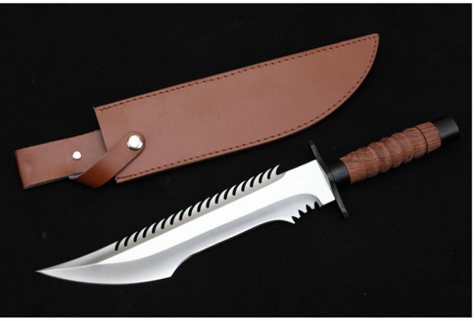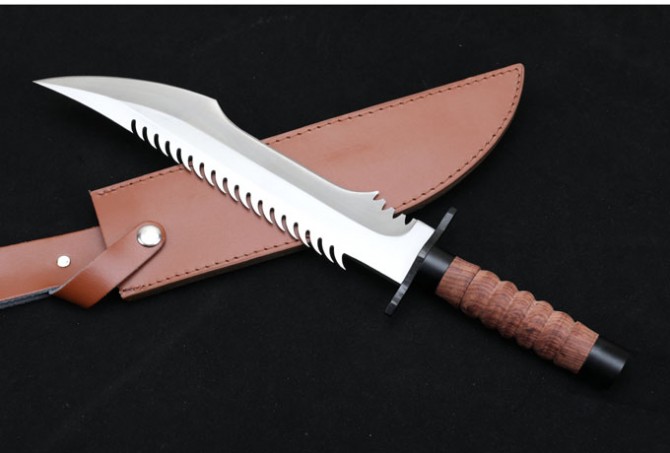 联合刀具蛟龙直刀 全长:41.3cm 刃长:27.5cm 柄长:13.5cm 刃厚:0.55cm 刃宽:5.3cm 刃材:8CR15MOV 柄材:钢头护手+防滑酸枝木柄,刀背带齿 硬度:57HRC 净重:780克 总重:616克(含包装) 刀身:一体龙骨 表面处:沙光 其它:复合皮套