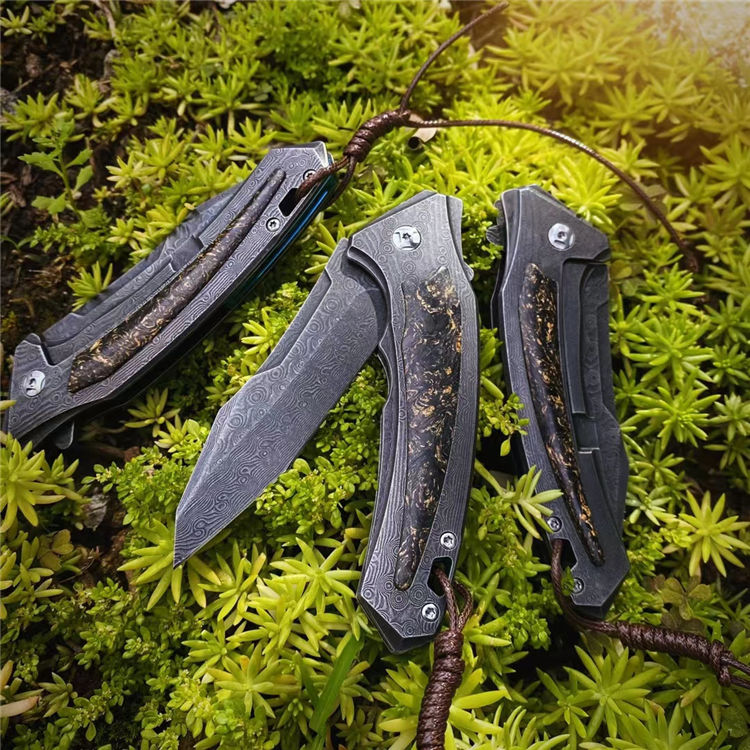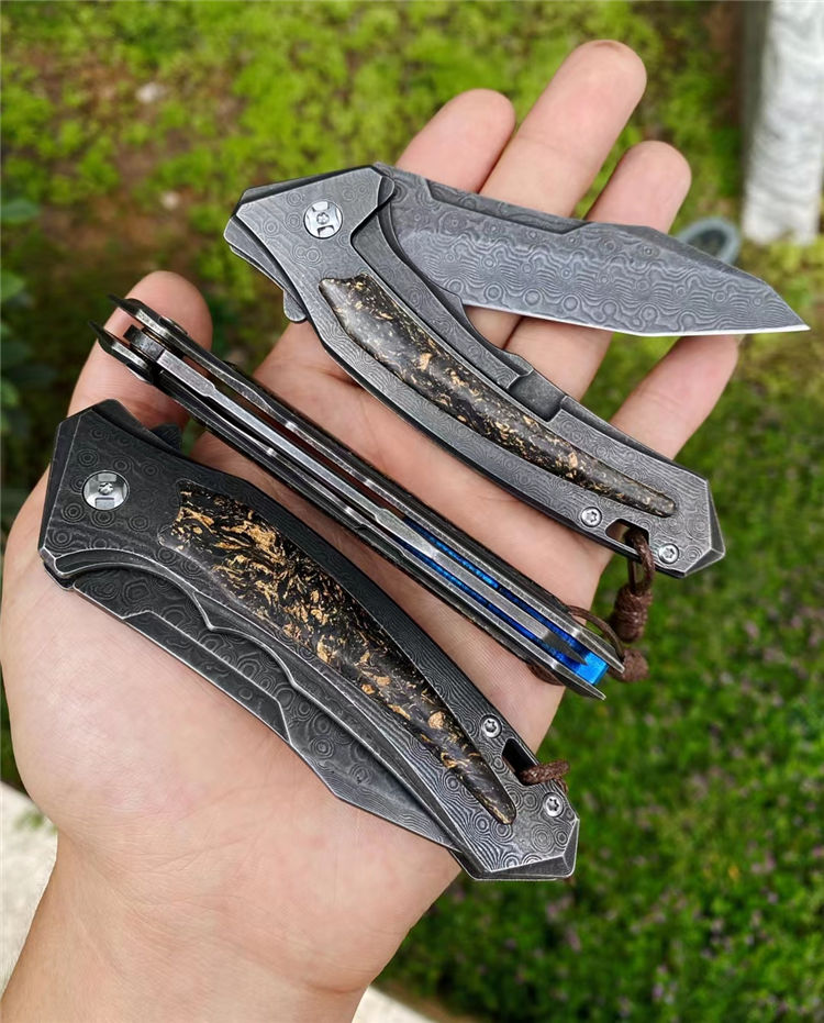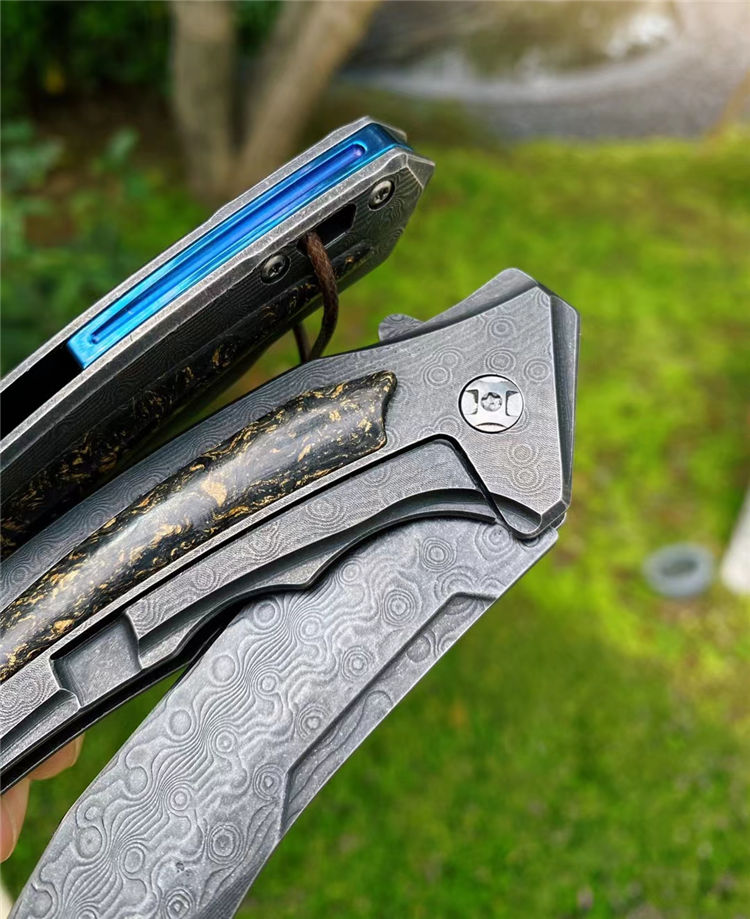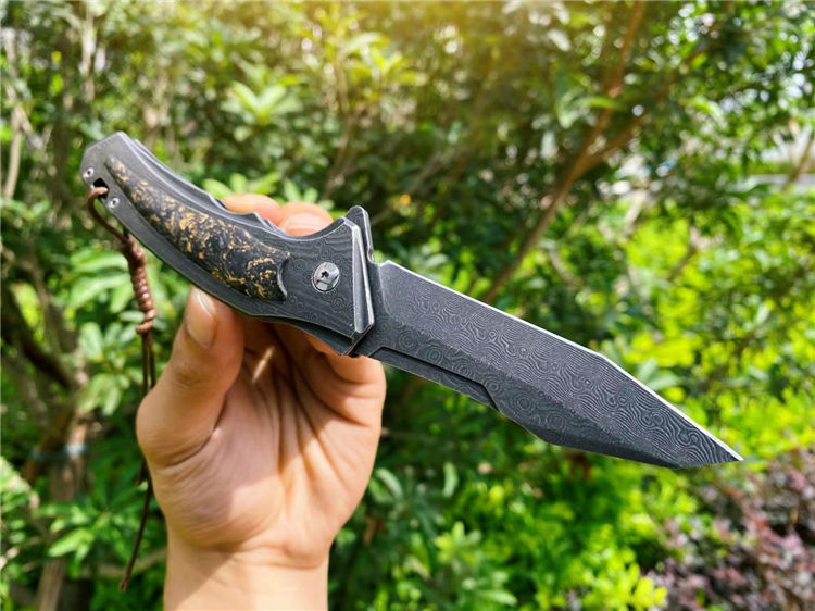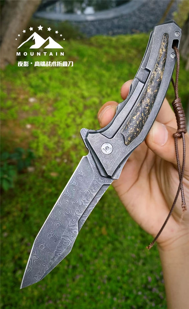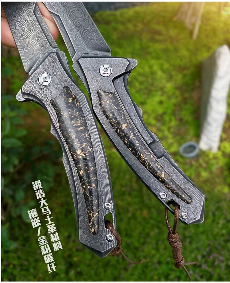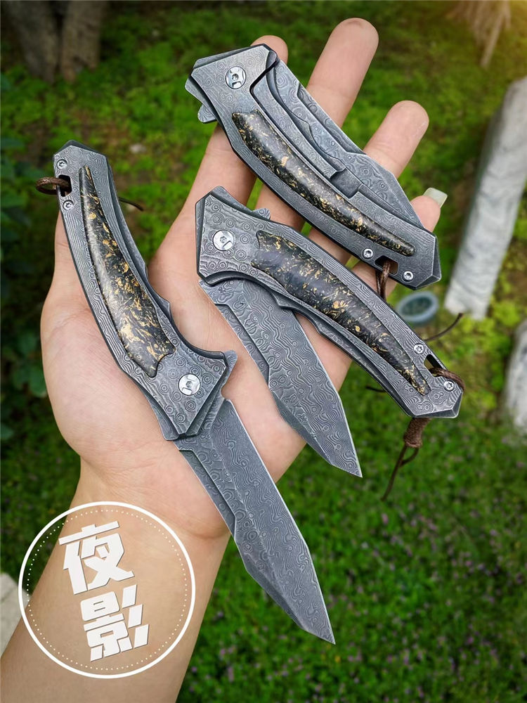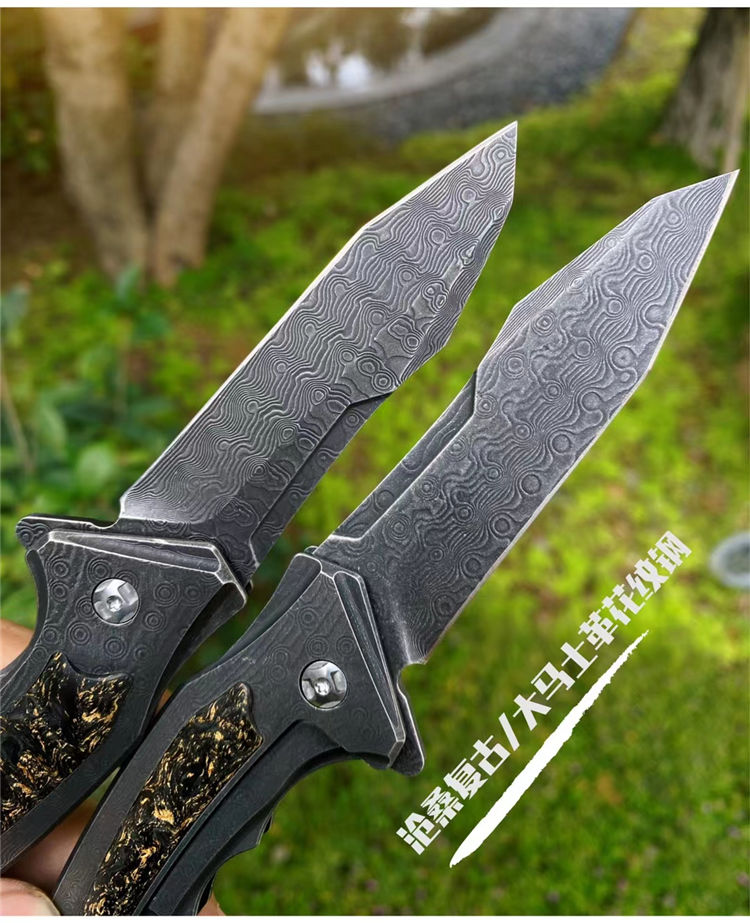 大马士革夜影折刀 总长:19.5cm 刀刃:8.5cm 折合:11.5cm 刃宽:2.3cm 刃厚:3MM 刃材:进口锻造大马士革钢 热处理:真空热处理 硬度:60HRC 结构:滚珠轴承快开 柄材:进口大马士革钢+金粉碳纤 包装:黑色硬小礼盒