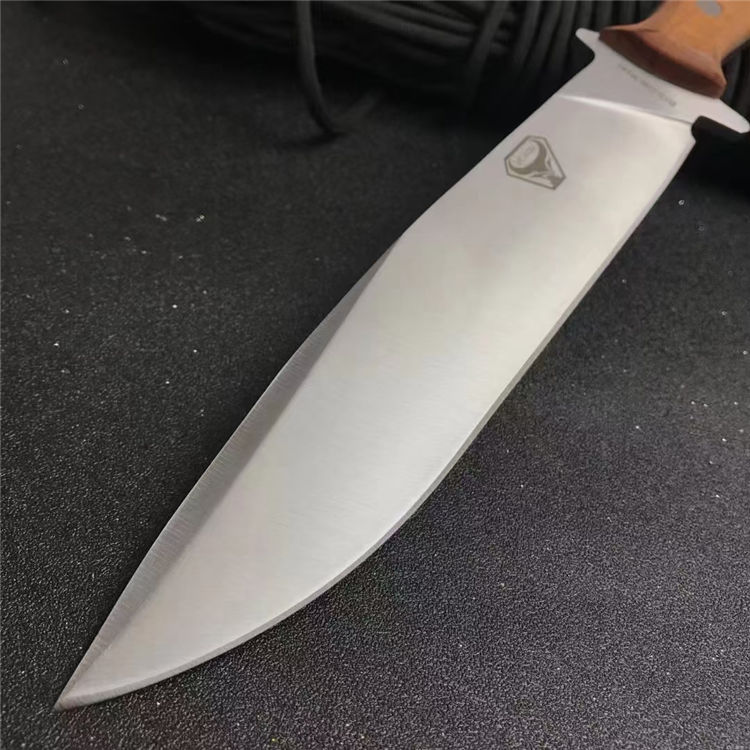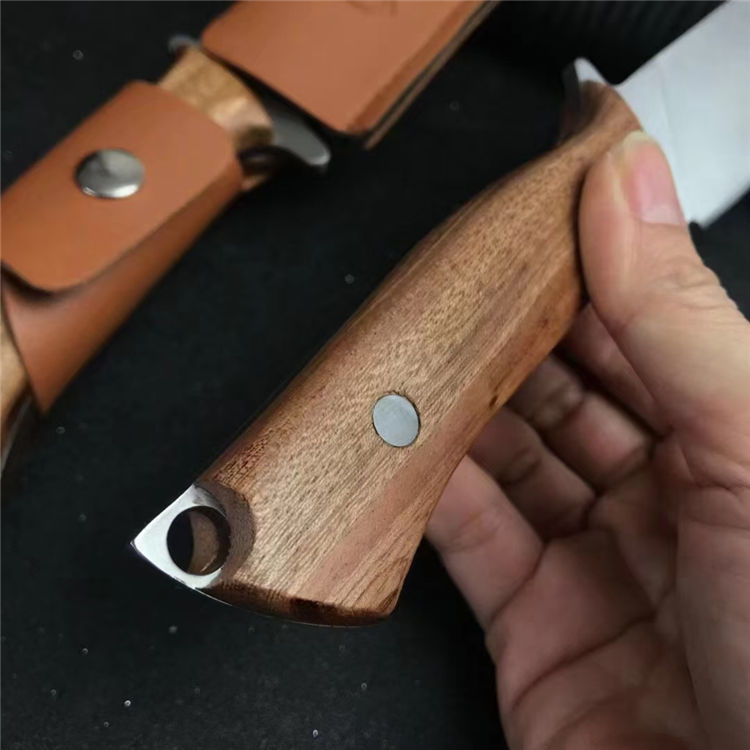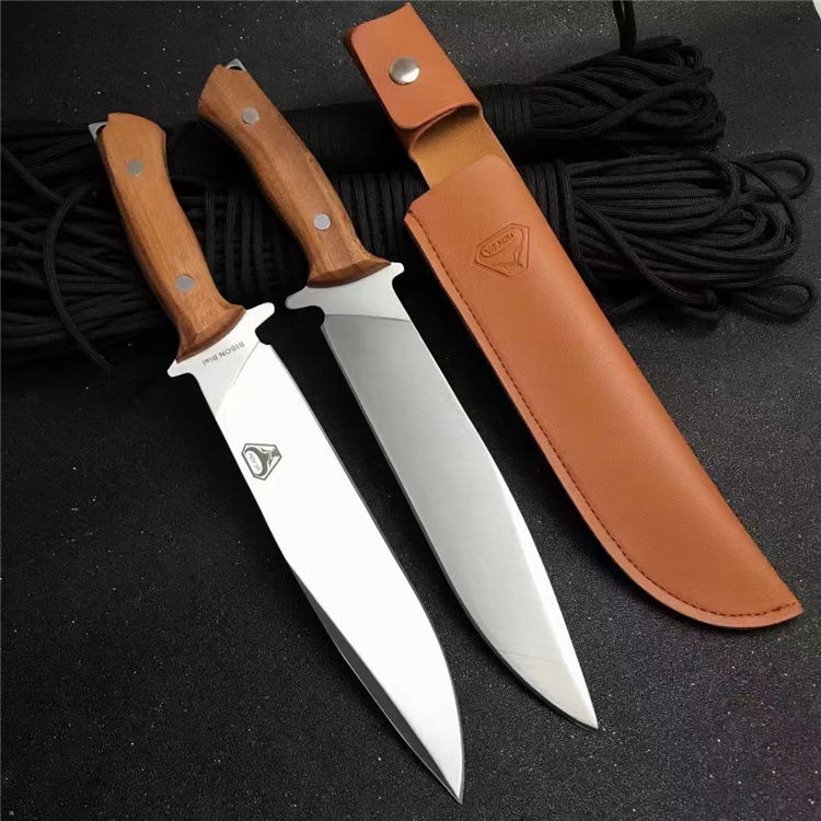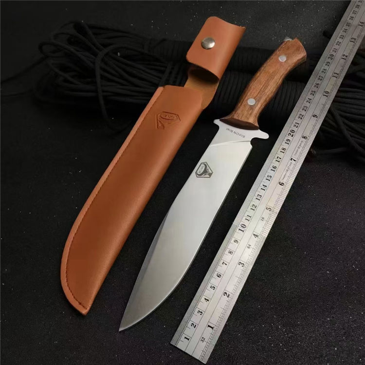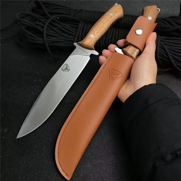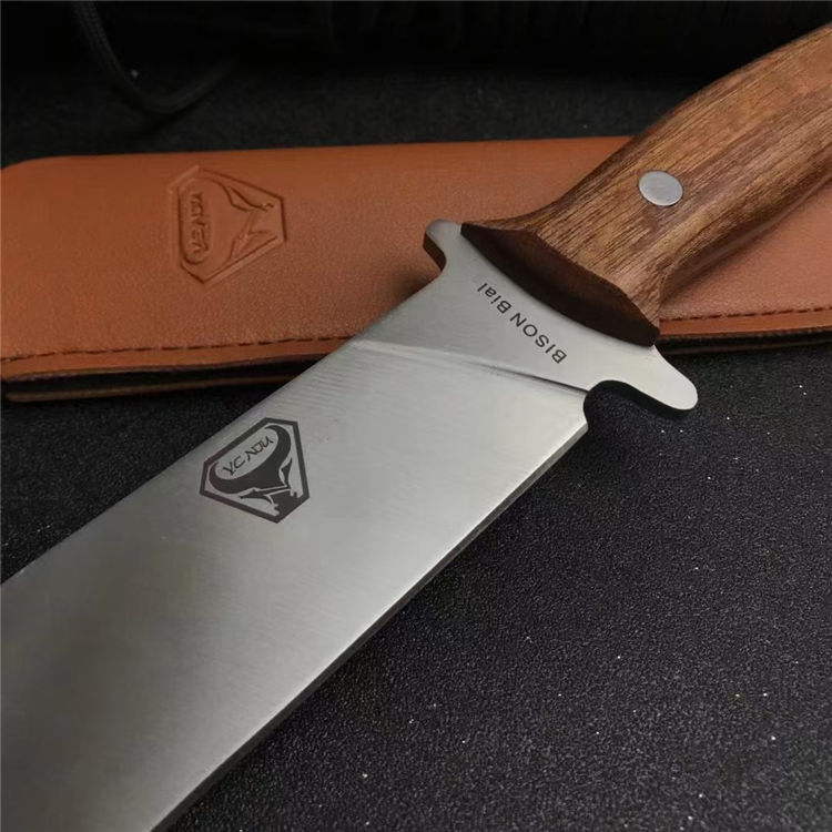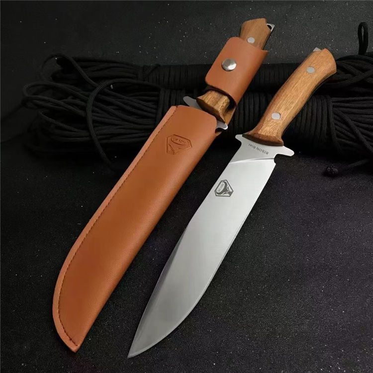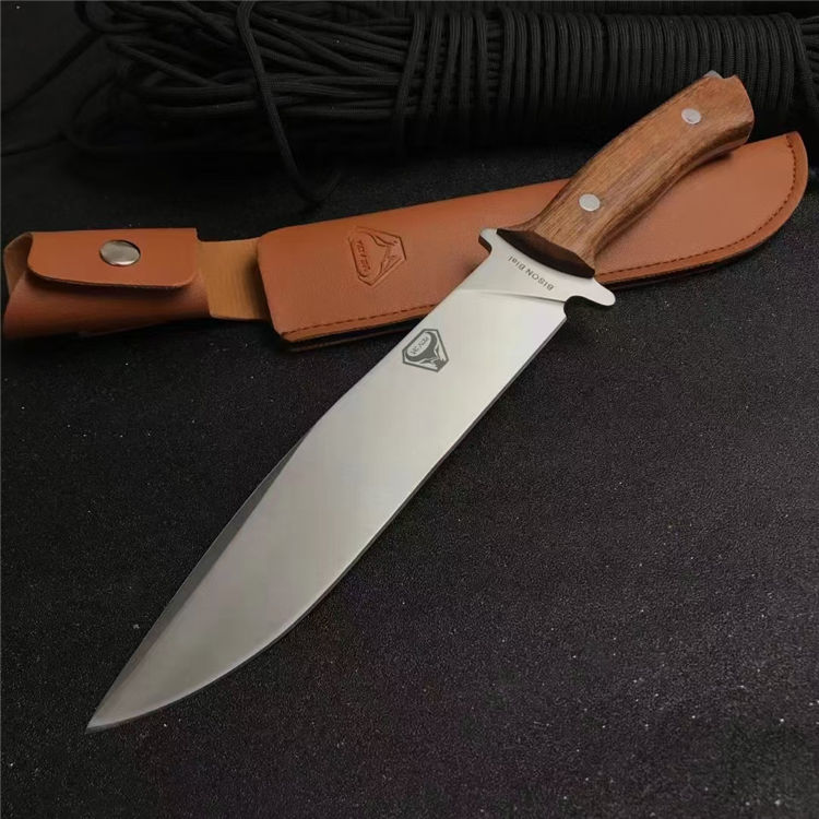 野牛BISON猎刀 全长:30cm 刃长:18.5cm 柄长:11.5cm 刃宽:3.5cm 刃厚:0.5cm 刃材:5Cr17Mov 重量:209g 硬度:57HRC 表面:砂光+拉丝 柄材:一体龙骨+鸡翅木 包装:配皮套