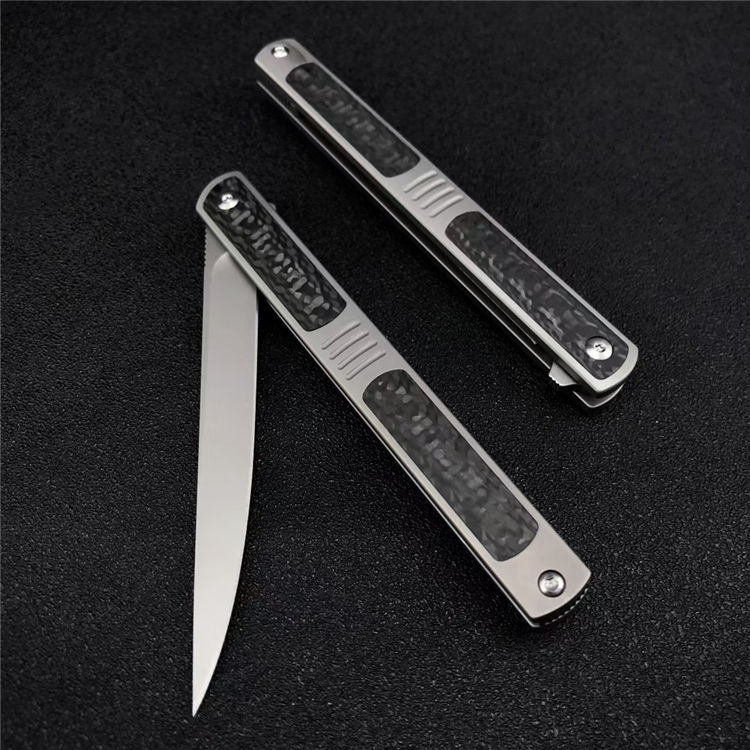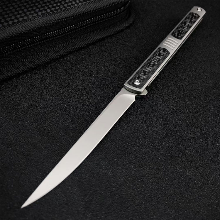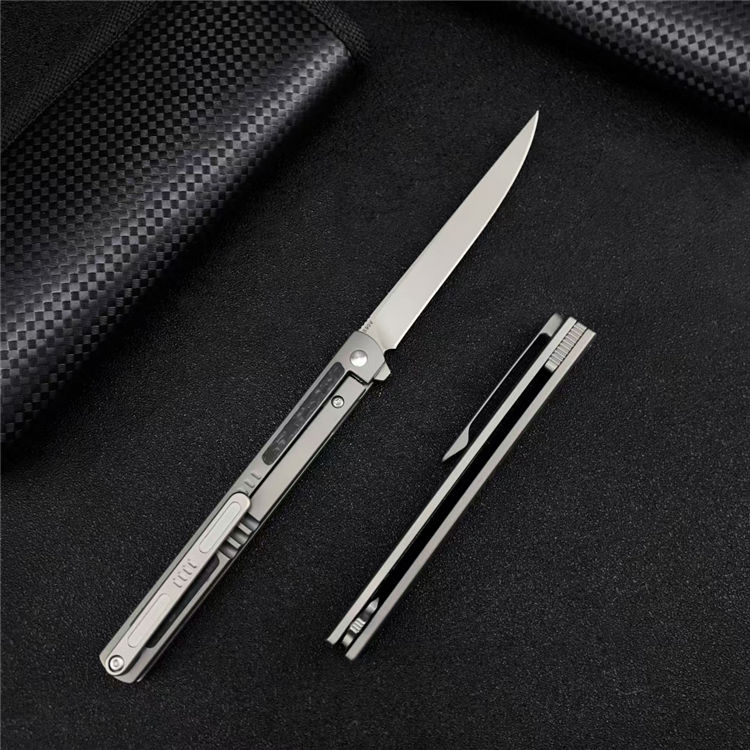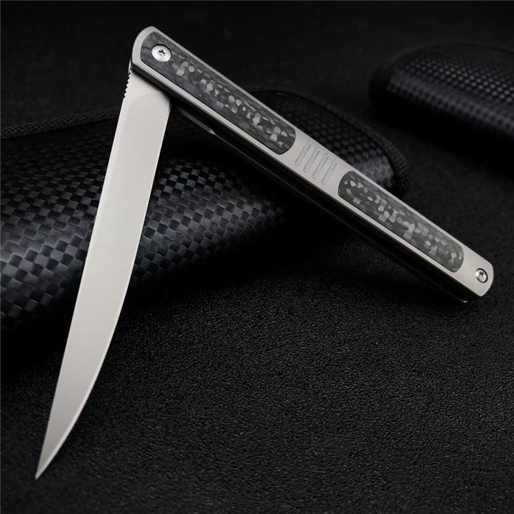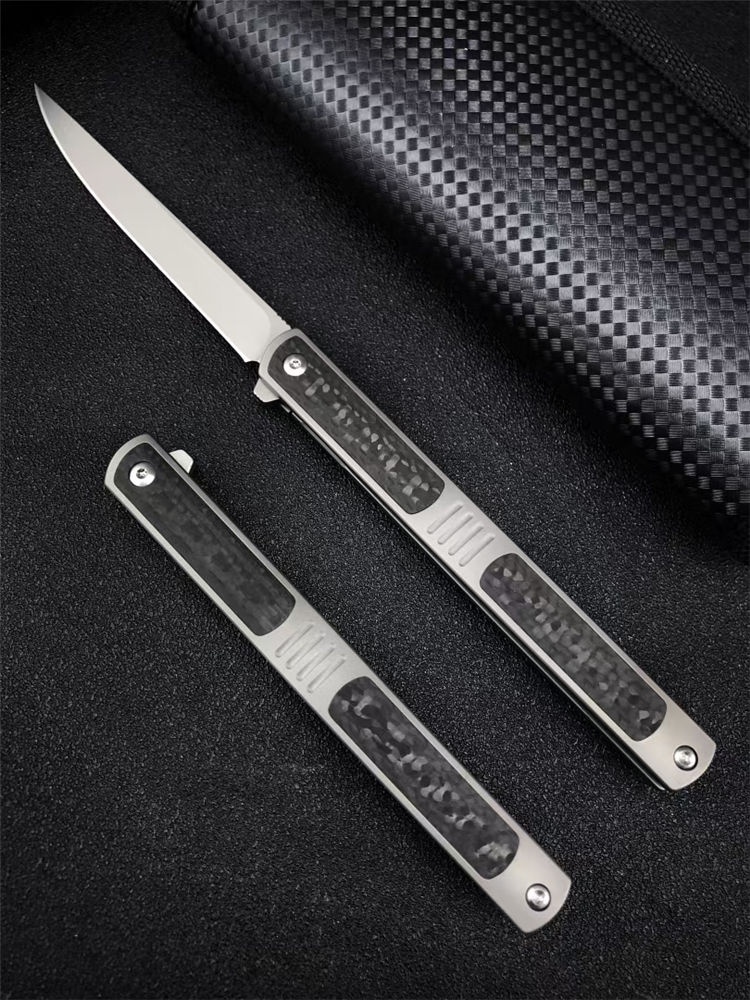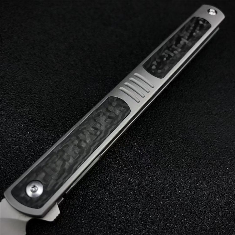 神仙笔折刀 全长:20.5CM 刃长:9.3CM 刃宽:1.1CM 刃材:S90V 硬度:60 刃厚:3MM 柄长:11.2CM 柄材:钛合金+碳钎维 重量:96G 包装:碳纤纹编制袋