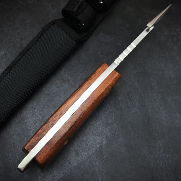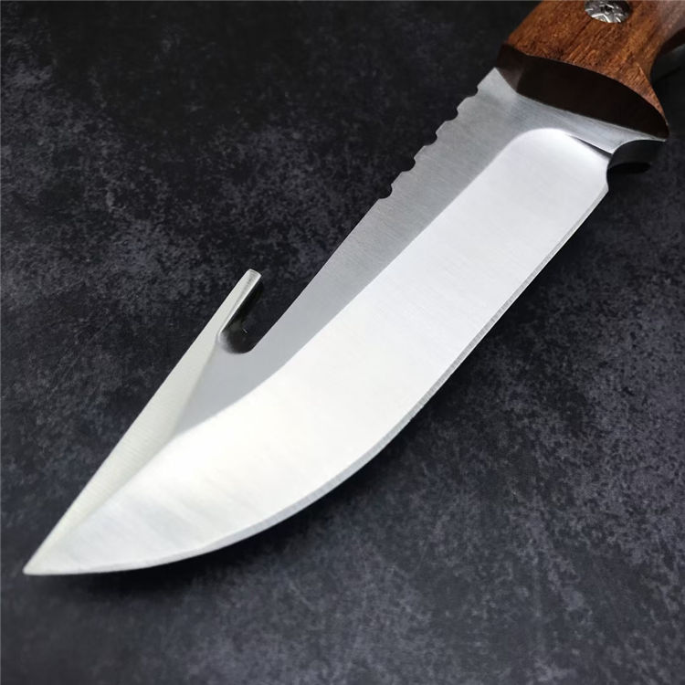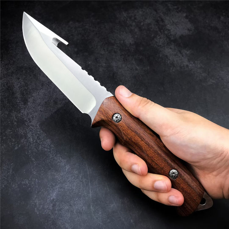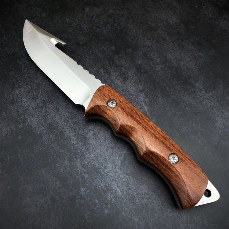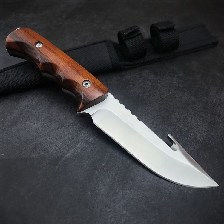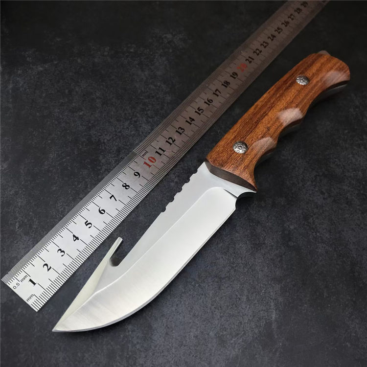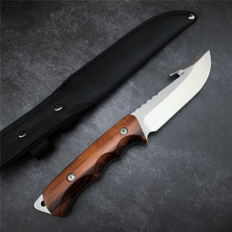 犀牛直刀 全长:23.7CM 刃长:11.2CM 刃材:7CR13MOV 硬度:58 刃宽:3.2CM 刃厚:5MM 柄长:12.5CM 柄材:彩木 重量:316G 刀鞘:尼龙鞘