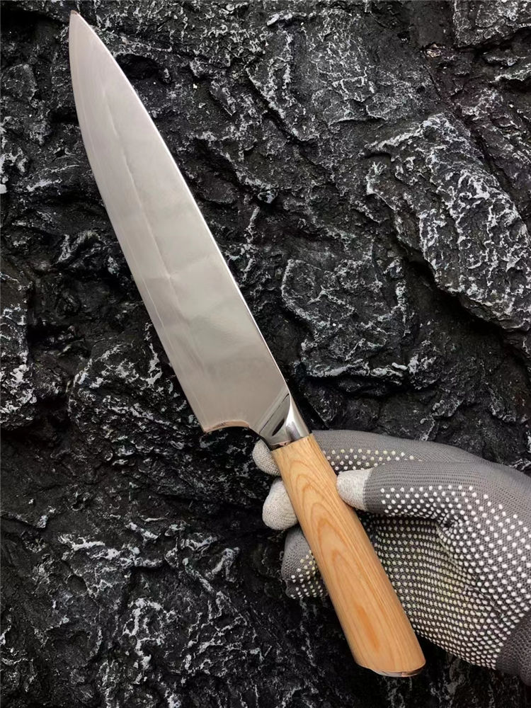 大马士革日本代工厨刀 总长:33cm 刃长:20cm 刃厚:1.8mm 刃宽:4.5cm 刃材:进口VG10大马士革钢 手柄:不锈钢头+进口木 包装:高档礼盒装