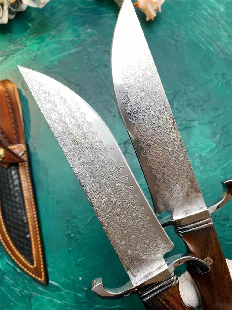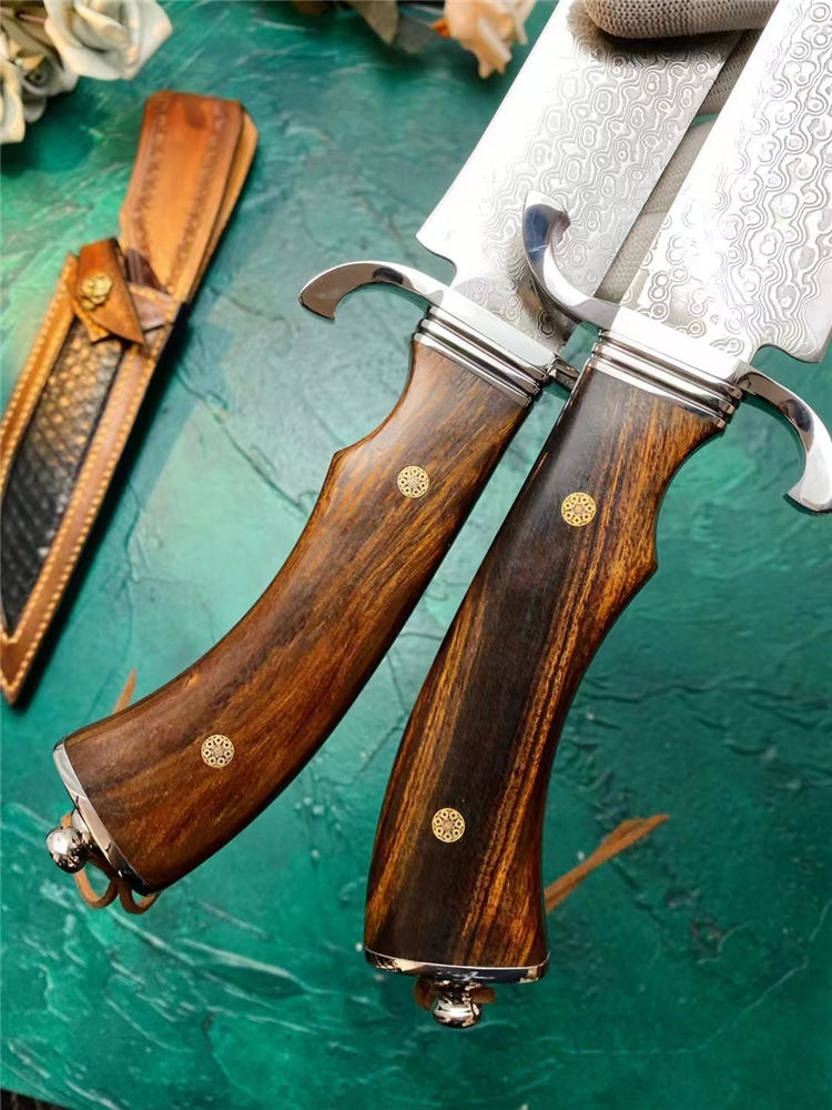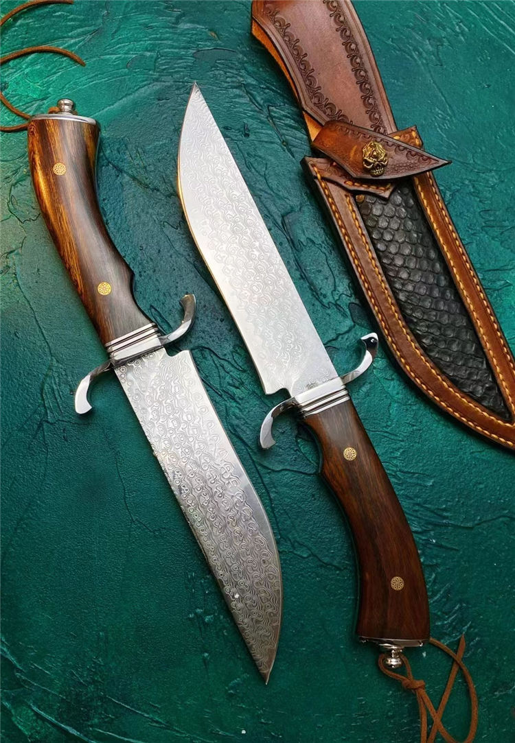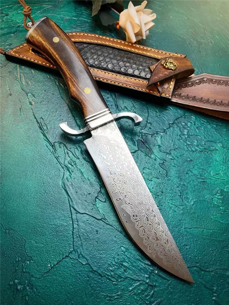 大马士革雷森博弈直刀 全长:30cm 刃度:16cm 手柄:13.5cm 刃宽:3.6cm 刃厚:3.8mm 刃材:进口大马士革VG10钢 硬度:60HRC 开刃方式:二次研磨 柄材:不锈钢护手+进口沙漠铁木 皮套:意大利进口植鞣手工皮套