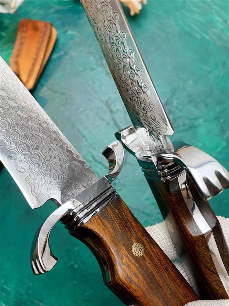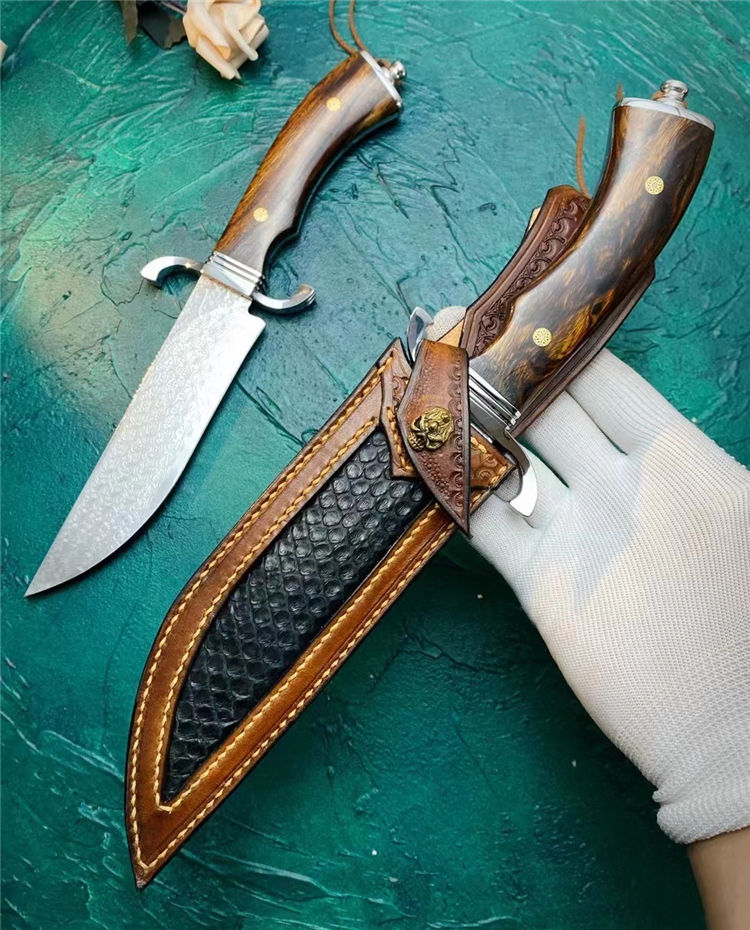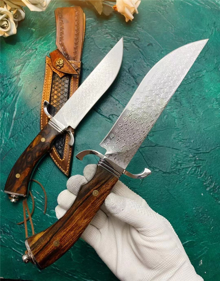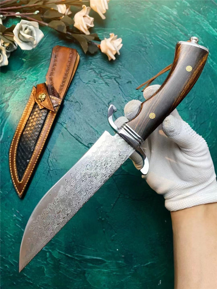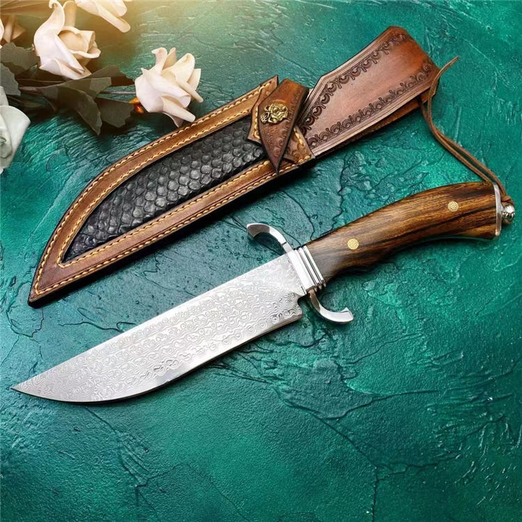 大马士革雷森博弈直刀 全长:30cm 刃度:16cm 手柄:13.5cm 刃宽:3.6cm 刃厚:3.8mm 刃材:进口大马士革VG10钢 硬度:60HRC 开刃方式:二次研磨 柄材:不锈钢护手+进口沙漠铁木 皮套:意大利进口植鞣手工皮套