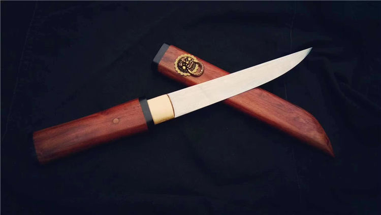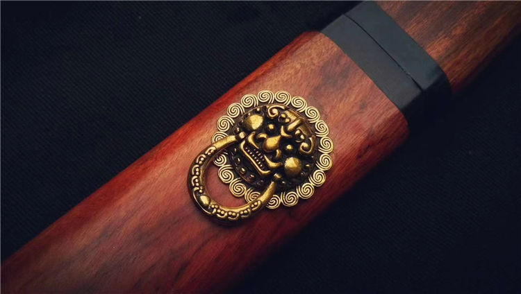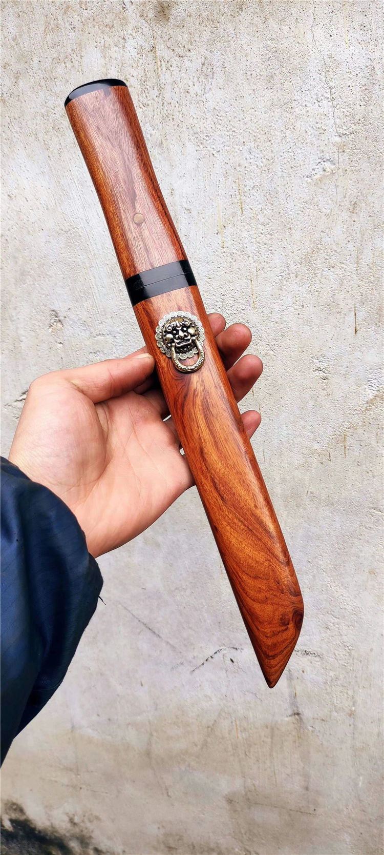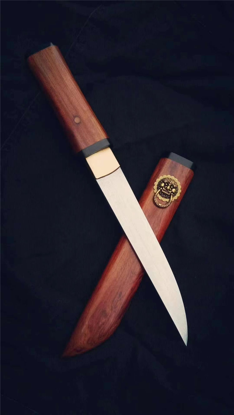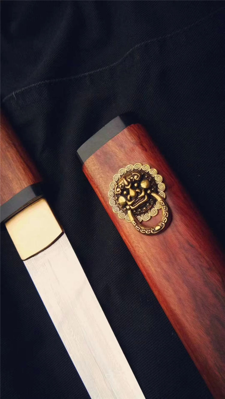 手工锻打研磨,配纯铜刀簇,锻打纹理非常清晰,非常锋利,鞘为进口为南美酸枝木,手工裁料,木纹非常漂亮,镶嵌水牛角,刀鞘镶嵌手工雕刻复古唐狮咬环,非常适合收藏把玩,手工出品请以实物尺寸为基准