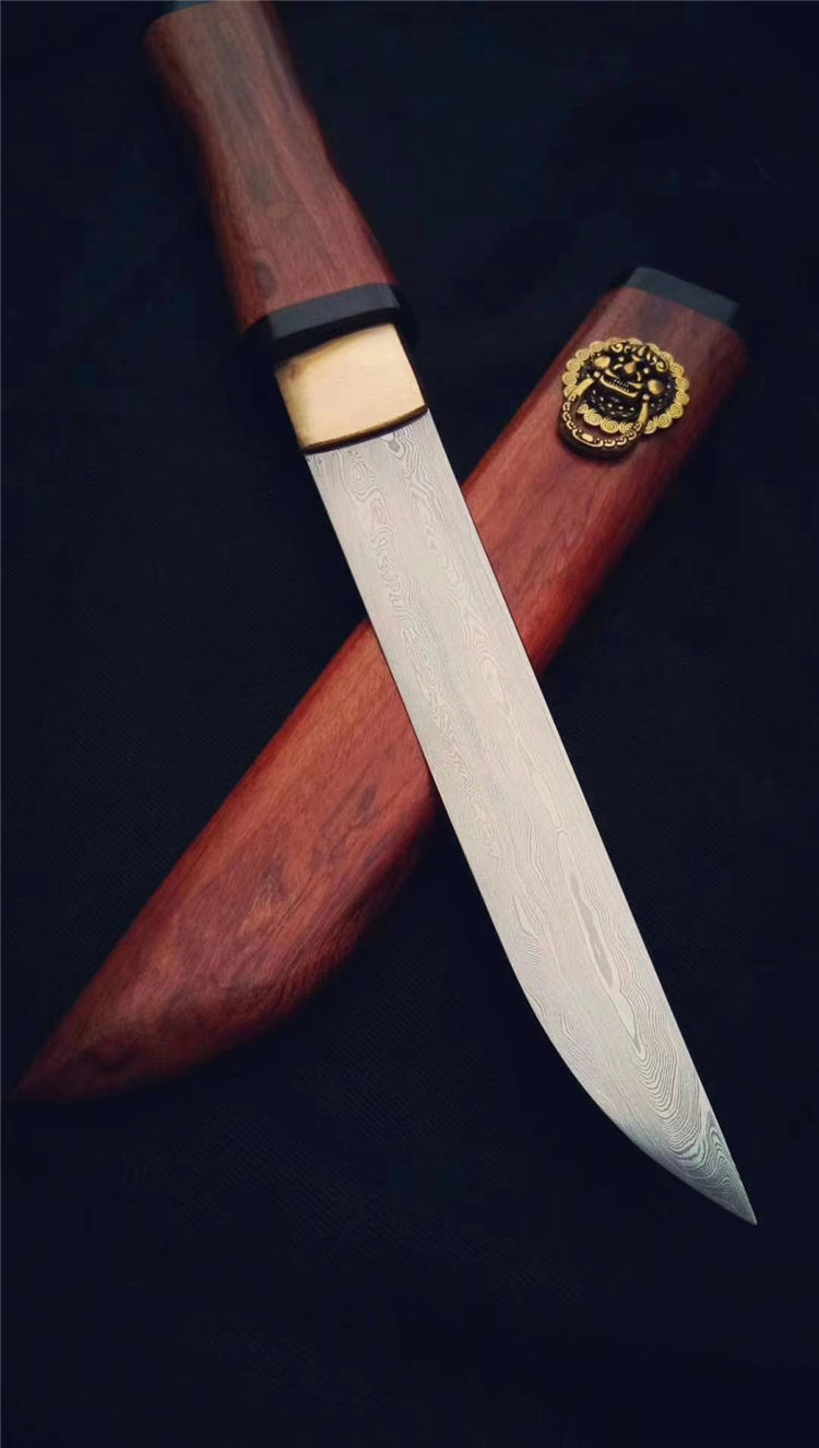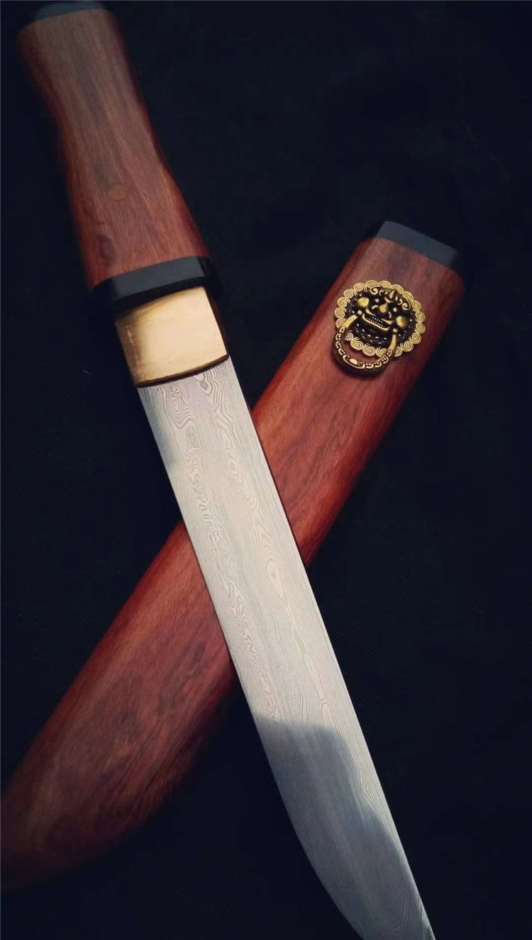 唐狮武士刀 全长:35.8cm 刃长:15.3cm 刃材:百炼花纹钢 手工锻打研磨,配纯铜刀簇,锻打纹理非常清晰,非常锋利,鞘为进口为南美酸枝木,手工裁料,木纹非常漂亮,镶嵌水牛角,刀鞘镶嵌手工雕刻复古唐狮咬环,非常适合收藏把玩,手工出品请以实物尺寸为基准