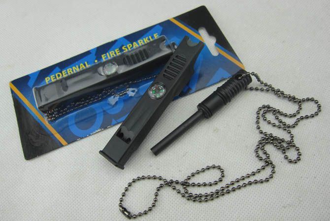 多功能户外打火器 品名:打火器 长度:10.0cm 宽度:1.5cm 厚度:1.0cm 材料:塑料 重量:30克 其他功能:指南针、口哨、挂链