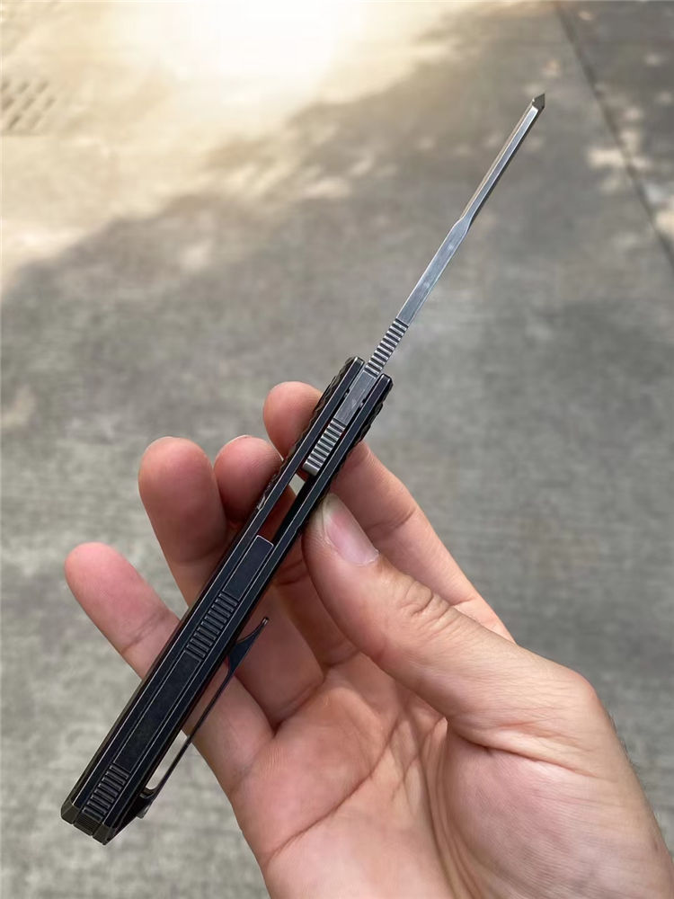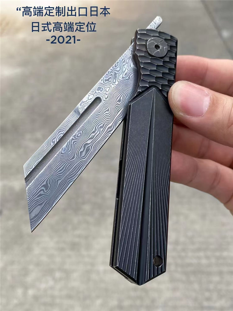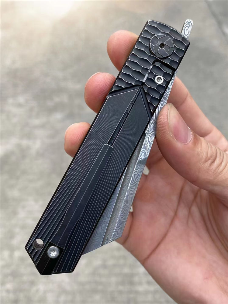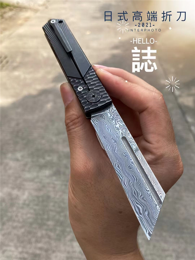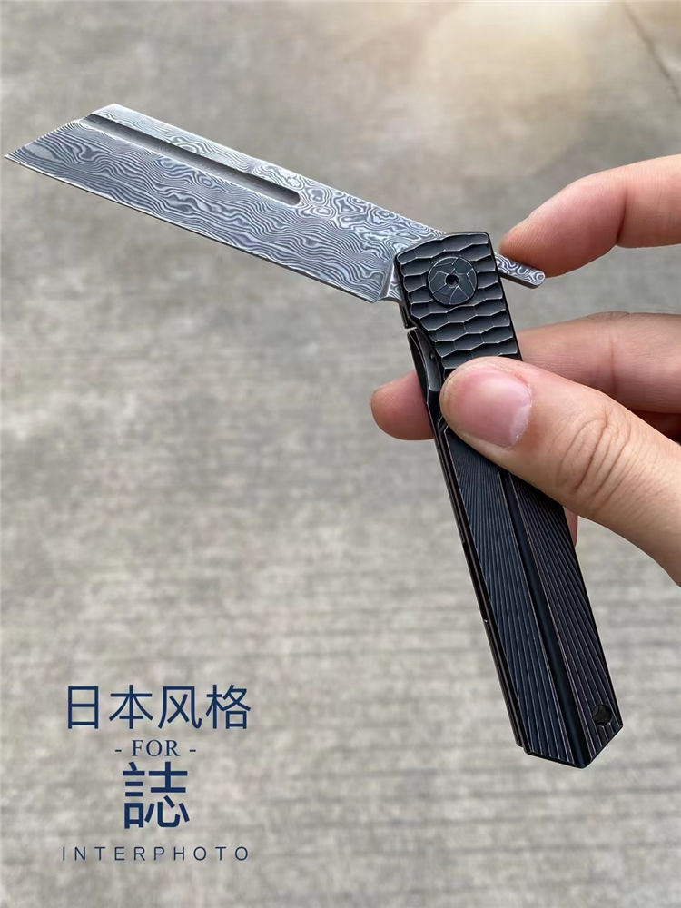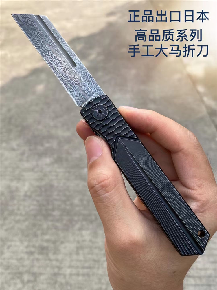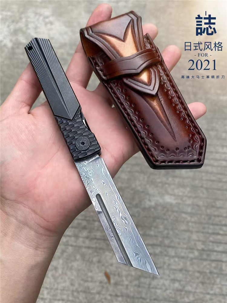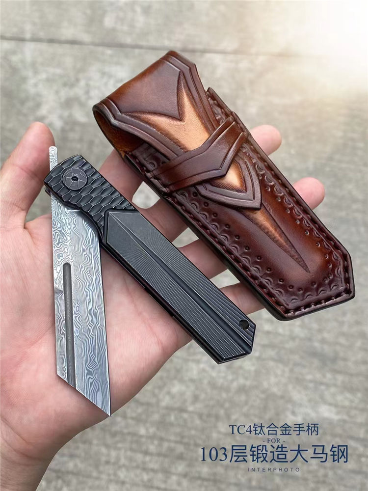 大马士革誌折刀 总长:19.6cm 刃长:7.3cm 刃宽:2.7cm 刃厚:3.5mm 重量:117g 钢材:日本公司提供锻造103层大马士革钢VG10 硬度:60-61HRC 柄材:TC4钛合金、表面CNC电脑加工 皮套:手工制作进口意大利植鞣雕花皮纯手工缝线染色 包装:手工盒包装
