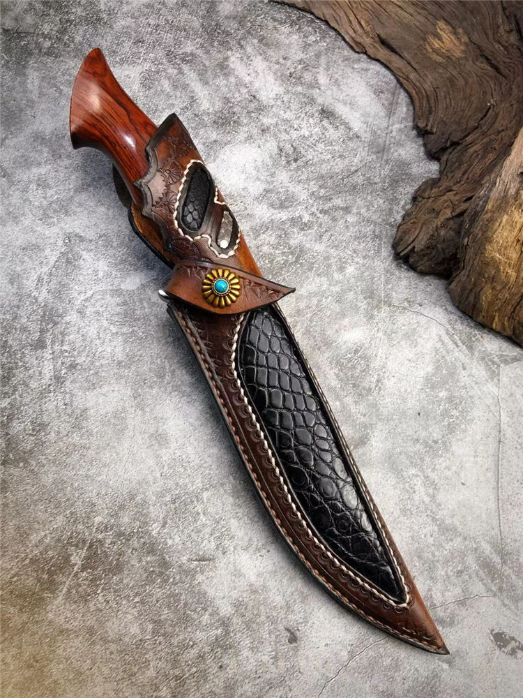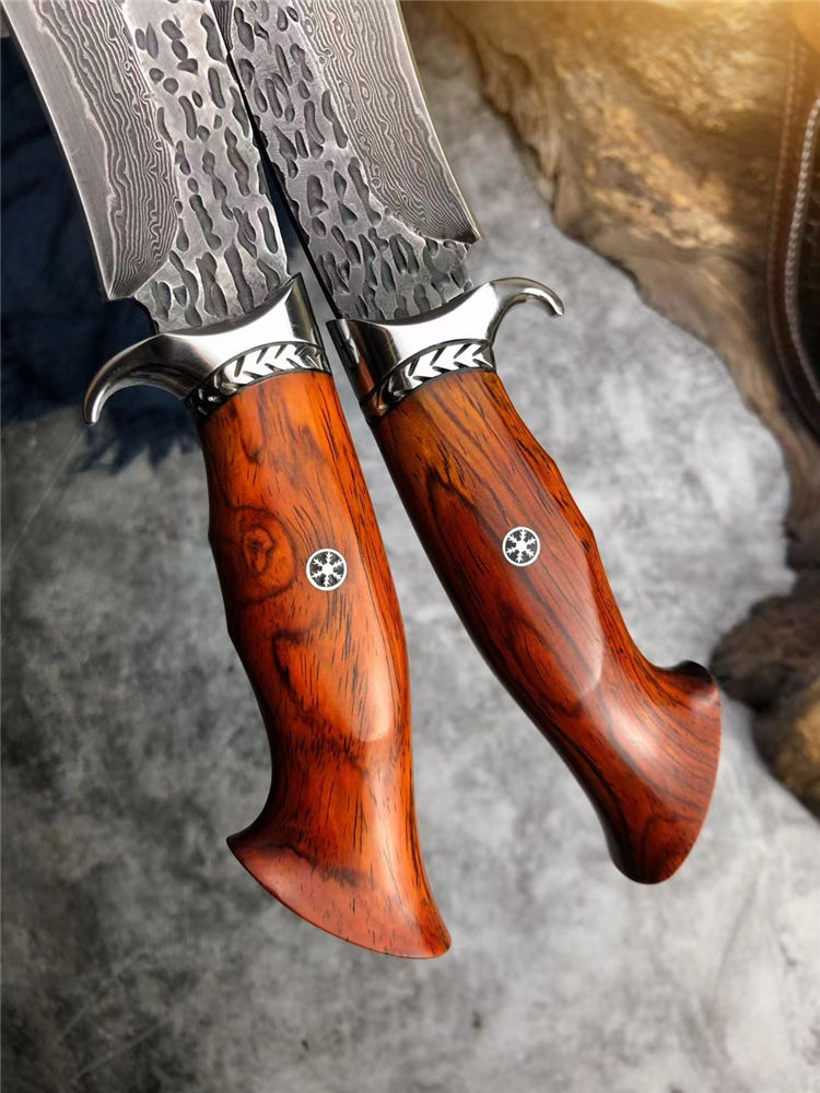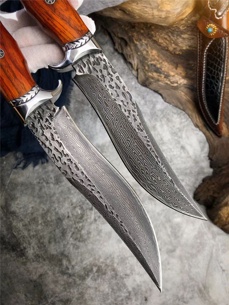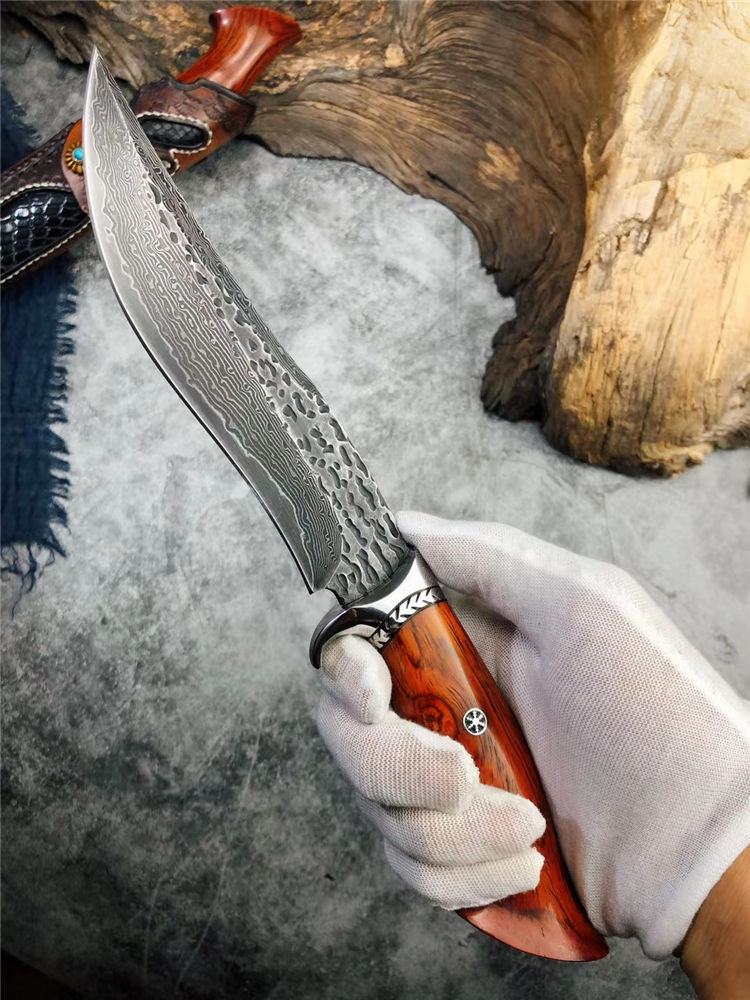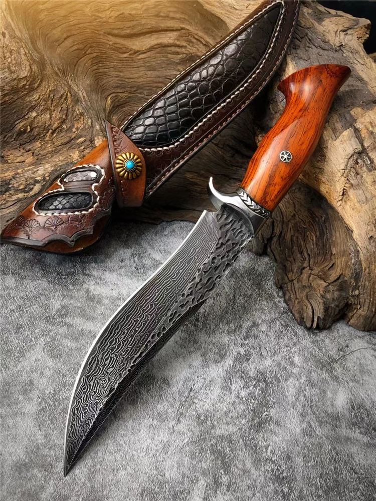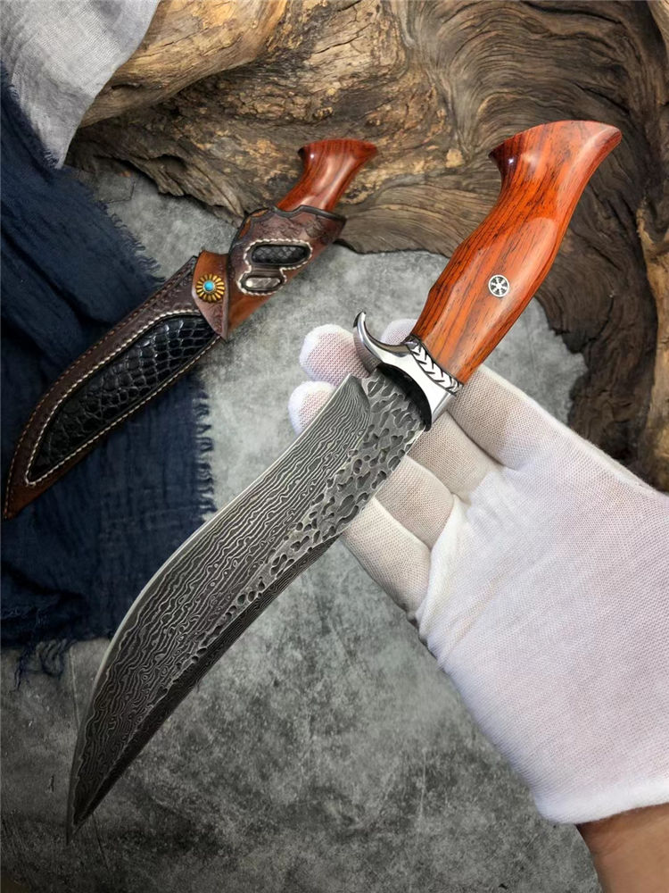 大马士革赤羽博弈直刀 总长:26.5cm 手柄:12cm 刃长:14.5cm 刃厚:4MM 刃材:进口锻造大马士革钢 硬度:60HRC 柄材:430不钢头+手工挫花钢隔片+进口老料黄檀木 包装:高端手工皮套+黑色礼盒