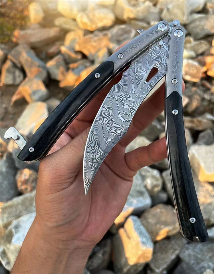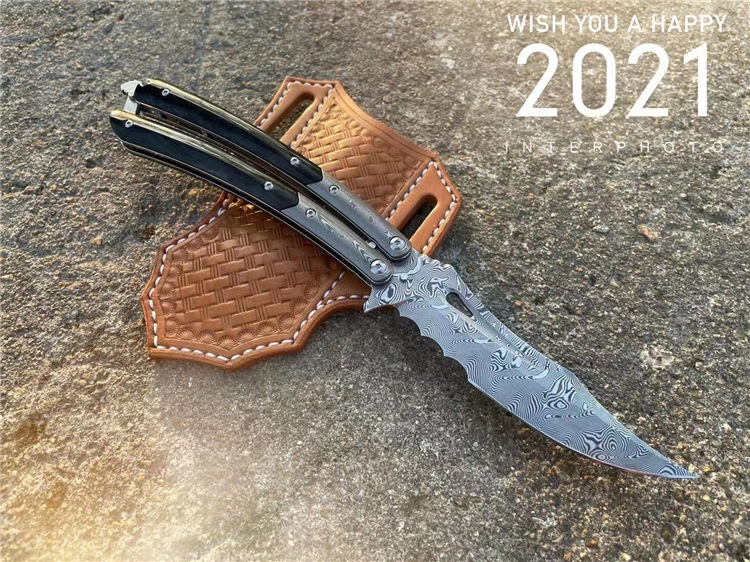 大马士革魅影蝴蝶甩刀 总长:25.5CM 刃长:10.5CM 刃厚:3MM 刃宽:2.5CM 重量:188g 钢材:进口手工锻造扭绞大马士革钢VG10钢,不带钢芯耐绣性好,花纹清晰 硬度:60-62HRC 热处理:真空深冷热处理,回火处理,保持韧性 研磨方式:数控单面磨CNC 开刃方式:手工水冷多次开刃 内部结构原理:进口轴承结构,电脑CNC成型 柄材:野生牛骨染色效果与大马士革钢 皮套:意大利进口手工制作雕花缝线真皮套 包装:手工盒子简包