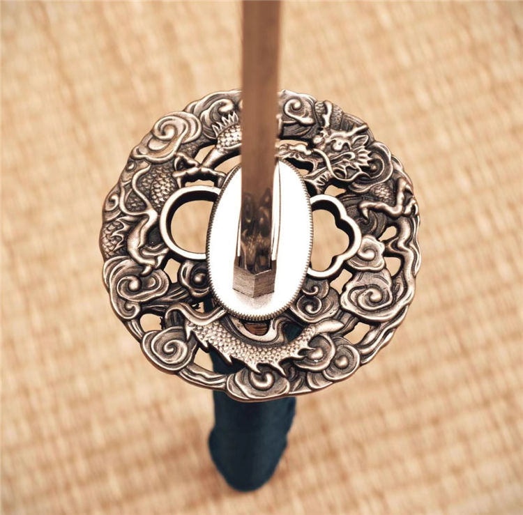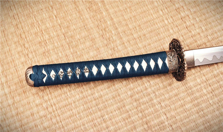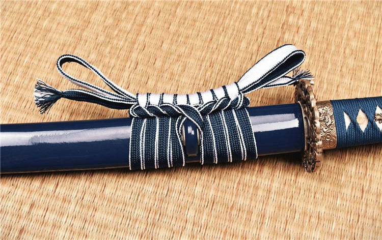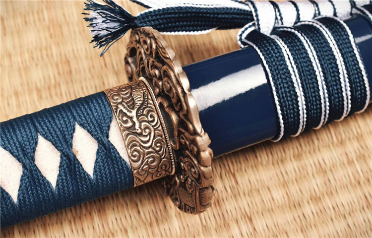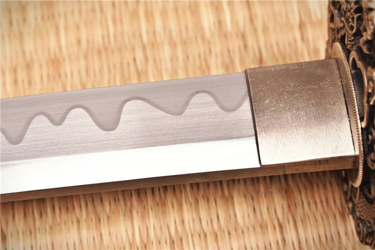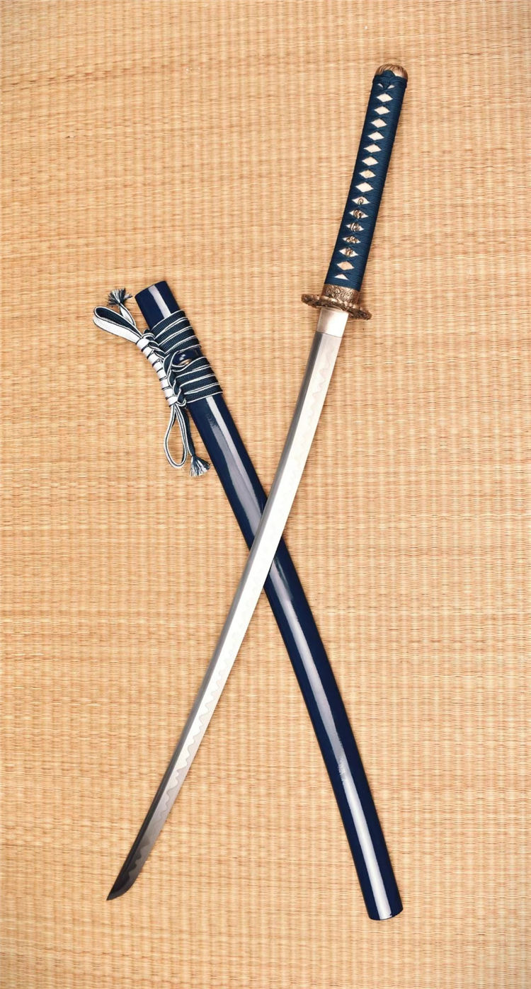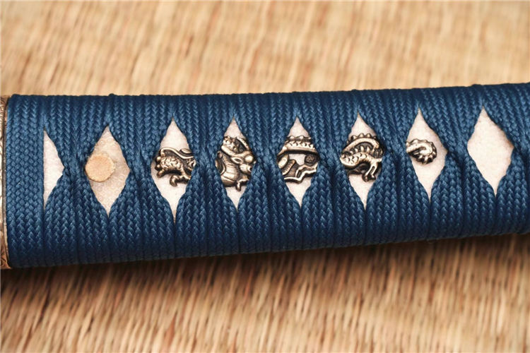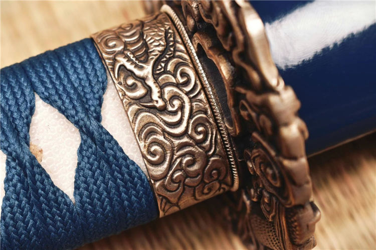 云龙武士刀 全长:103cm 刃长:71cm 刀鞘:实木上漆 刃材:高碳钢锻打 纯铜装具,刀柄实木包裹真鱼皮手工缠绳,化妆研磨