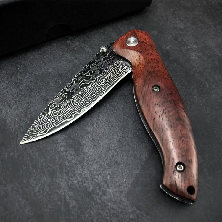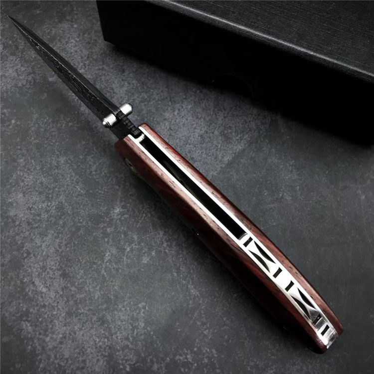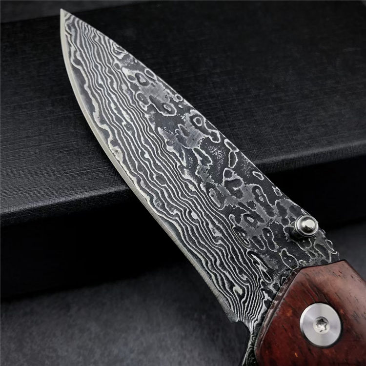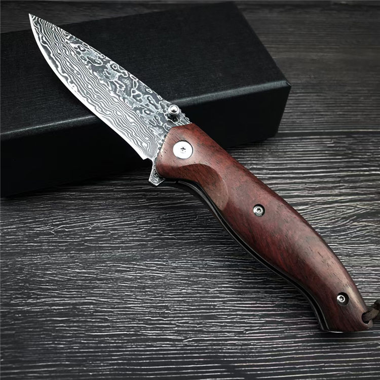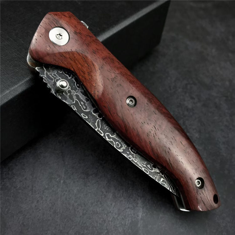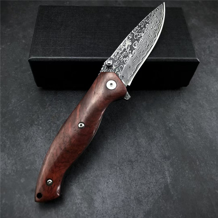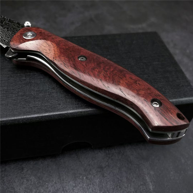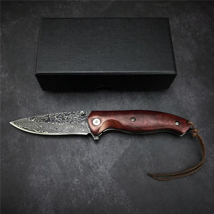 大马士革战鹰折刀 全长:19.3CM 刃长:8.3CM 刃宽:2.5CM 刃材:大马士革钢 硬度:58-60 刃厚:3MM 柄长:11CM 柄材:酸枝木 重量:171G