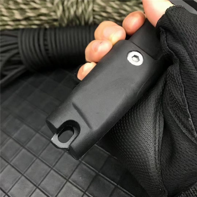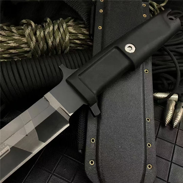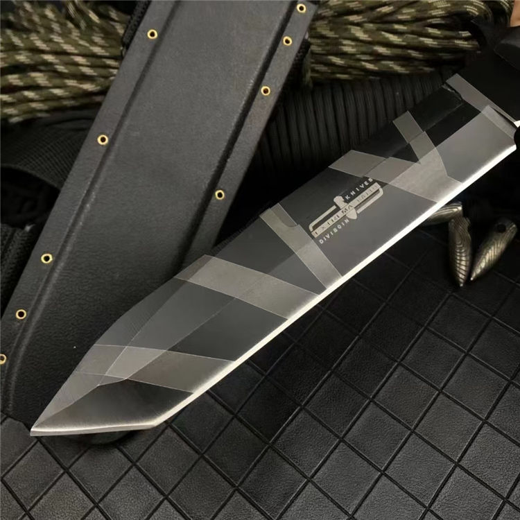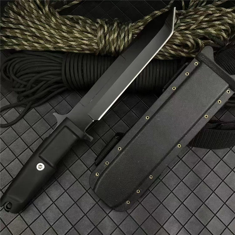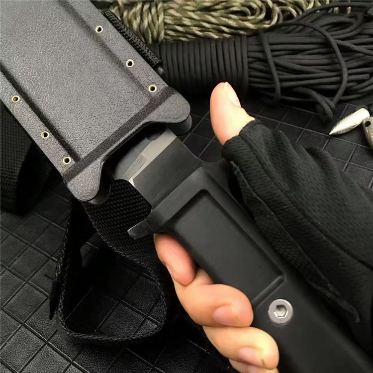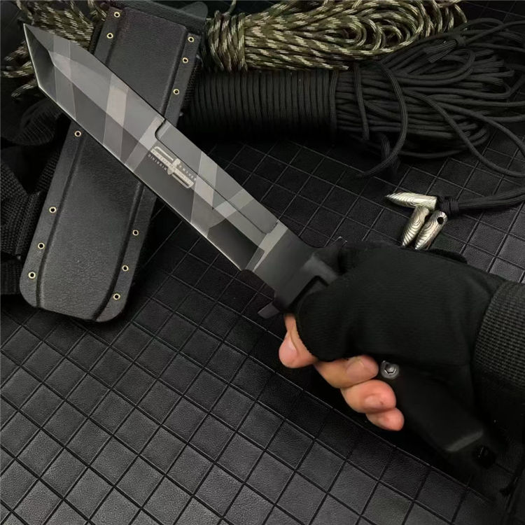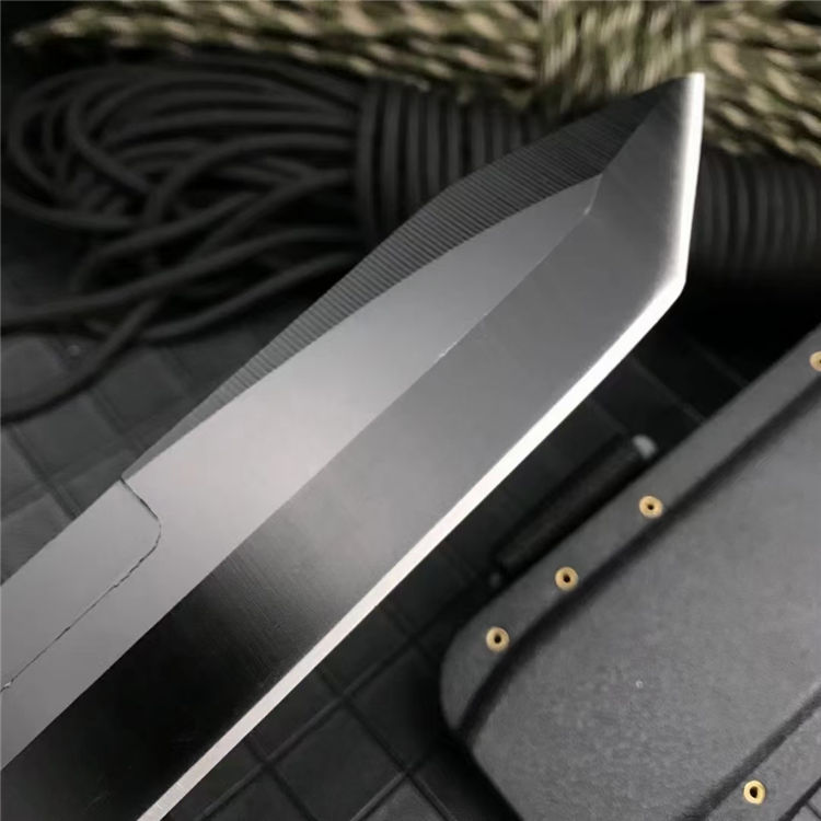 复刻RATIO极端武力直刀 全长:32.5CM 刃长:17.5CM 刃厚:0.5CM 刃宽:3.3CM 刀材:D2 硬度:58HRC 柄材:热塑性弹性橡胶 刀鞘:黑色K鞘 重量:365克 备注:黄色纸盒