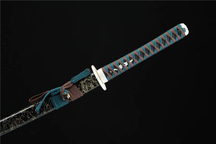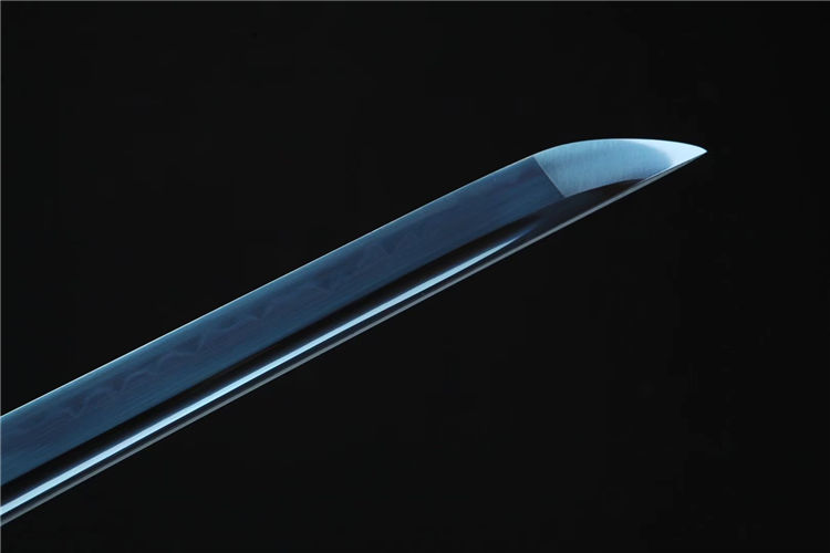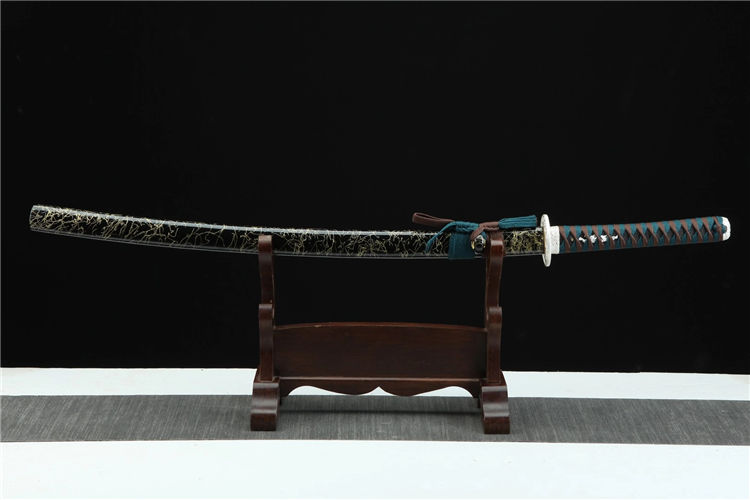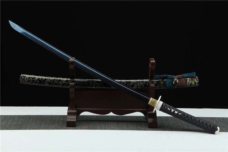 琉璃武士刀 总长:103cm 刃长:71cm 柄长:27cm 刃宽:3.2cm 配置:锦盒 刃材:特殊钢 工艺:覆土烧刃,高温烤蓝 鞘材:黑色拉丝鞘 刀柄:仿鱼皮(可拆卸) 装具:合金镀银