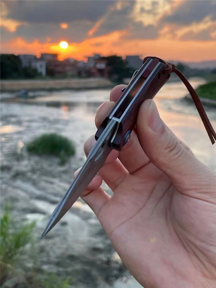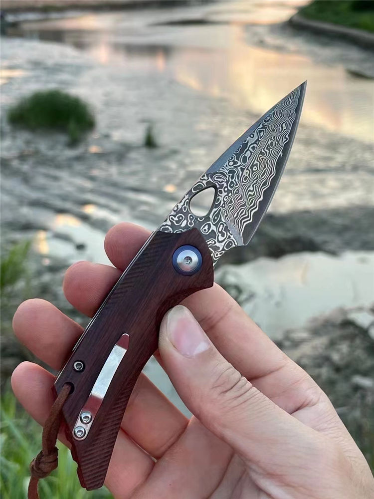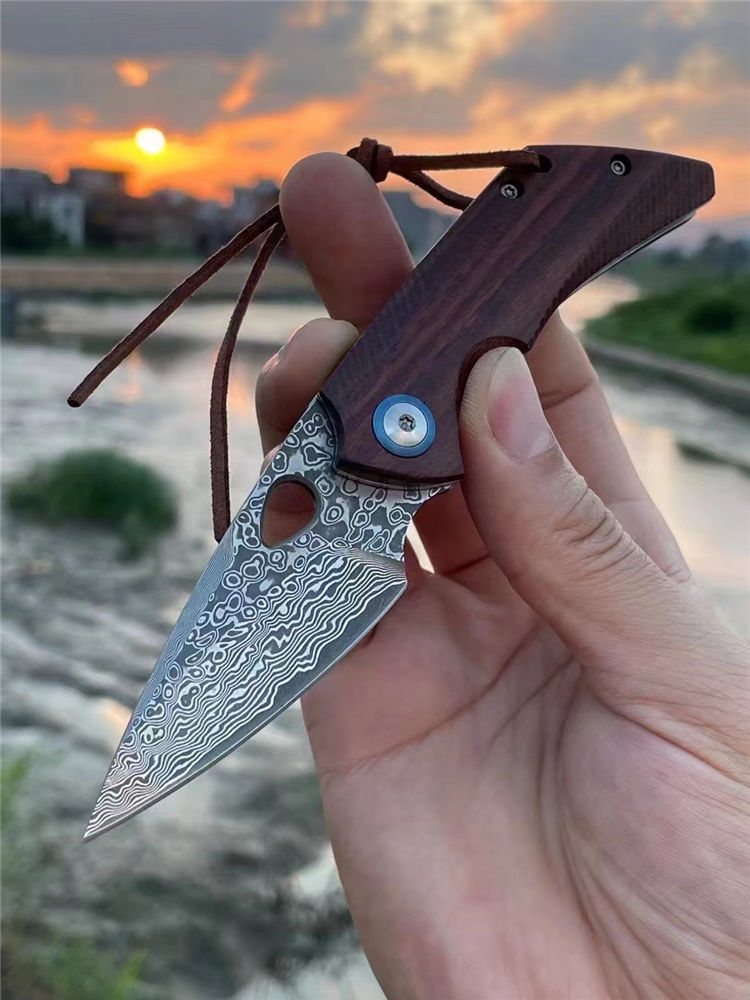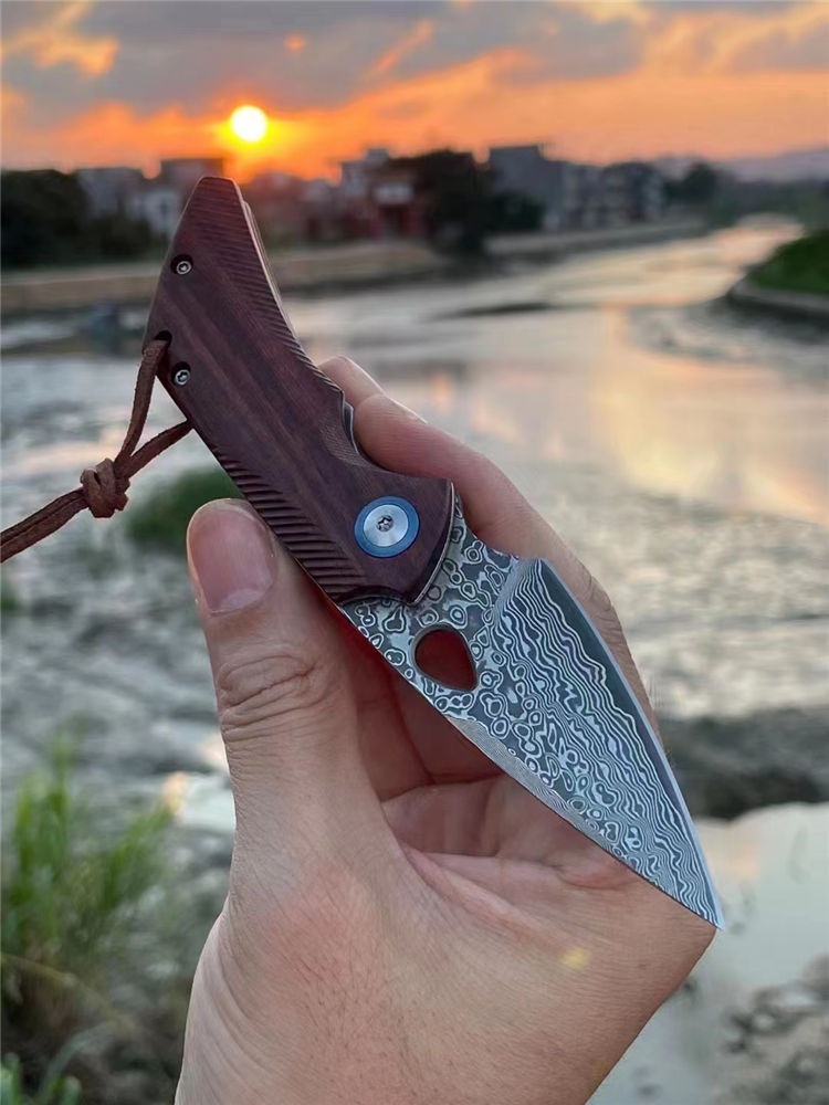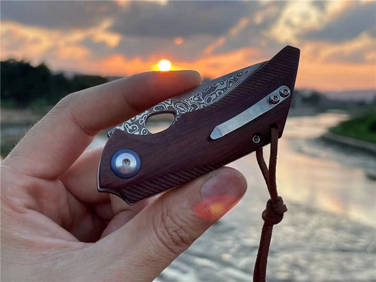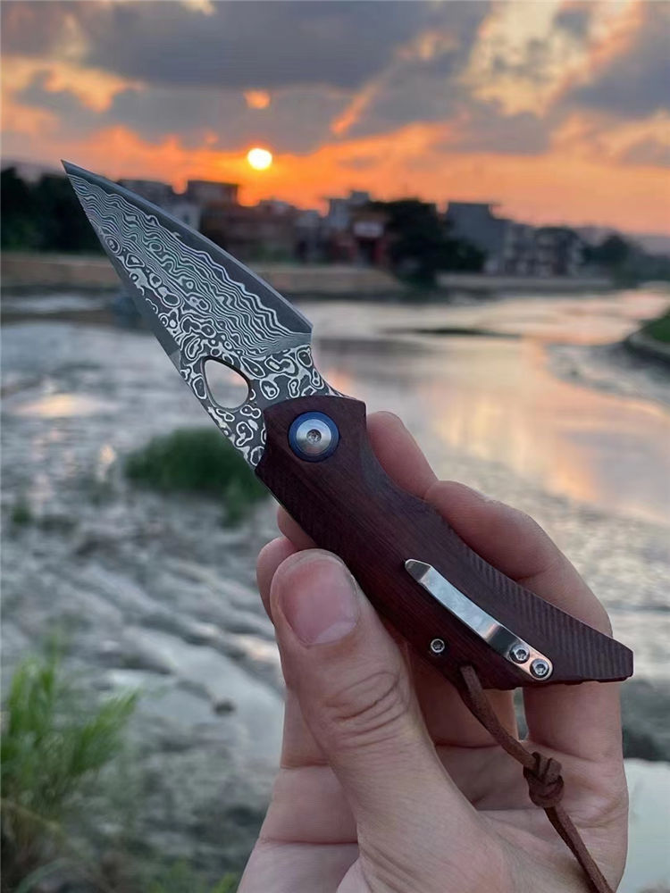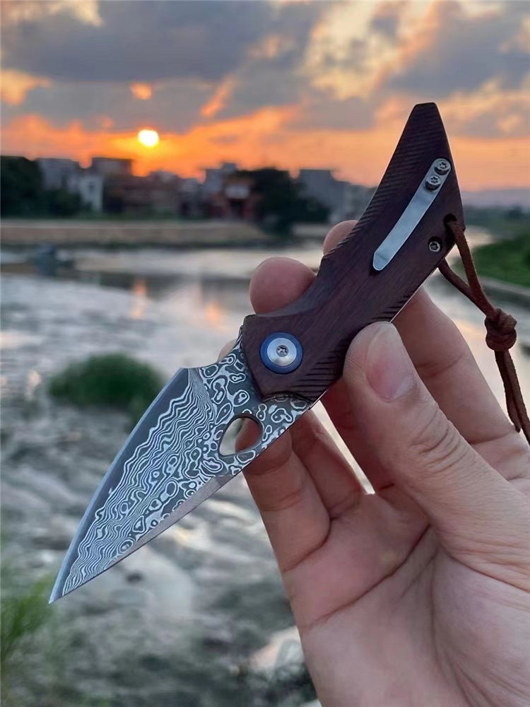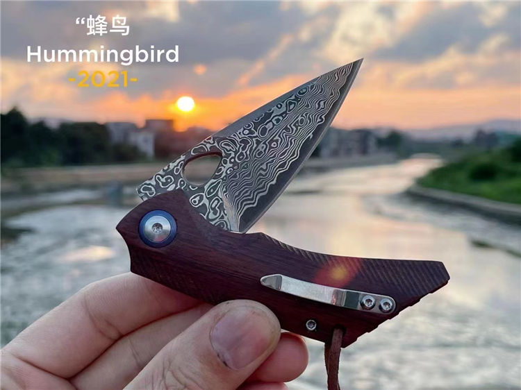 大马士革蜂鸟折刀 总长:15.6CM 刃长:6MM 刃厚:3.5MM 刃宽:3CM 钢材:67层锻造VG10夹层大马士革钢 硬度:60-62HRC ,真空热处理 重量:78g 柄材:印度红酸枝木 包装:手工盒子包装内带EVA内衬