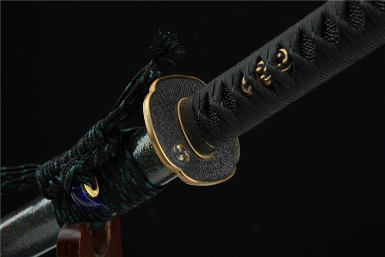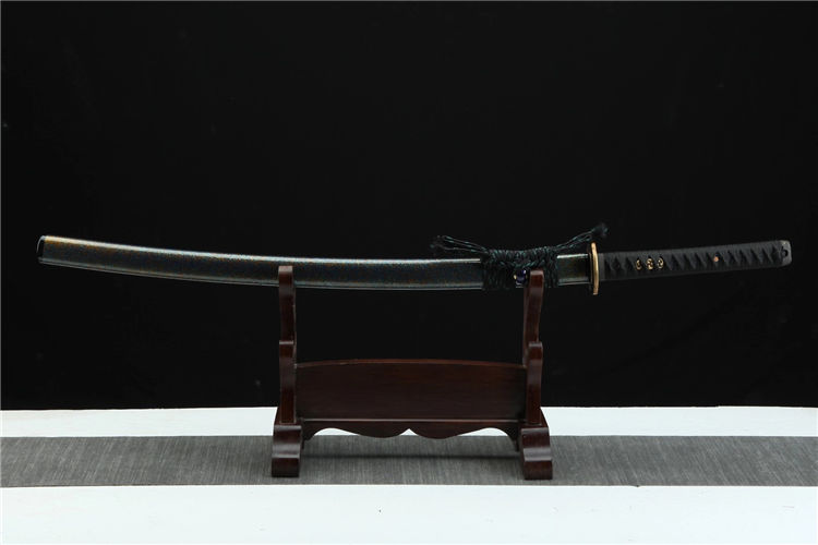 独霸武士刀 总长:103cm 刃长:71cm 柄长:27cm 刃宽:3.2cm 手柄:真鱼皮 刃材:1095 装具:纯铜 刀鞘:高端金梨鞘,鞘口是黑色牛角 配置:高端锦盒/油/布 工艺:覆土烧刃,手工推磨,因为刃纹独特,纹路清晰,所以每把刃纹做不到一模一样