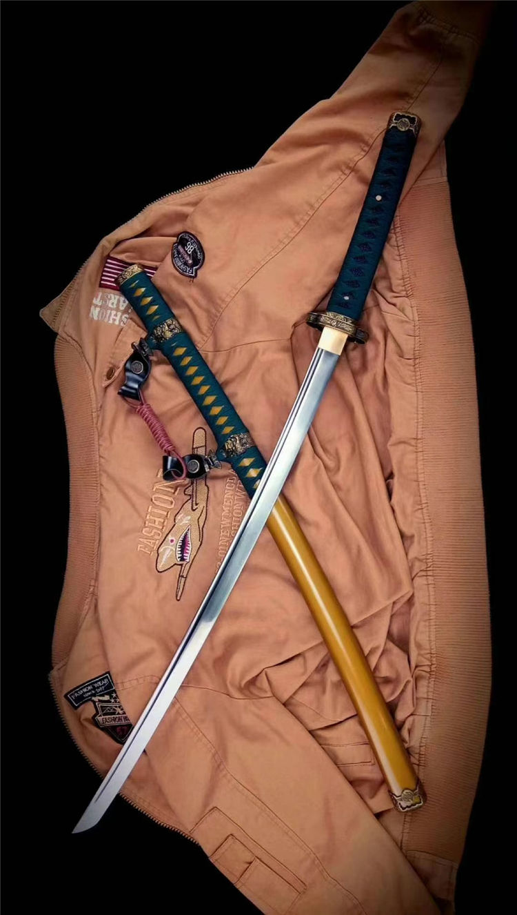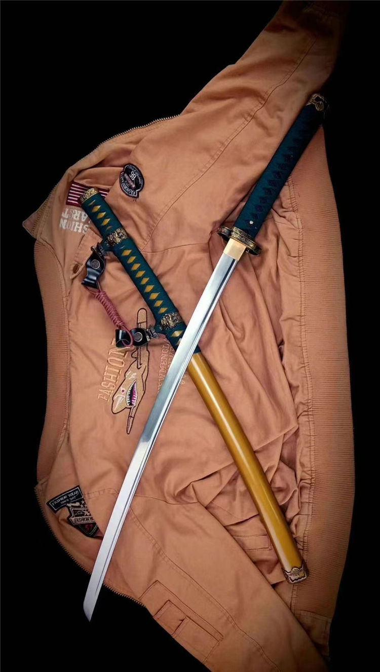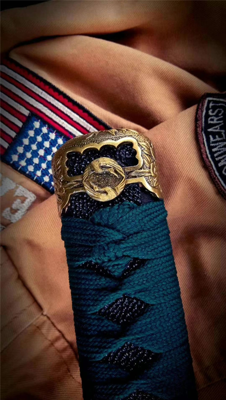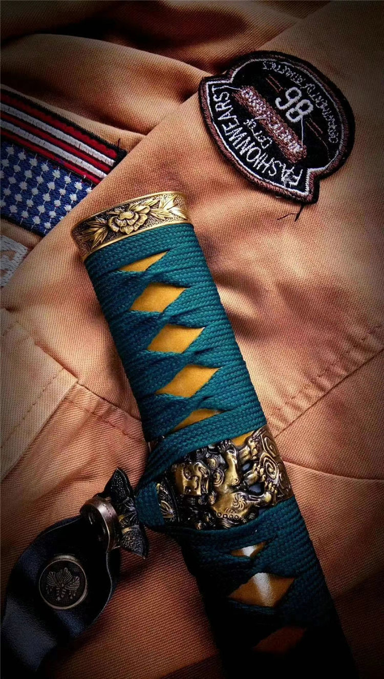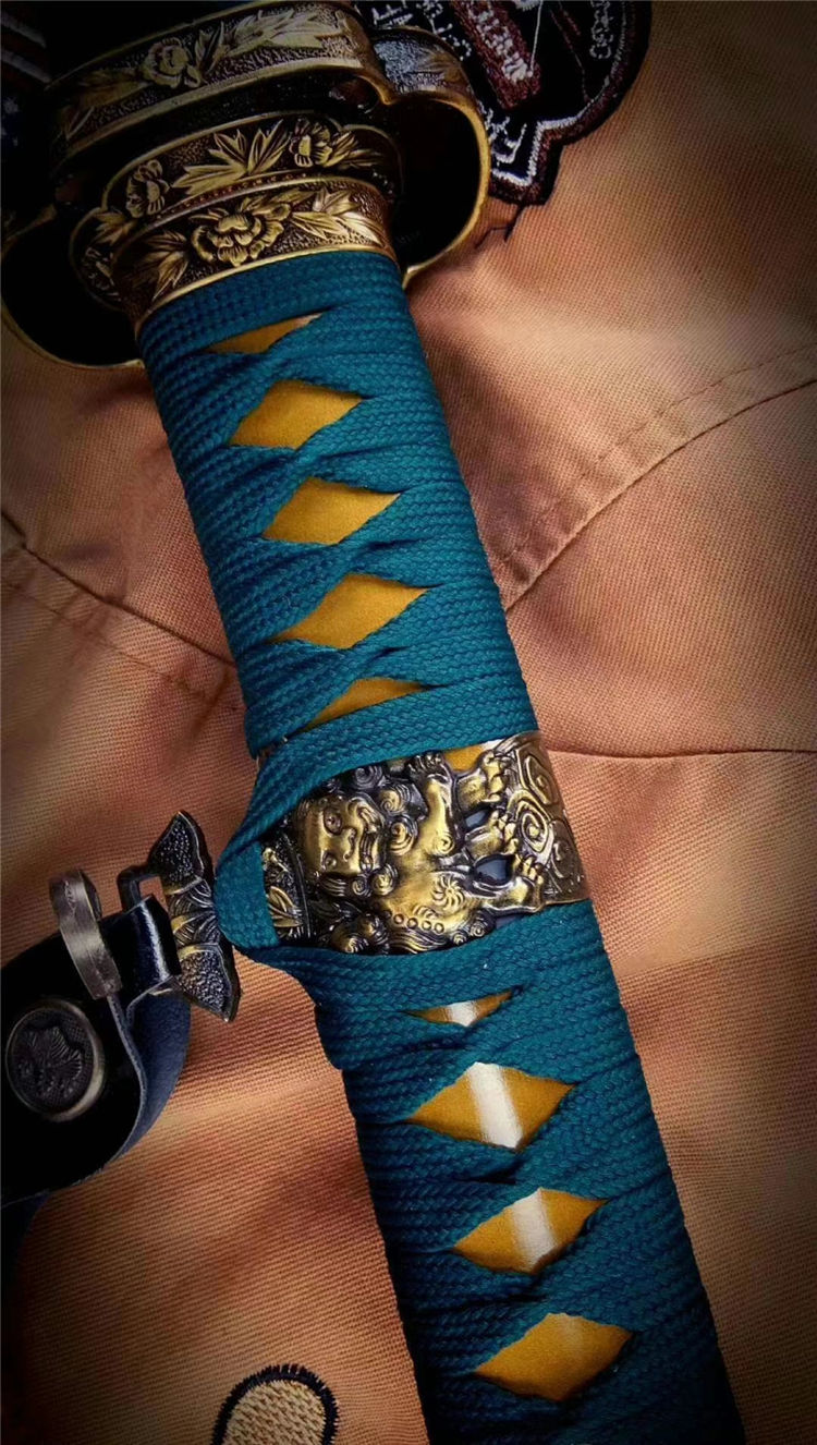 双狮武士太刀 全长:103cm 刃长:72cm 柄长:27cm 刃宽:3.2cm 刃厚:0.7cm 材质:5160钢锻打 专业淬火研磨,刀柄为实木缠绳,鞘实木上漆,装具为雕刻双狮牡丹纹饰