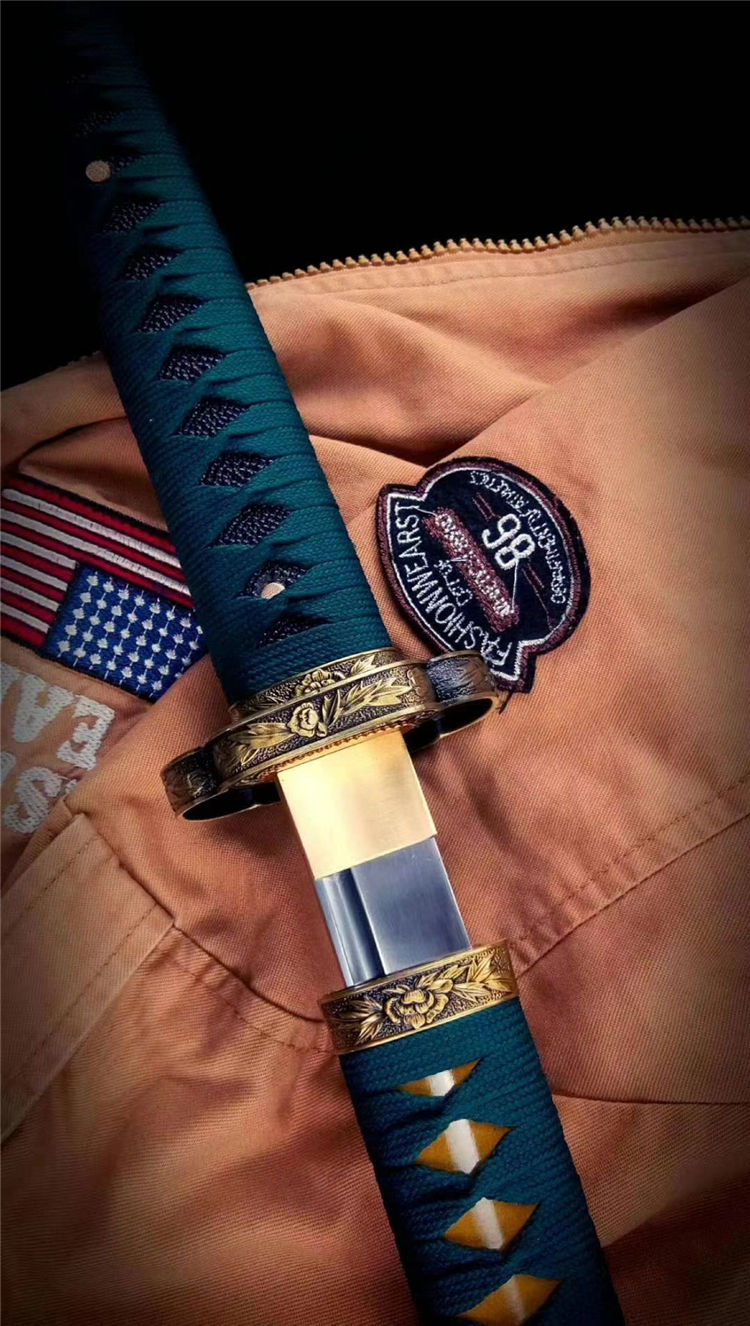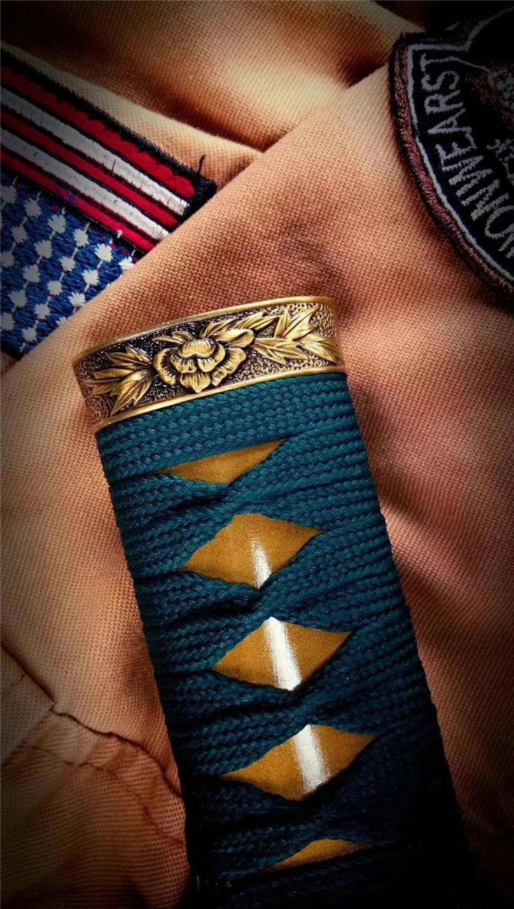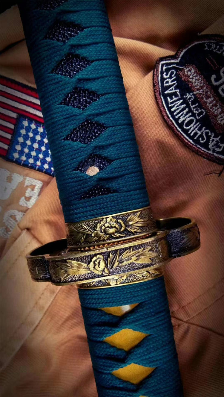 专业淬火研磨,刀柄为实木缠绳,鞘实木上漆,装具为雕刻双狮牡丹纹饰