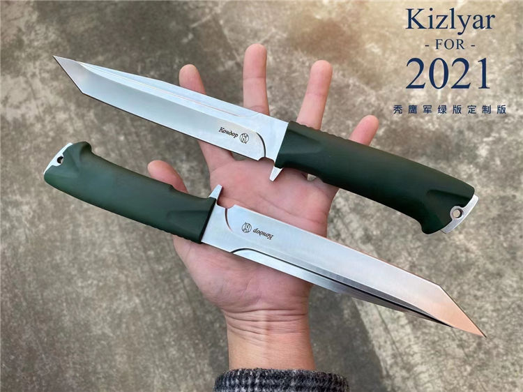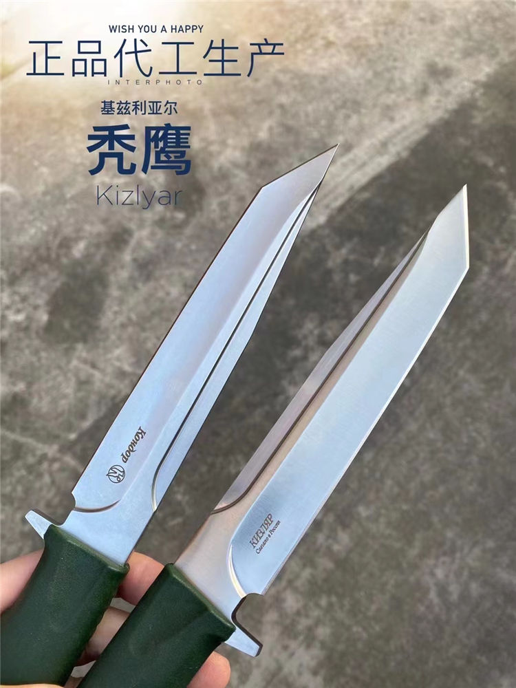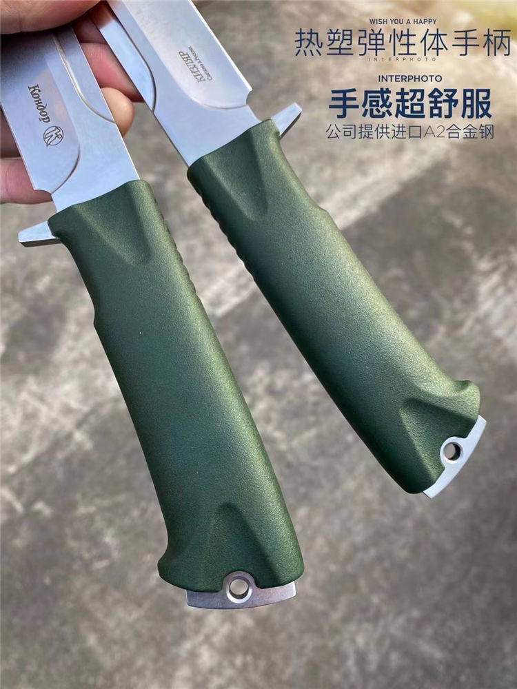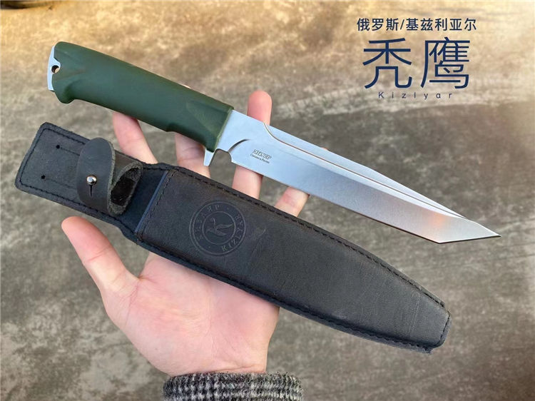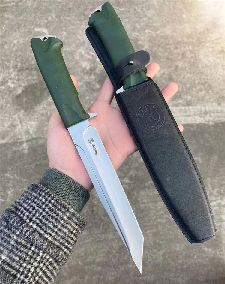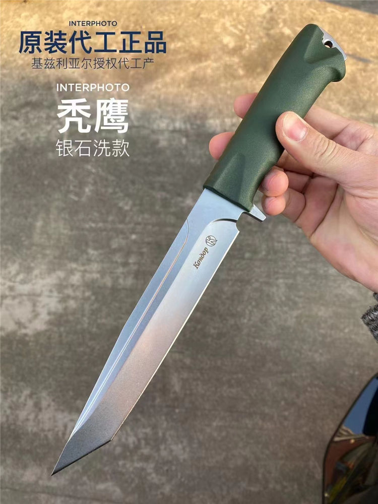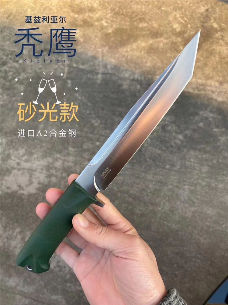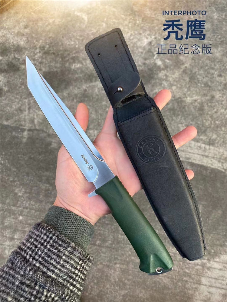 俄罗斯绿柄秃鹰直刀 总长:310mm 刃长:180mm 刃厚:4.8mm 刃宽:30mm 钢材:进口A2钢 硬度:60-61HRC 重量:298克含鞘398g 产地:俄罗斯授权中国地区代工OEM 皮套:皮套+ABS固定塑料鞘外包真皮+迷彩套