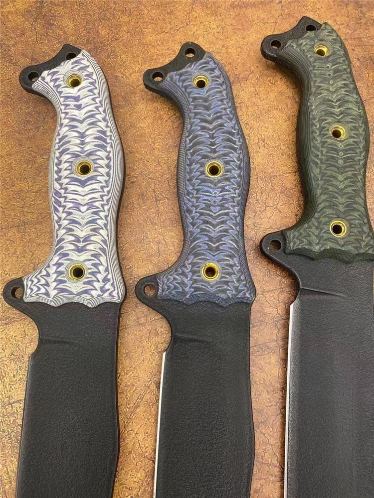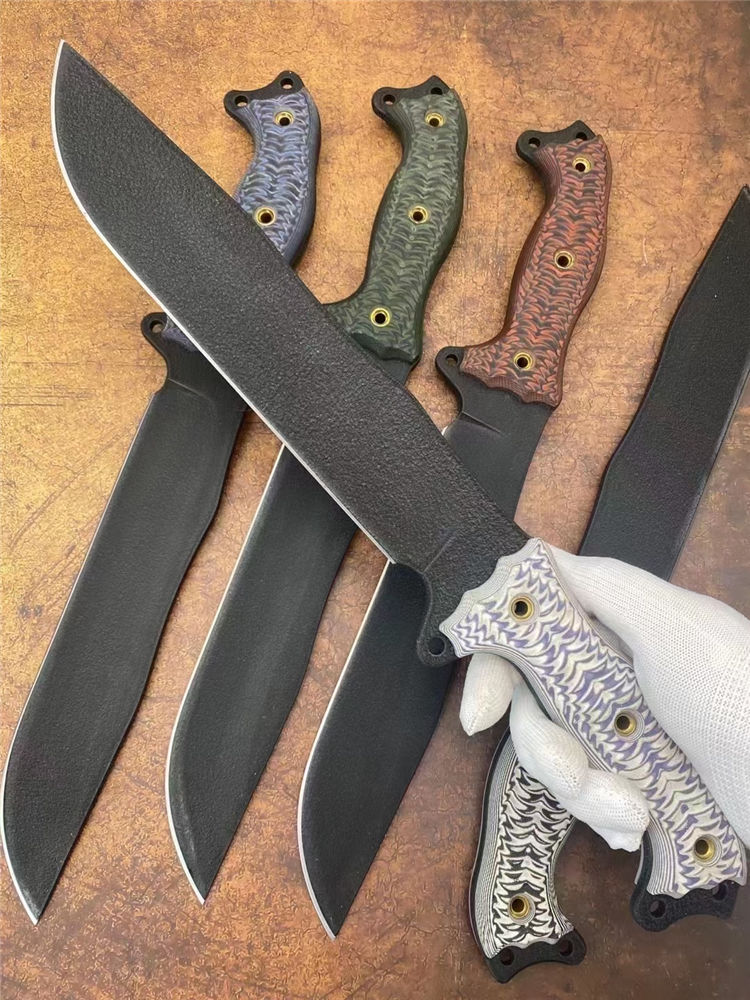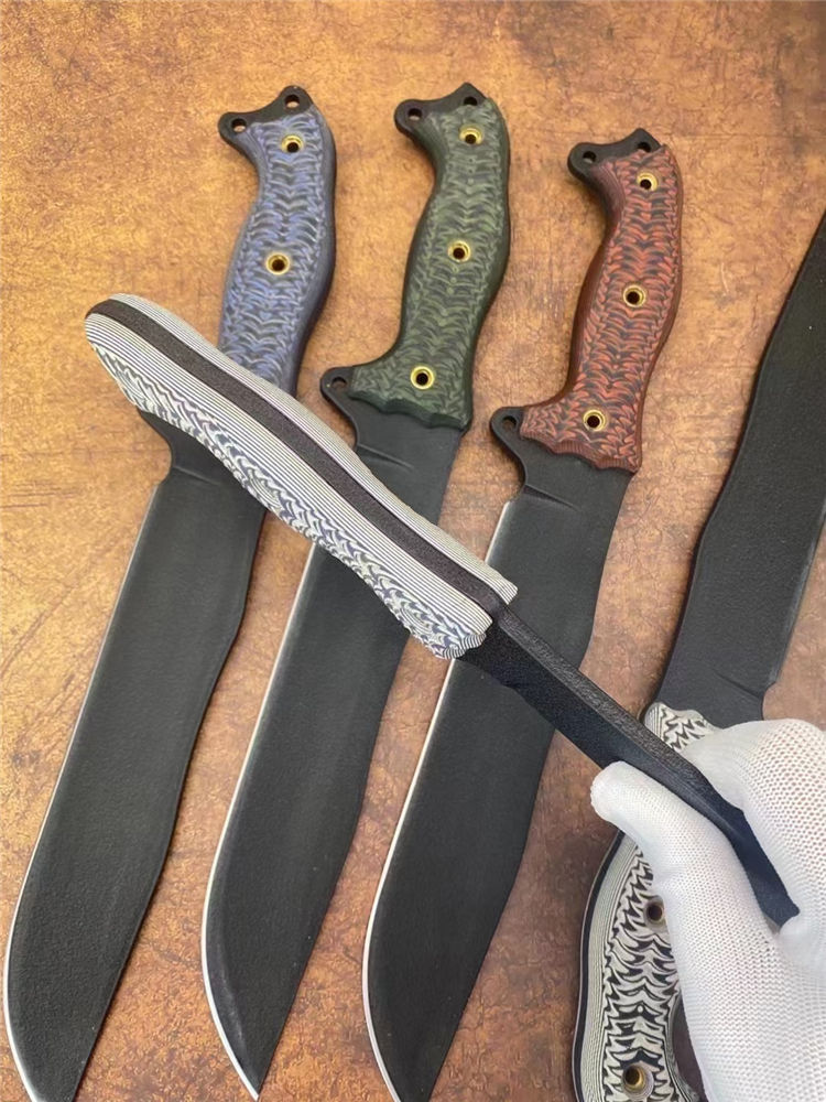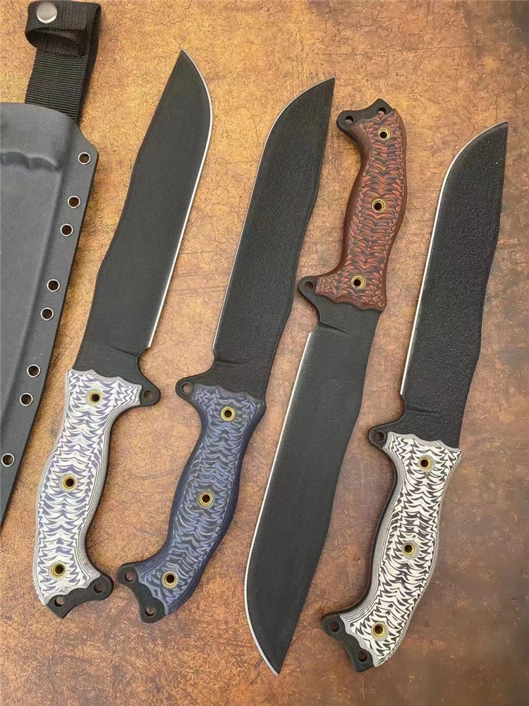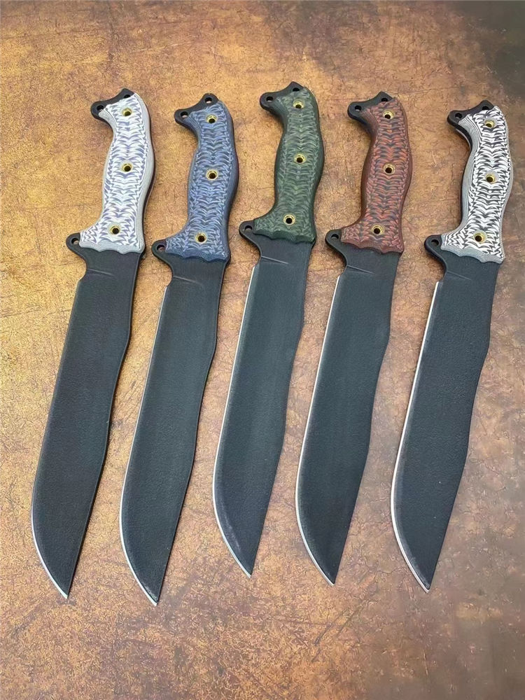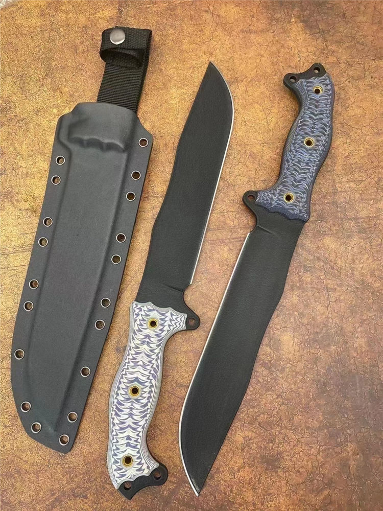 巴斯魔甲战术直刀 全长:41cm 刃长:25cm 柄长:15cm 刃厚:5.1mm 刃宽:4.6cm(最宽处) 刃材:1095美国高碳钢 硬度:59-60HRC 刀重:686克净重 表面:防锈涂层 柄材:G10 刀鞘:进口K鞘