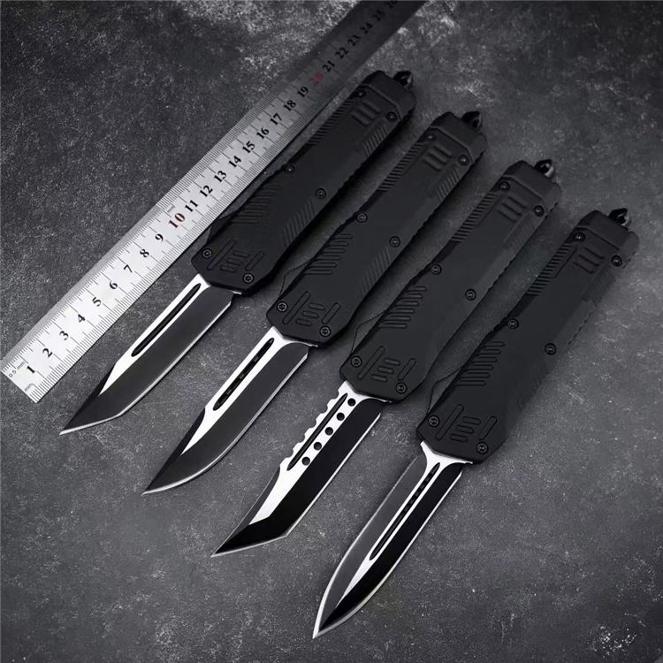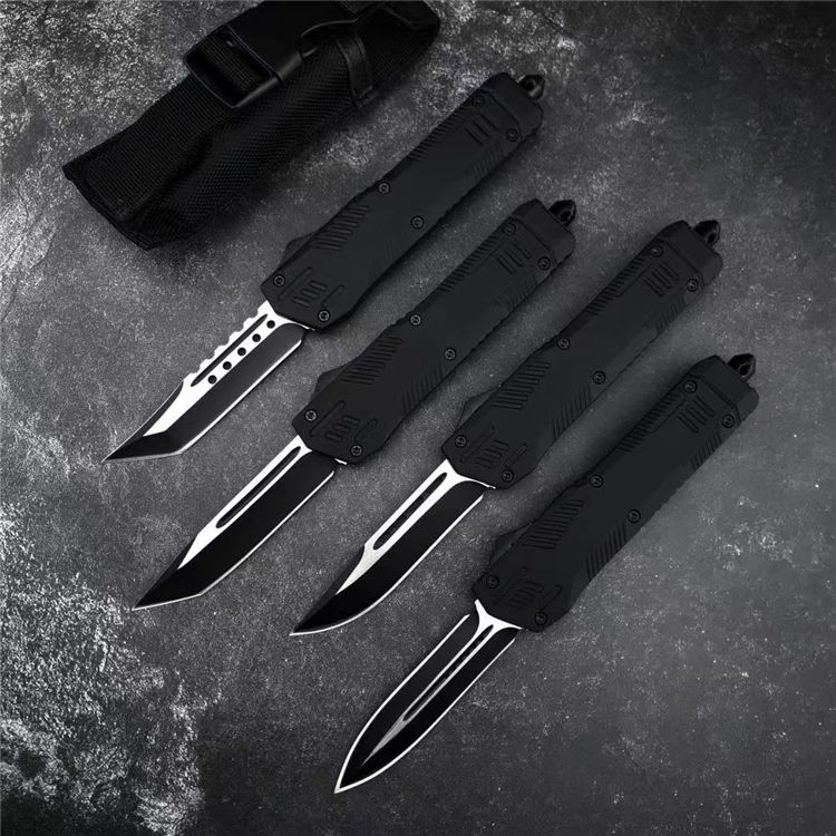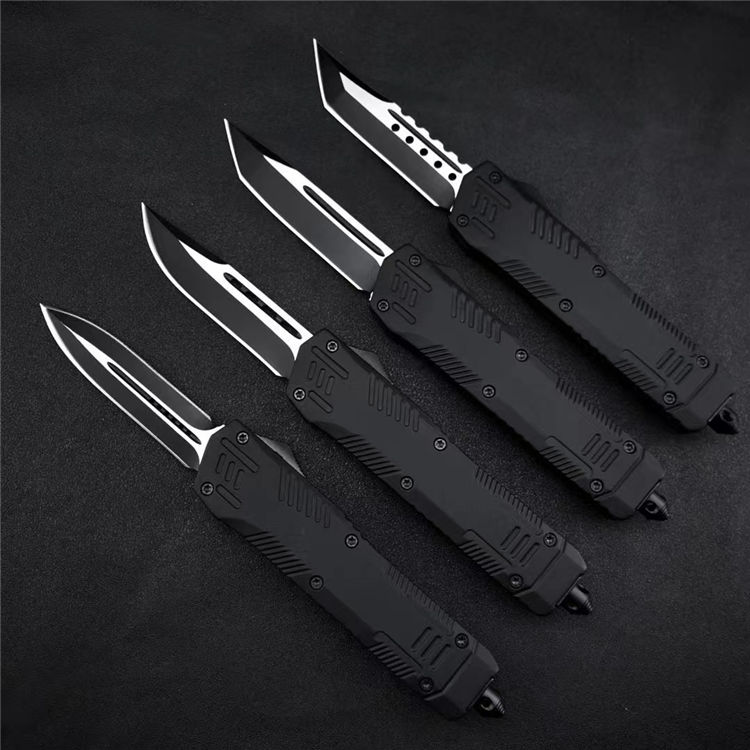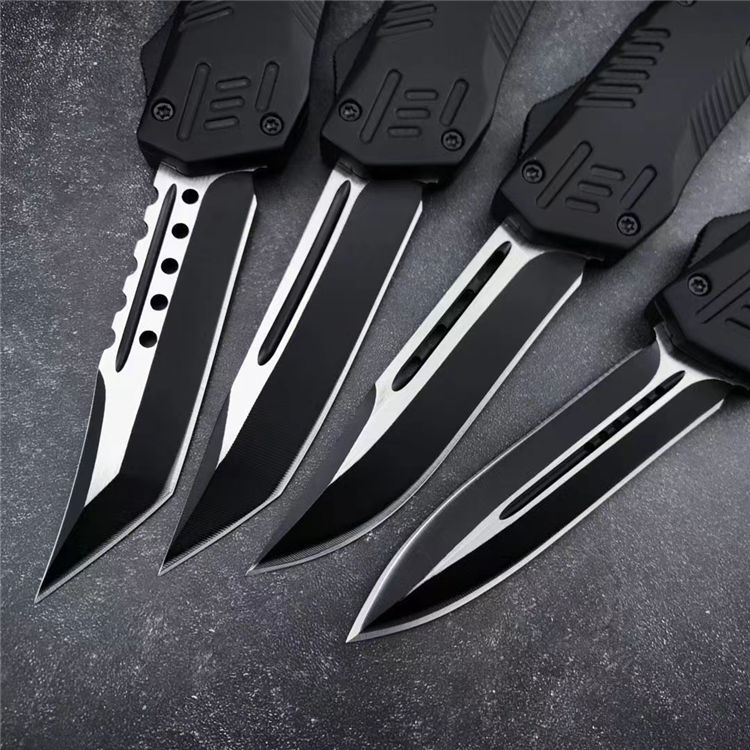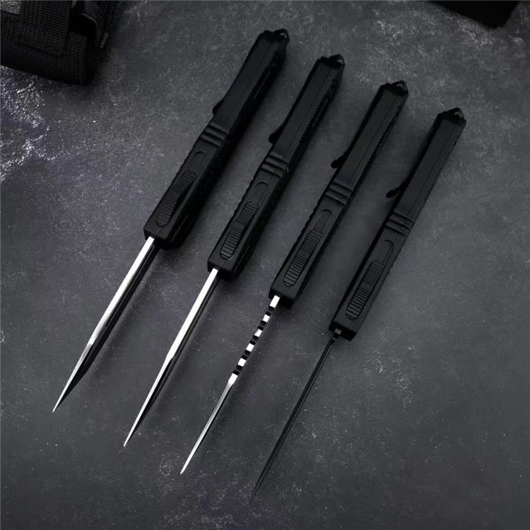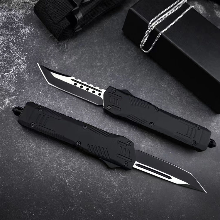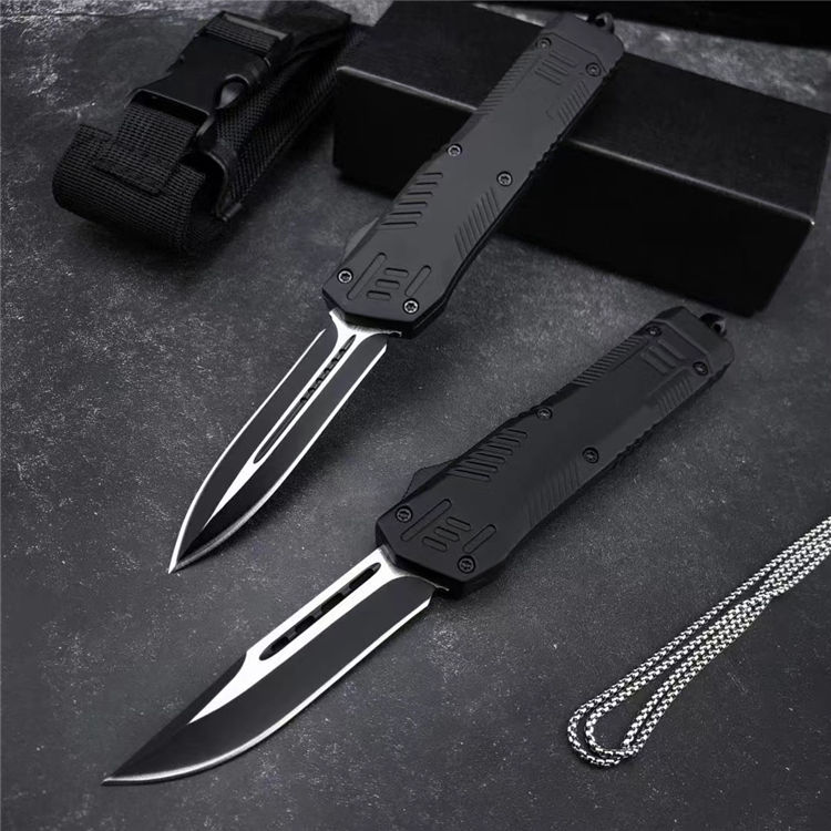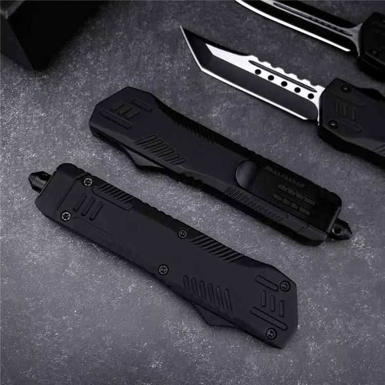 黑熊直出跳刀 全长:22.6CM 刃长:8.6CM 刃宽:2CM 刃材:440C 硬度:58 刃厚:3MM 柄长:14CM 柄材:锌合金 重量:334G 刀鞘:尼龙套