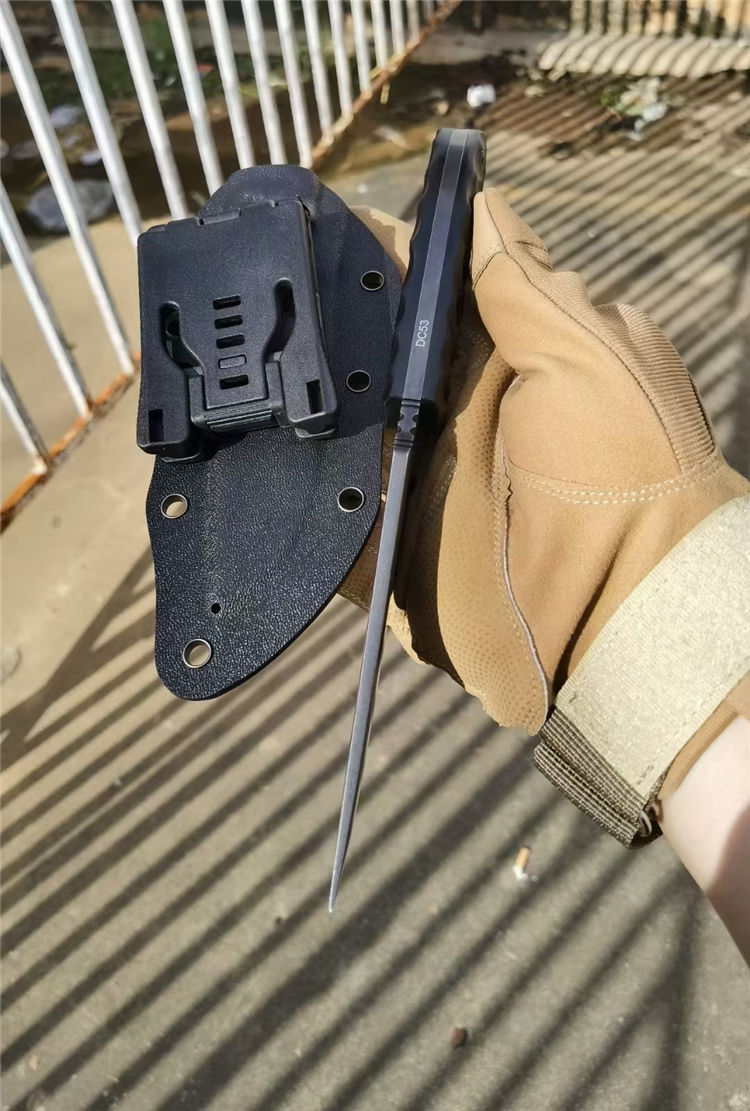 华匠坊DC53温克勒直刀 全长:230mm 刃长:120mm 柄长:110mm 厚度:4.8mm 材质:DC53 硬度:60度 真空热处理,g10柄刻大石坑纹。手感舒适,经久耐用手柄减重,沧桑黑色刀条防锈兼顾美感,是一款经典的猎刀生存型小直