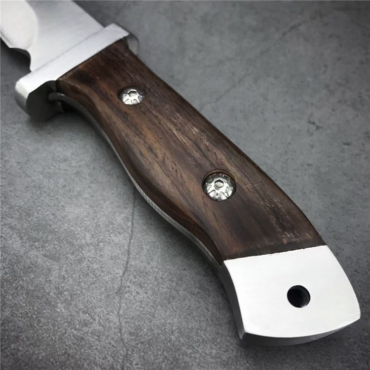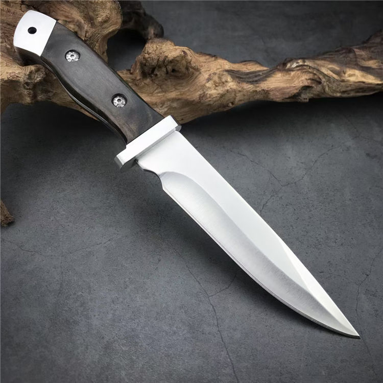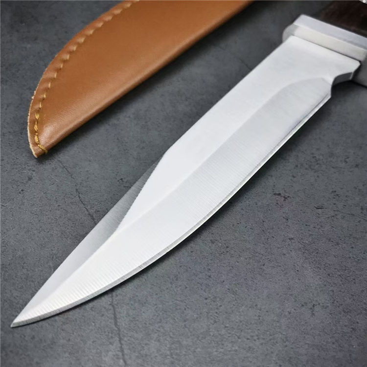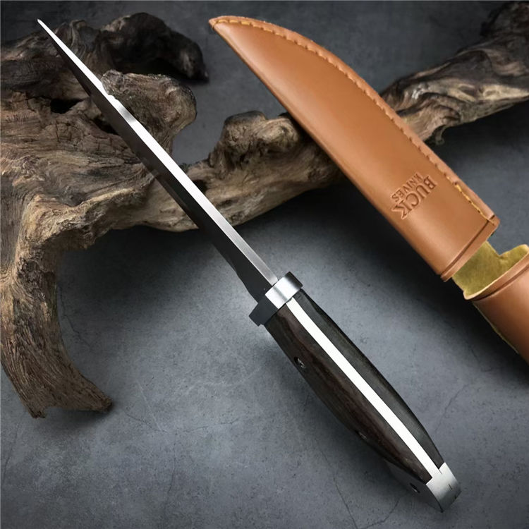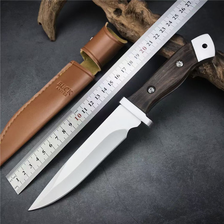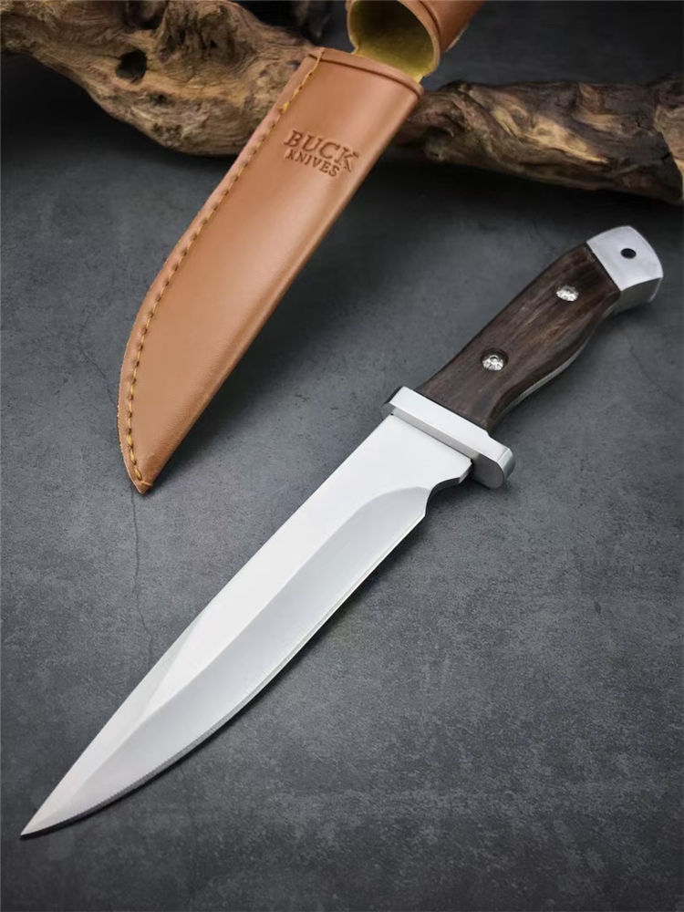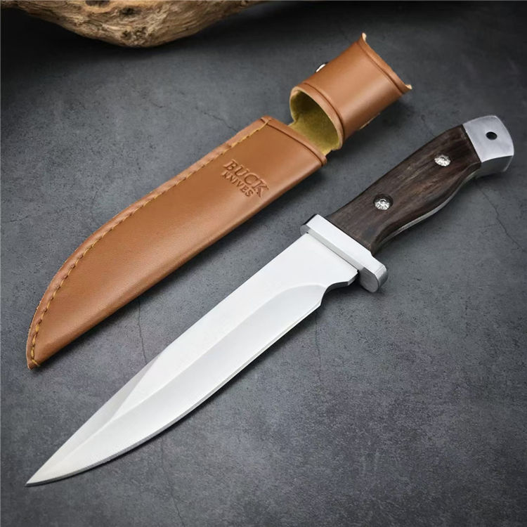 巴克2008无槽直刀 全长:25CM 刃长:14.2CM 刃材:5CR13MOV 硬度:57 刃宽:2.8CM 刃厚:4MM 柄长:10.8CM 柄材:花梨木 重量:252G 刀鞘:PU皮鞘