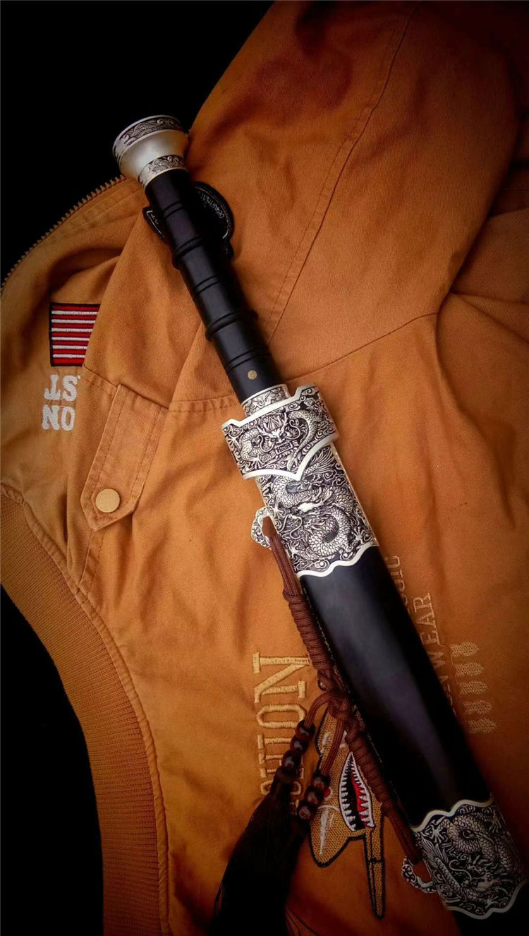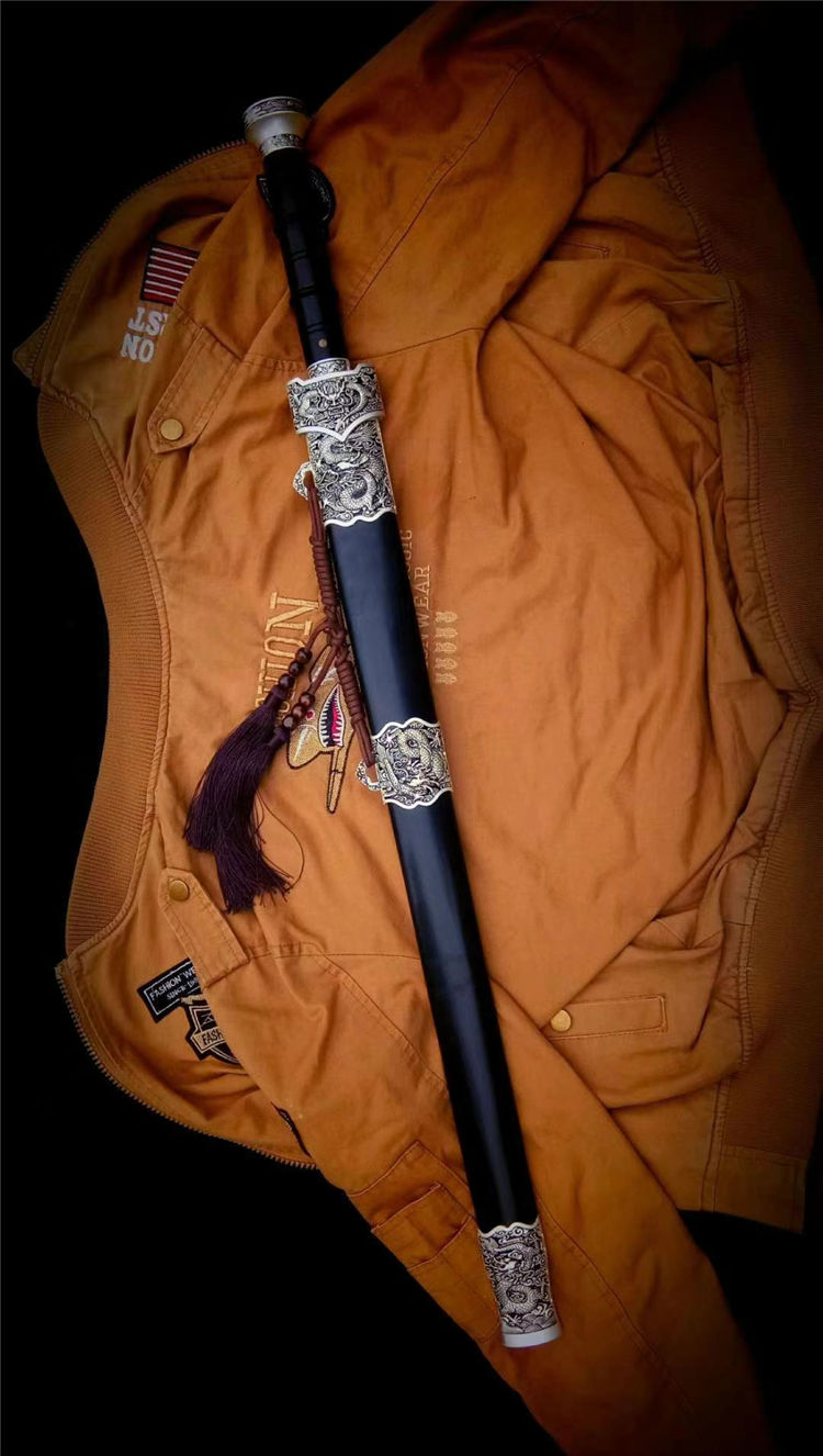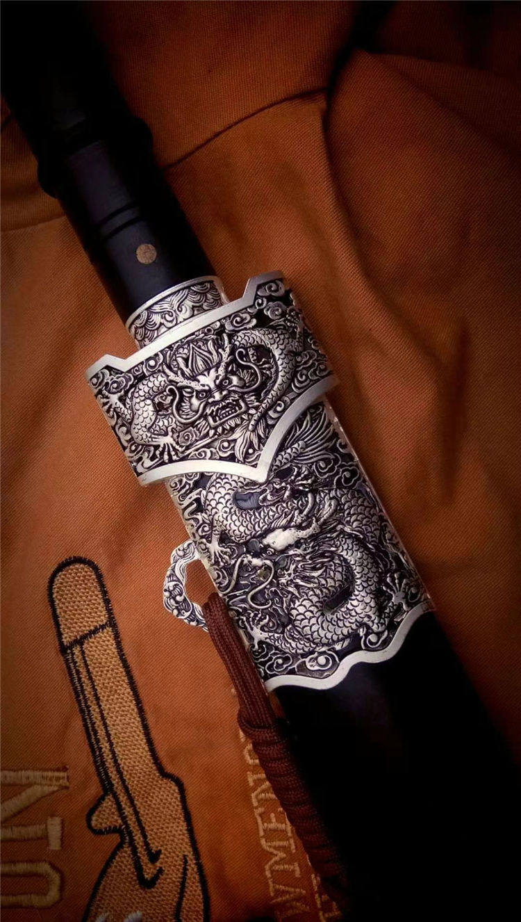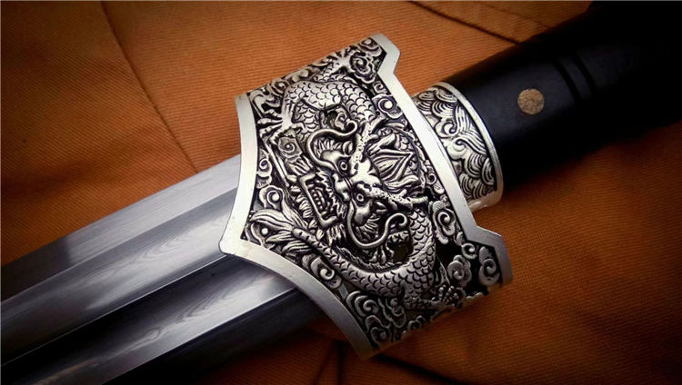 剑身材质为折叠锻打百炼花纹钢,手工开槽,研磨,锻打纹路行云流水,非常清晰,剑鞘为非洲进口一级乌木,人工制鞘,配饰为雕刻龙纹装具