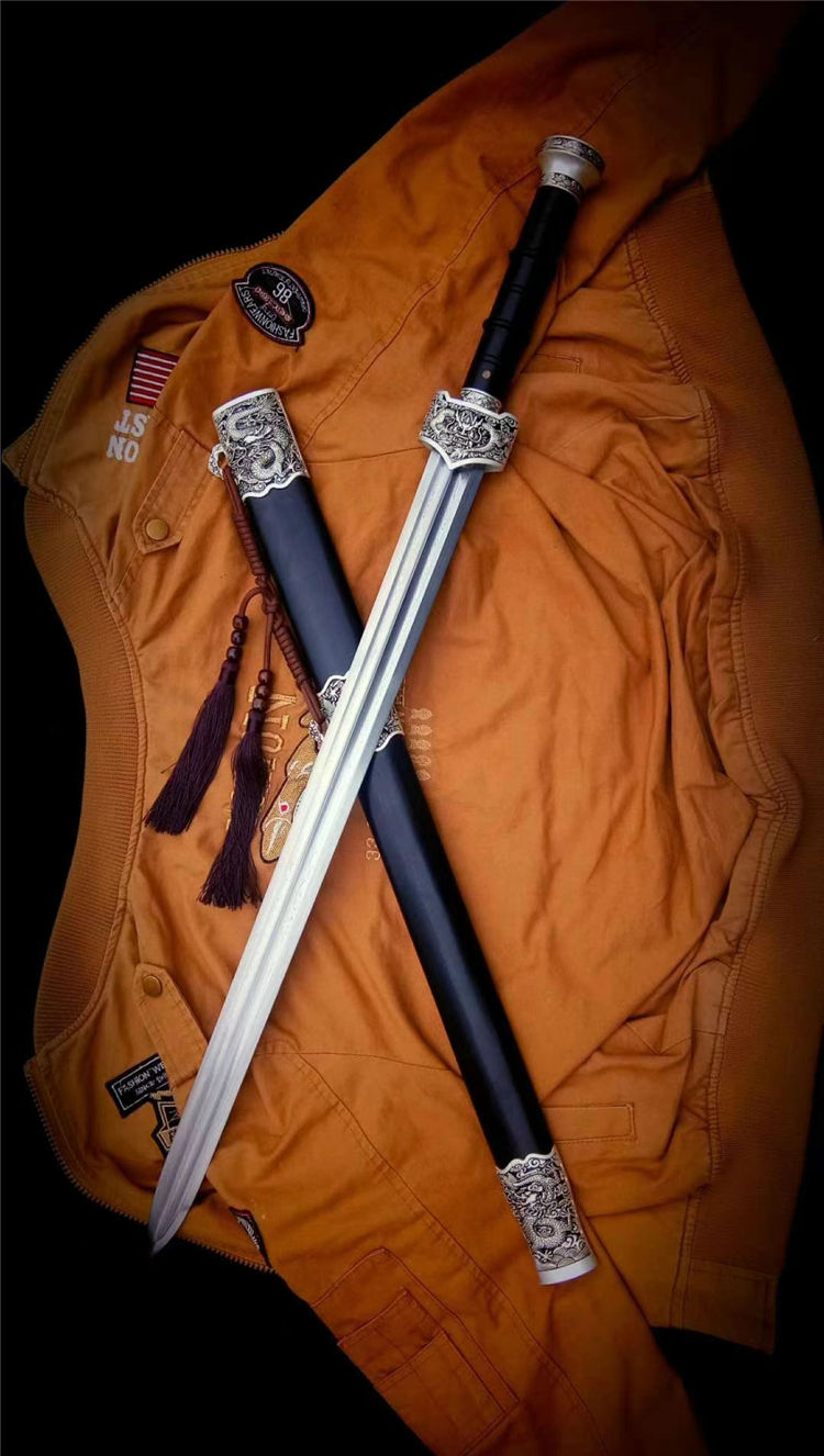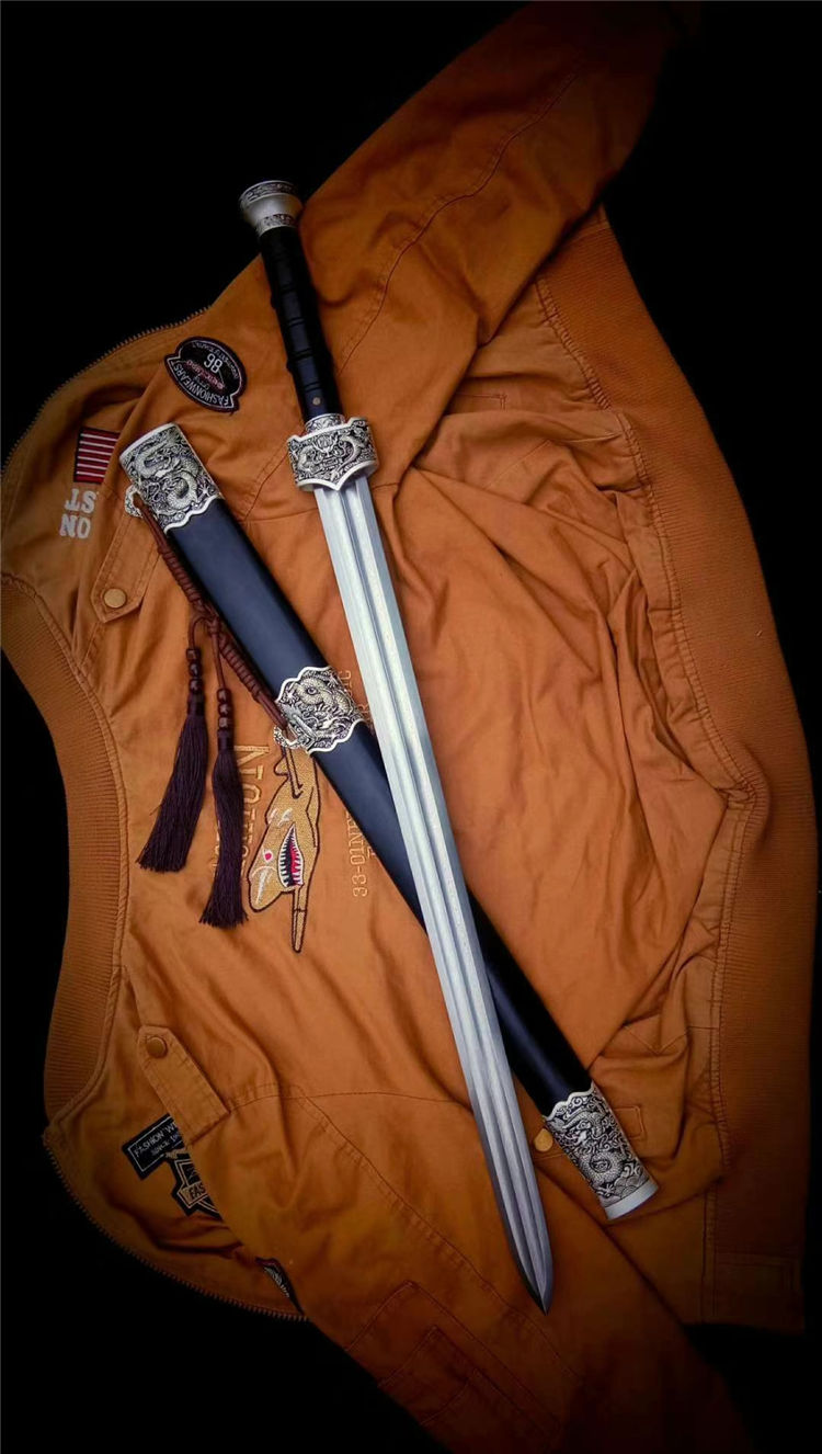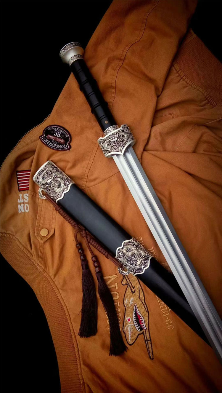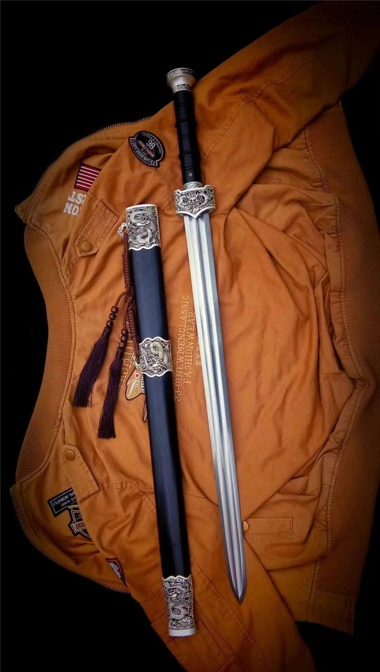 剑身材质为折叠锻打百炼花纹钢,手工开槽,研磨,锻打纹路行云流水,非常清晰,剑鞘为非洲进口一级乌木,人工制鞘,配饰为雕刻龙纹装具