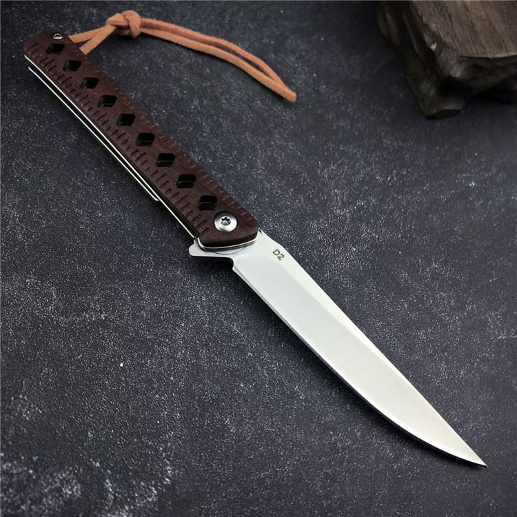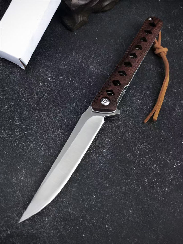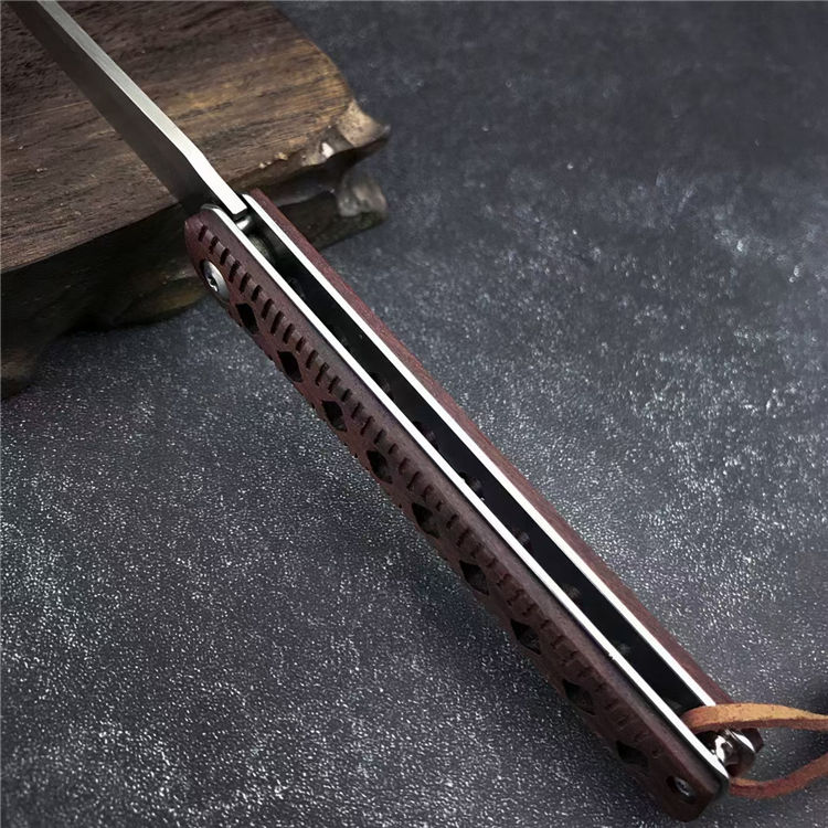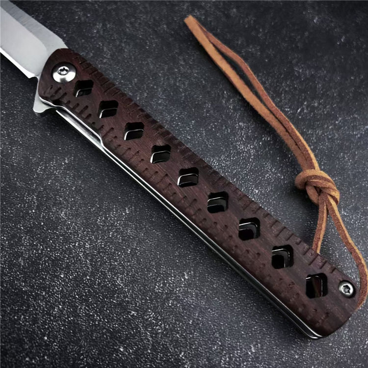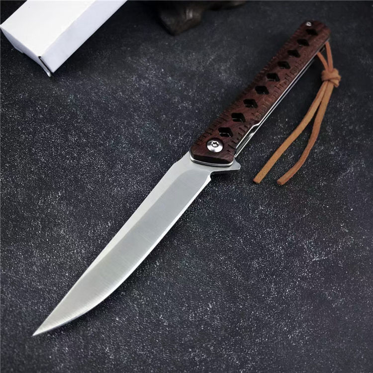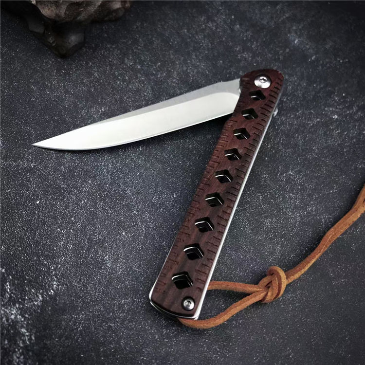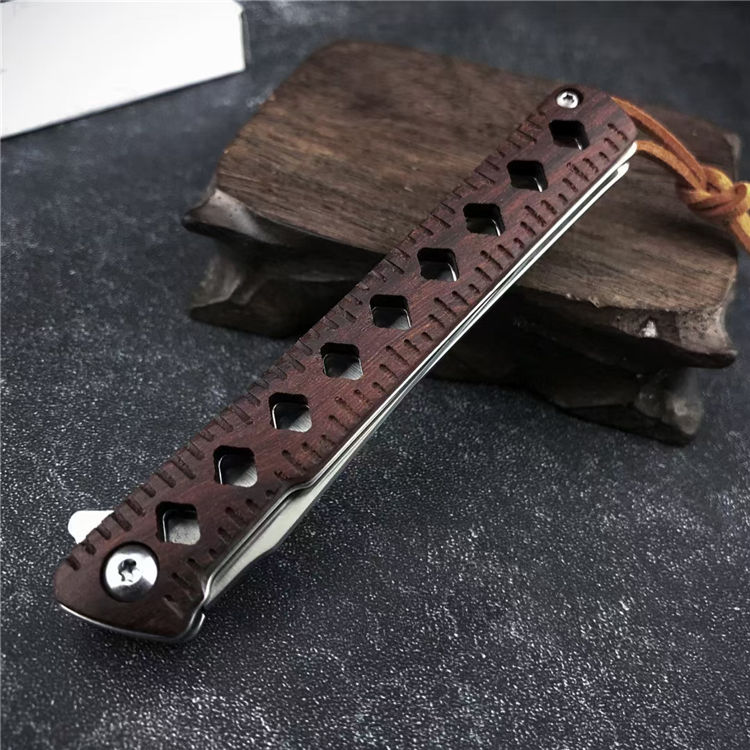 D2介尺折刀 全长:18.5CM 刃长:8.3CM 刃宽:1.5CM 刃材:8CR13MOV 硬度:58 刃厚:2MM 柄长:10.2CM 柄材:紫檀 重量:51G