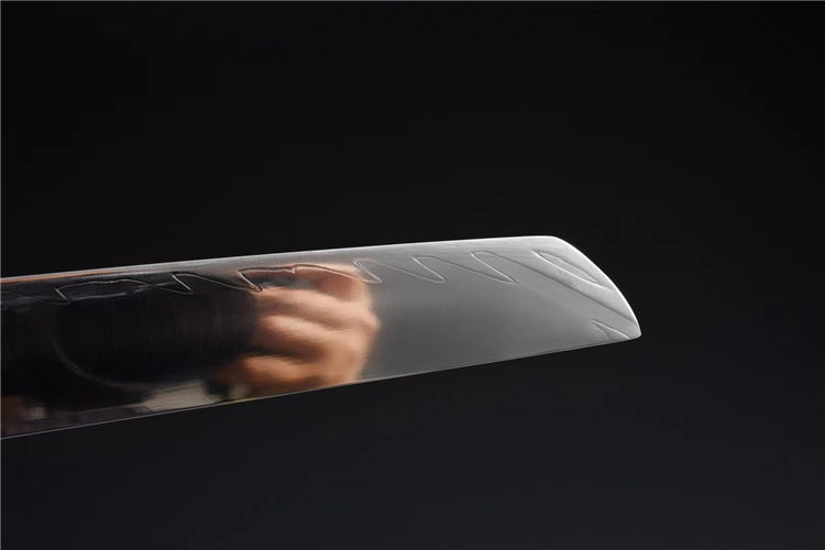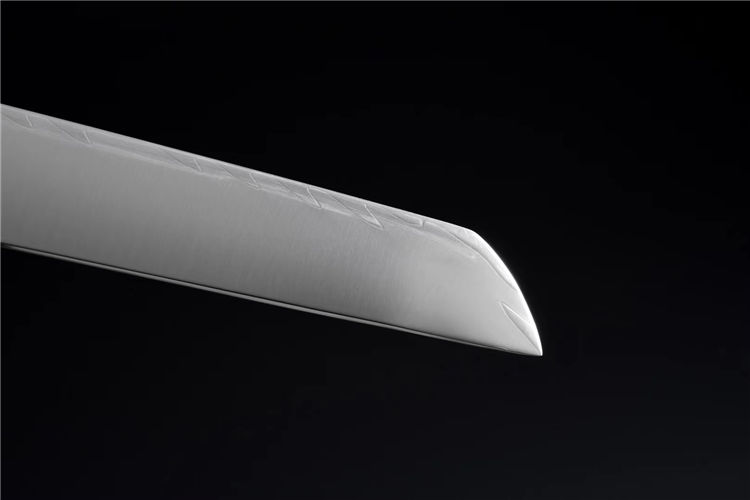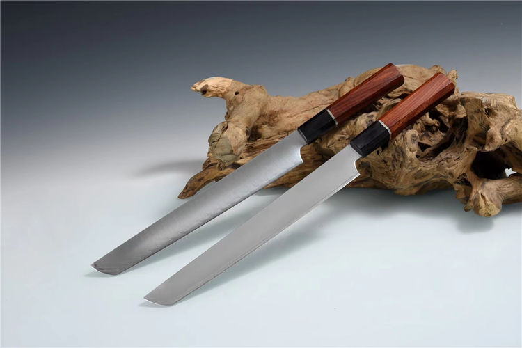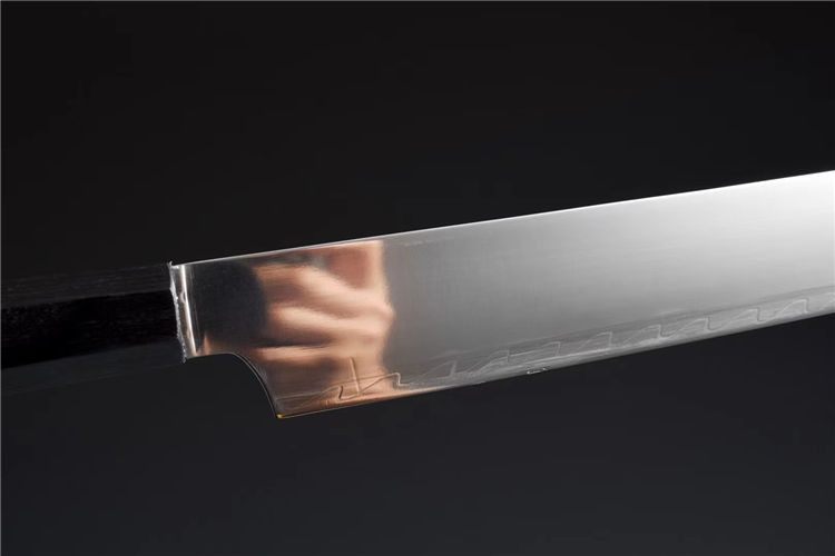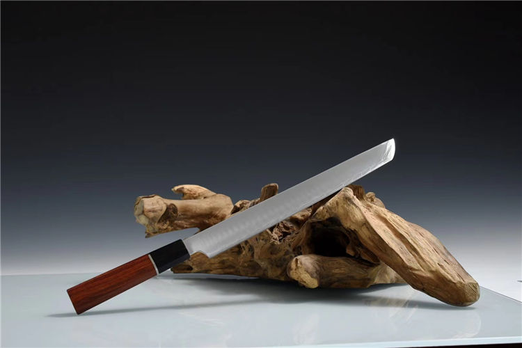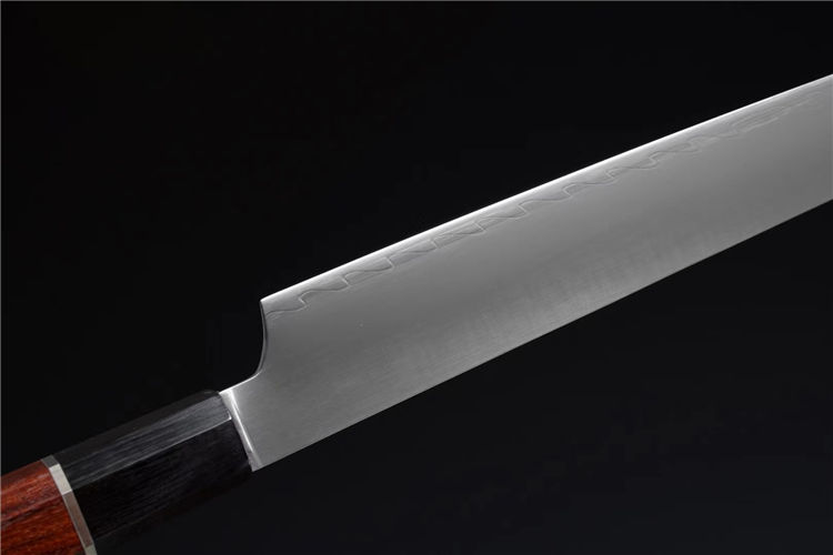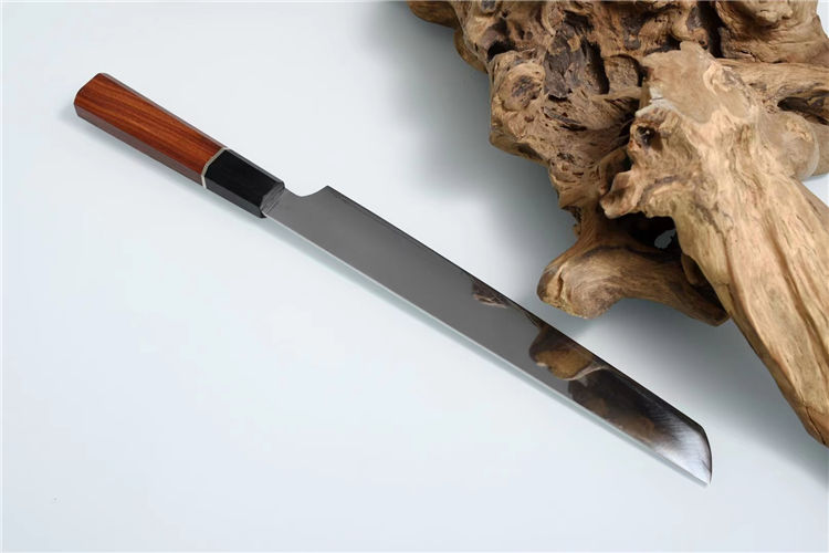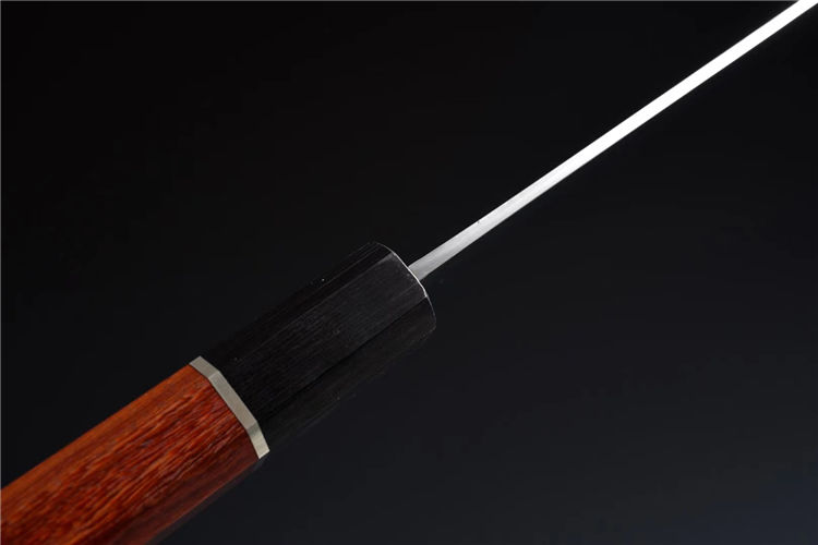 筋引厨刀 工艺:真空热处理 硬度:58~60HRC 装具:无 刃材:三枚禾夹钢 柄材:白牛角、红酸枝 鞘材:高端锦盒、布