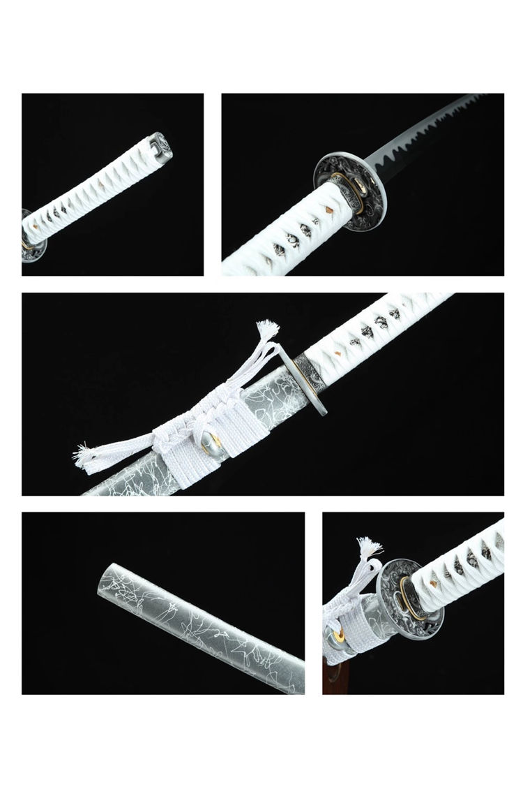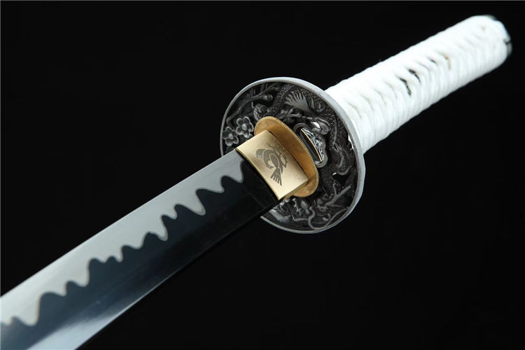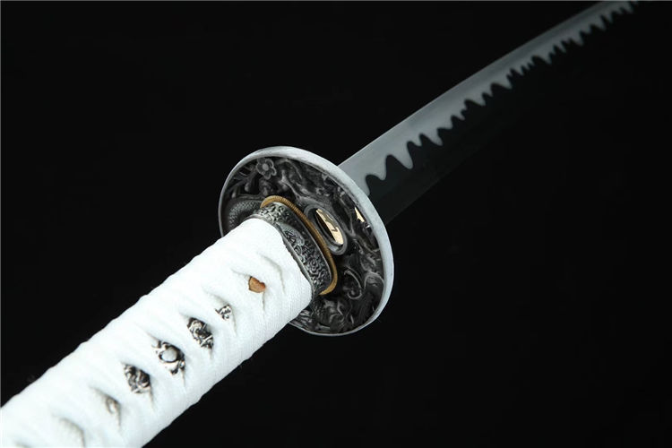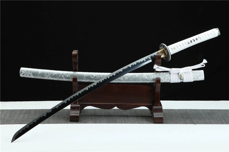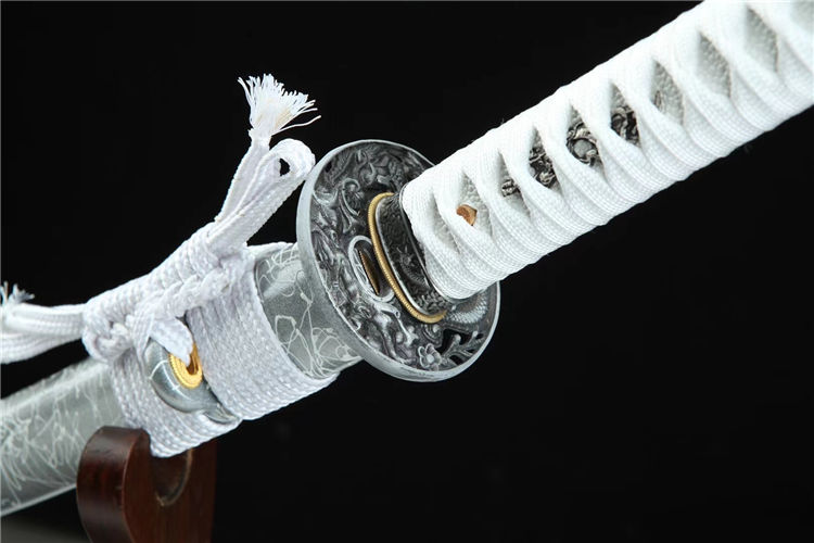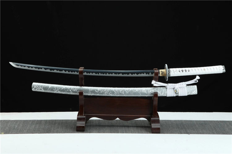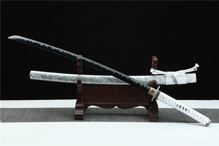 银锋武士刀 总长:103cm 刃长:71cm 柄长:27cm 刃宽:3.2cm 刃材:锋钢 工艺:高温发黑 柄材:仿鱼皮 刀鞘:油漆鞘 装具:合金镀银 配置:锦盒/油/布