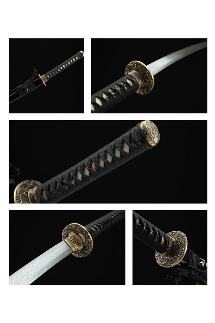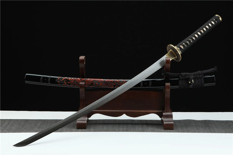 龙鳞武士刀 总长:103cm 刃长:71cm 柄长:27cm 刃宽:3.2cm 刃材:百炼龙鳞纹 工艺:油淬 鞘材:油漆实木手工雕刻 装具:纯铜 柄材:真鱼皮(可拆卸) 配置:高端锦盒,刀油,刀布