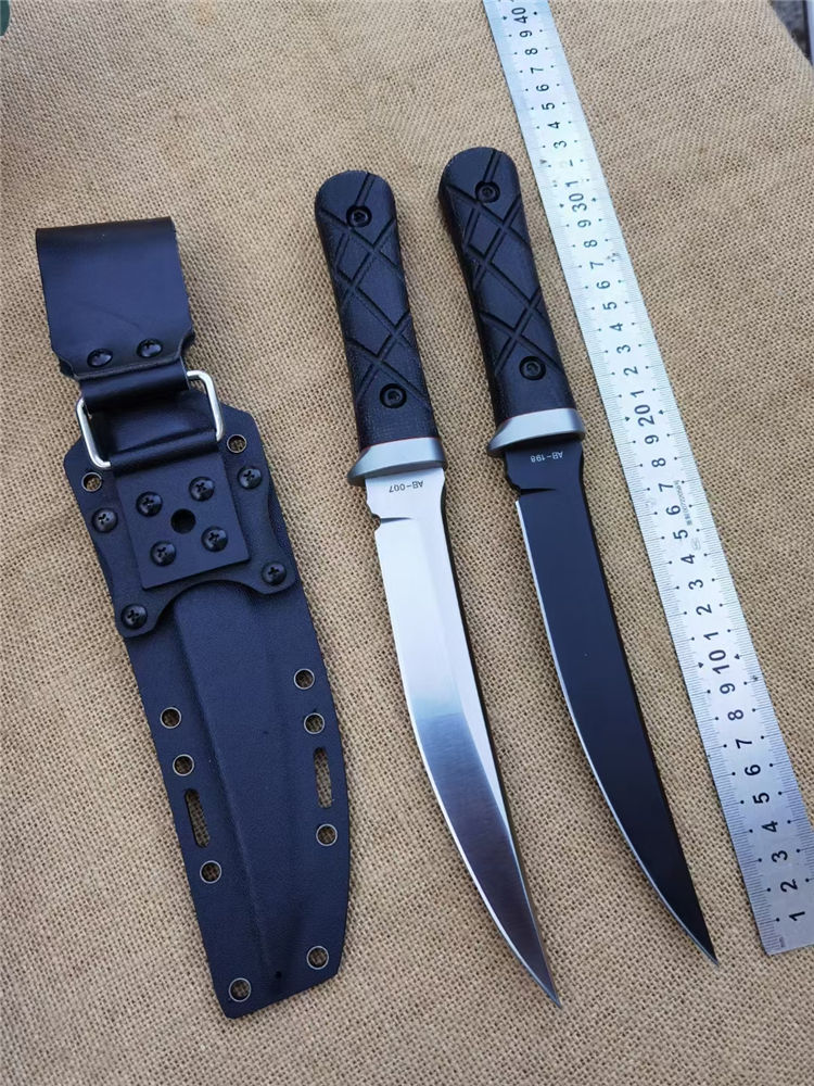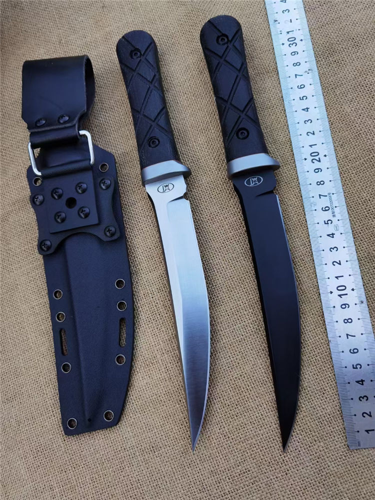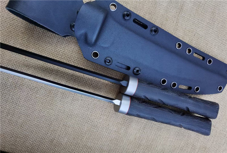 华匠坊必杀刃直刀 全长:320mm 刃长:191mm 厚度:5.8mm 柄长:129mm 刃宽:27.5mm 刀鞘:2.0美国进口K鞘头层皮挂带 材质:A8(真空热处理) 硬度:59-60HRC 护手钛合金,手柄亚麻柄一体龙骨 表面:镀黑钛和钢本两种刃面分段打磨,难度增大许多许多。上翘的刀尖,杀气凛凛,强壮的假刃,安心安然