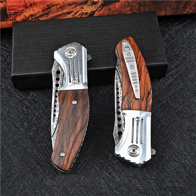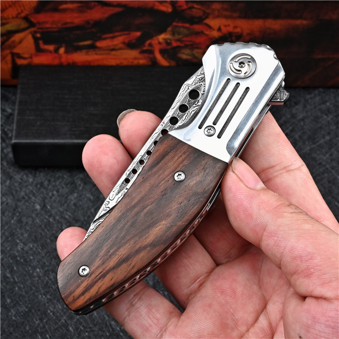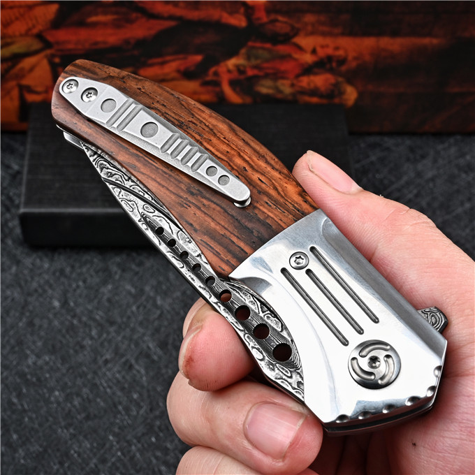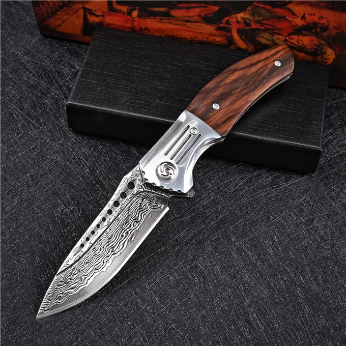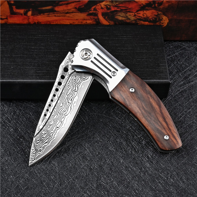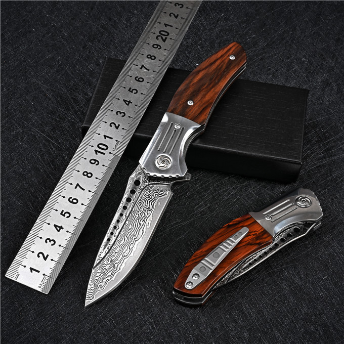 大马士革权者折刀 总长:206mm刃长:87mm柄长:119mm刃厚:3.0mm刃宽:30mm净重:176g毛重:215.7g钢材:VG10大马士革柄材:微粒黄檀木+不锈钢硬度:60-61HRC表面处理:表面进行镀钛抛光效果,增加表面表层硬度,不容易刮花包装:黑色盒子注意:天然木材颜色纹路各异,大马士革钢纹路各异,每把都是独一无二的,以收到实物为准
