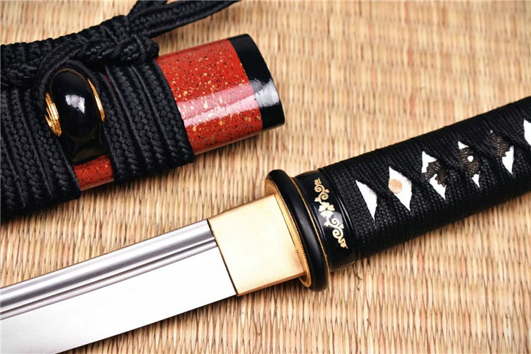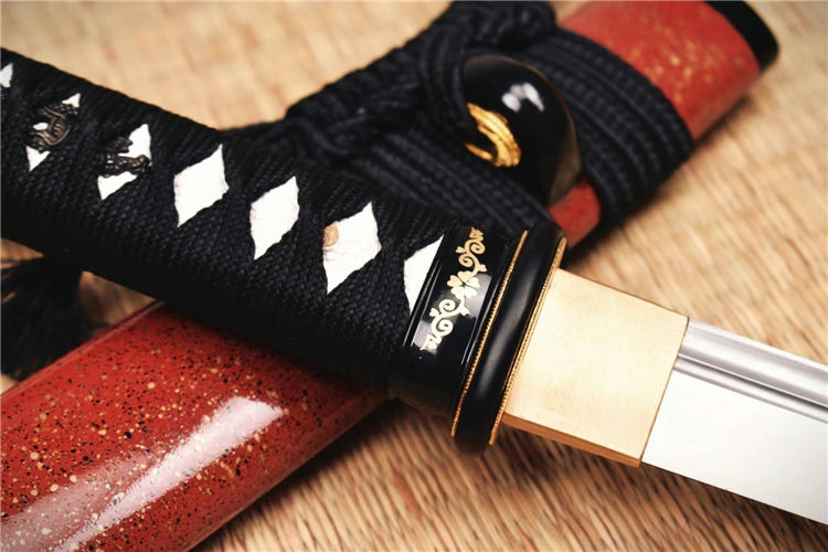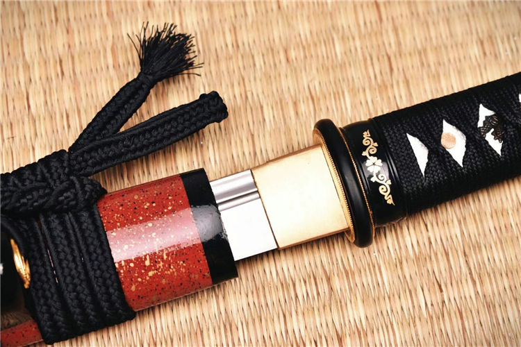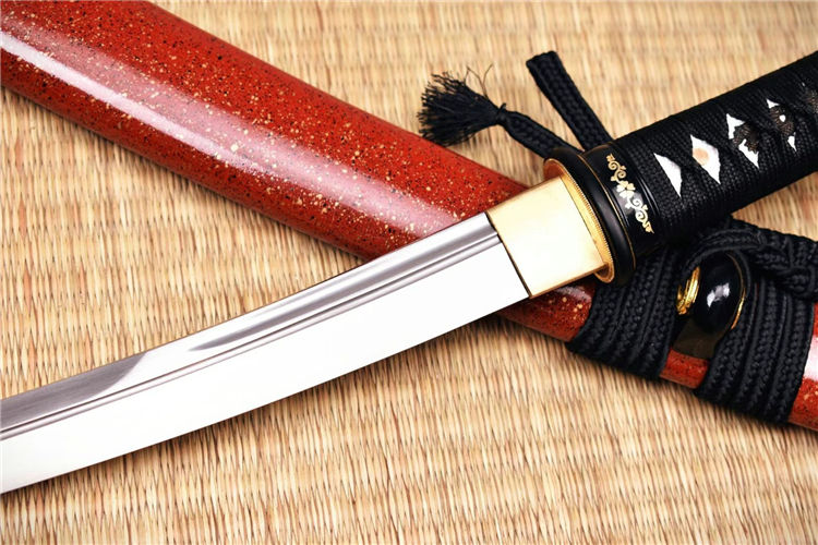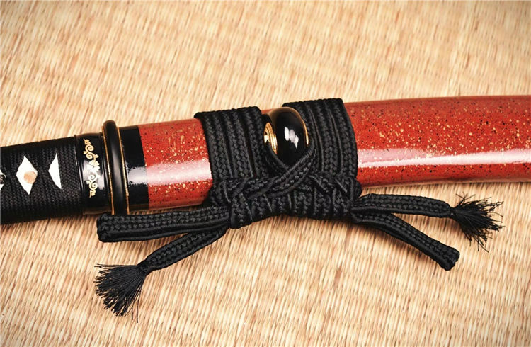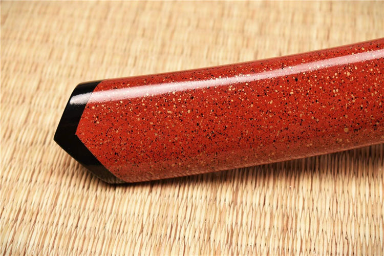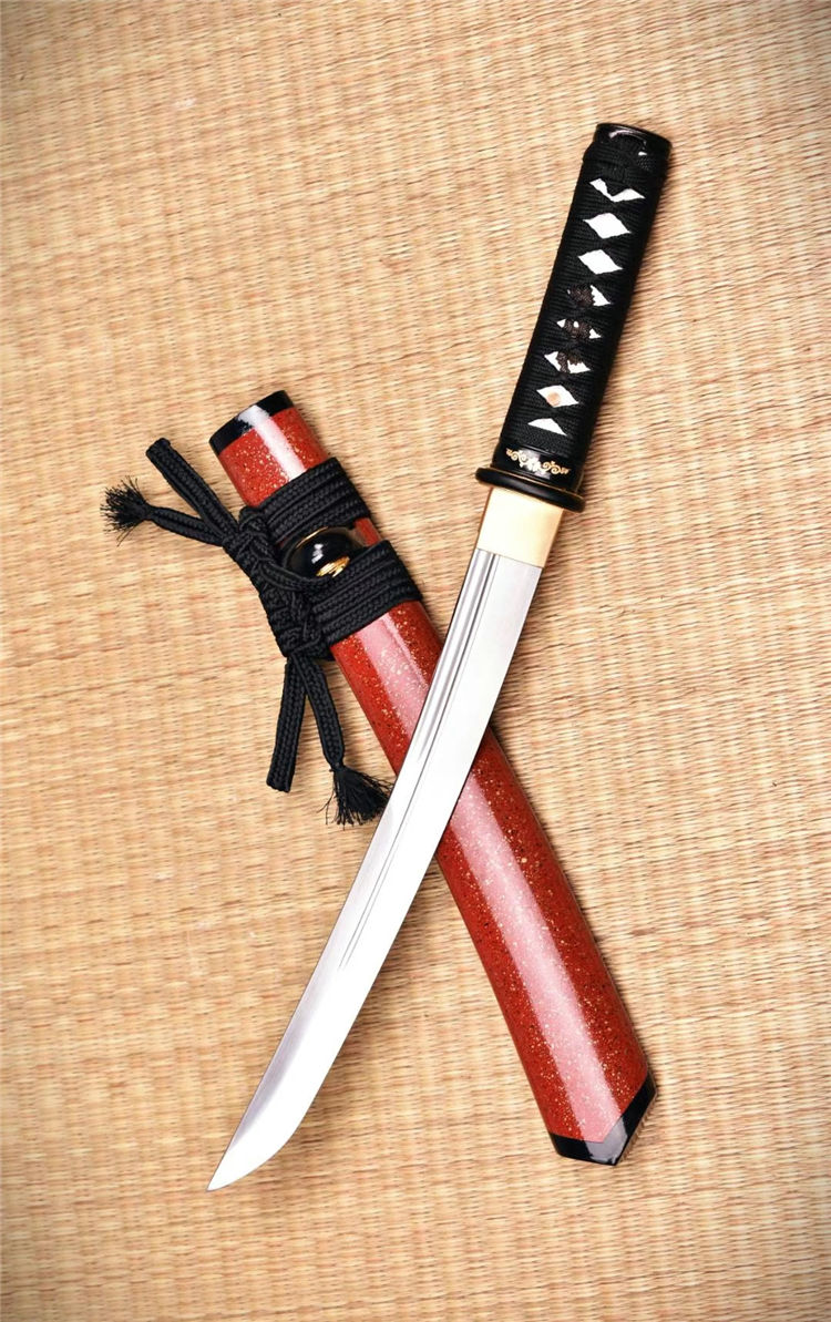 红姬武士短刀 全长:52.5cm 刃长:29.7cm 刀身:材料为1095锻造 开槽研磨,手工木制漆鞘,居家把玩收藏佳品