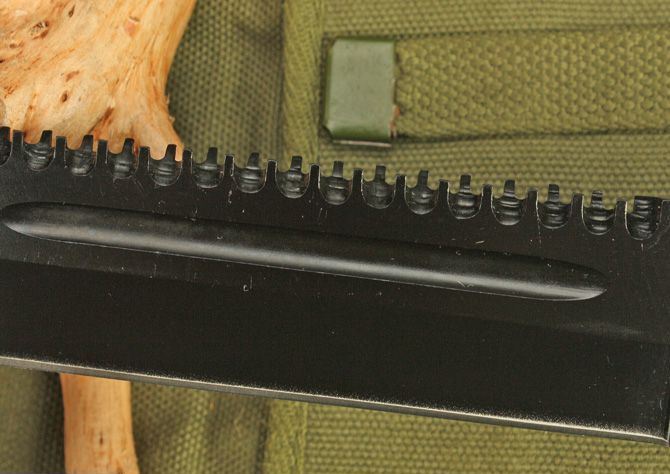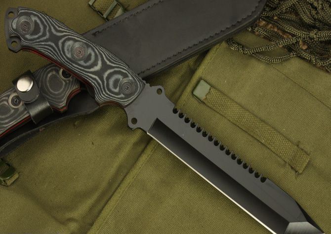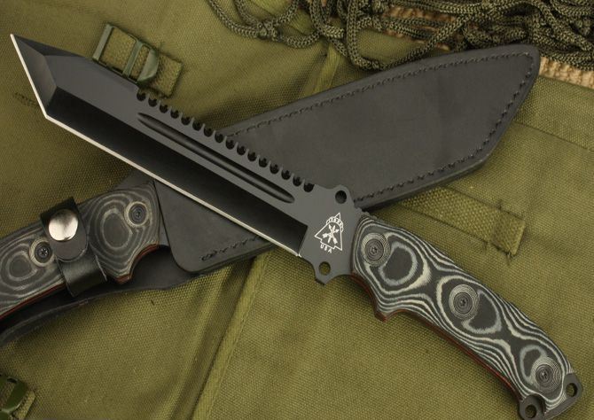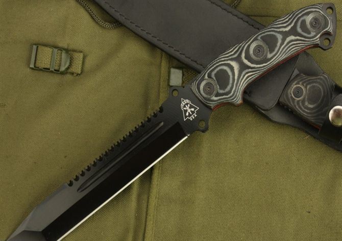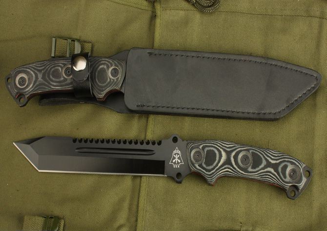 全 长: 33cm 刃 长: 19.6cm 刃 厚: 4.8mm 刃 材: 440C 硬 度: 58HRC 重 量: 430g 表 面: 黑钛 柄 材: 米卡塔 刀 鞘: 牛皮