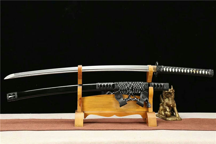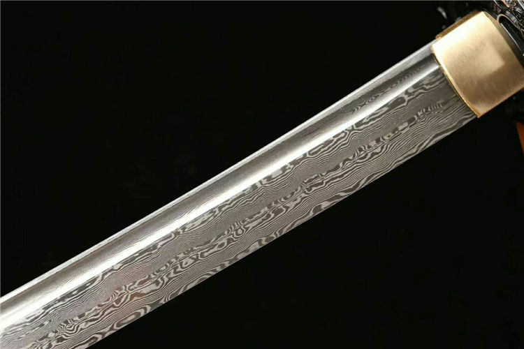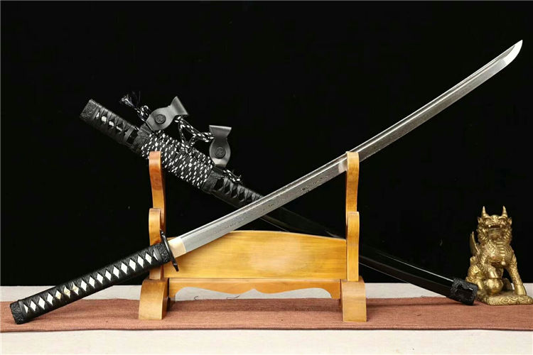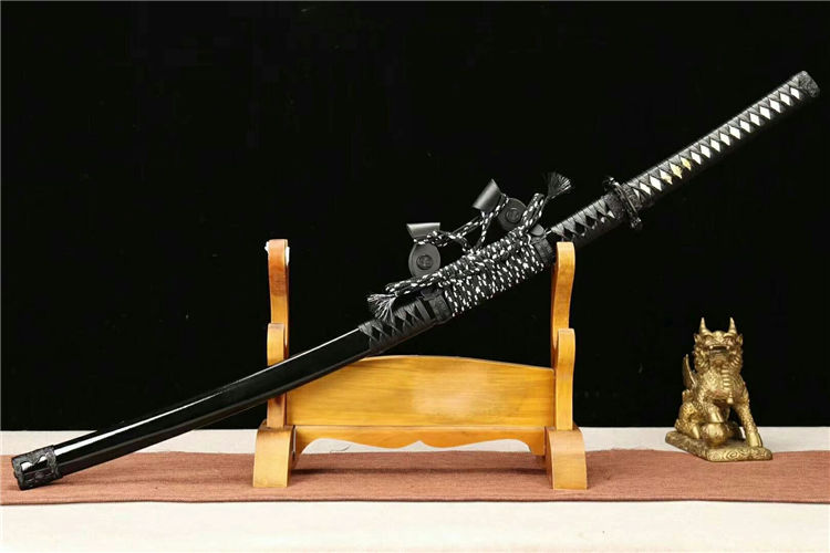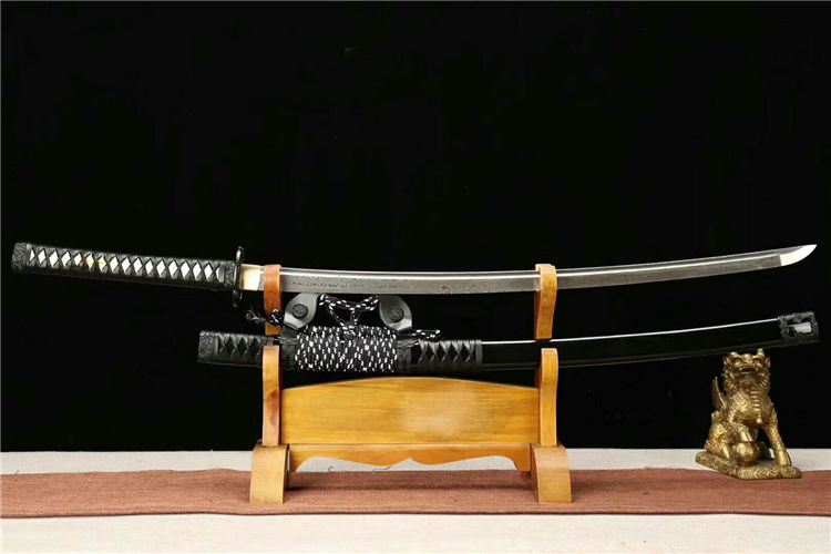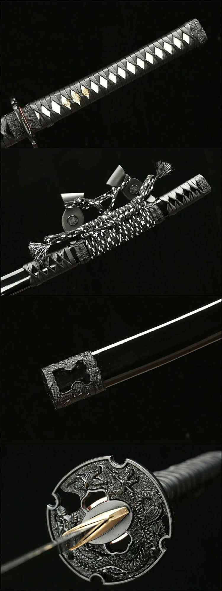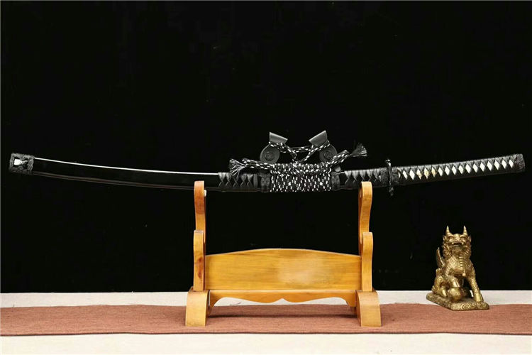 暗黑幽太刀 总长:103cm 刃长:72cm 刃宽:3.2cm 刃厚:0.7cm 刀反:2.2cm 垫纸:仿珍珠鱼皮 木材:柏木油漆 装具:合金装镀金 工艺:锰钢手工锻打,极限弹性热处理工艺,十三道手工水磨