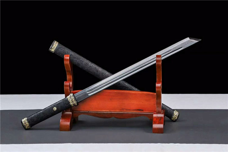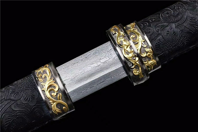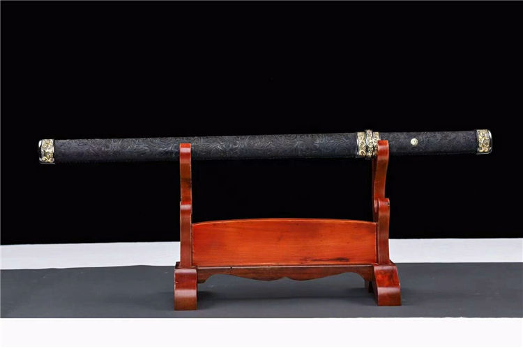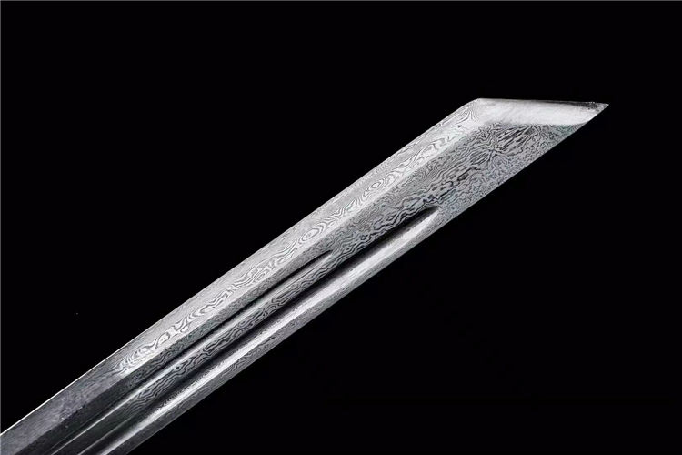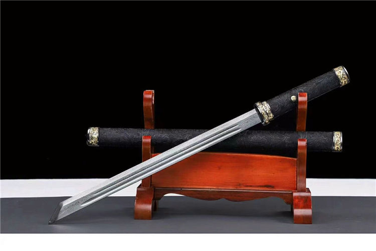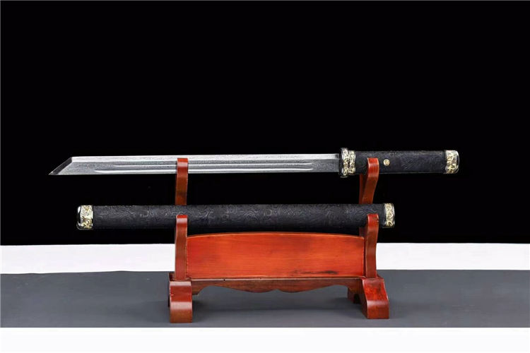 百练刀 全长:78cm 刃长:52cm 柄长:21cm 刃宽:3.4cm 刃厚:0.5cm 材质:花纹钢锻打 硬度:60 鞘材柄材:实木风尾皮包裹 装具:双色合金,送锦盒
