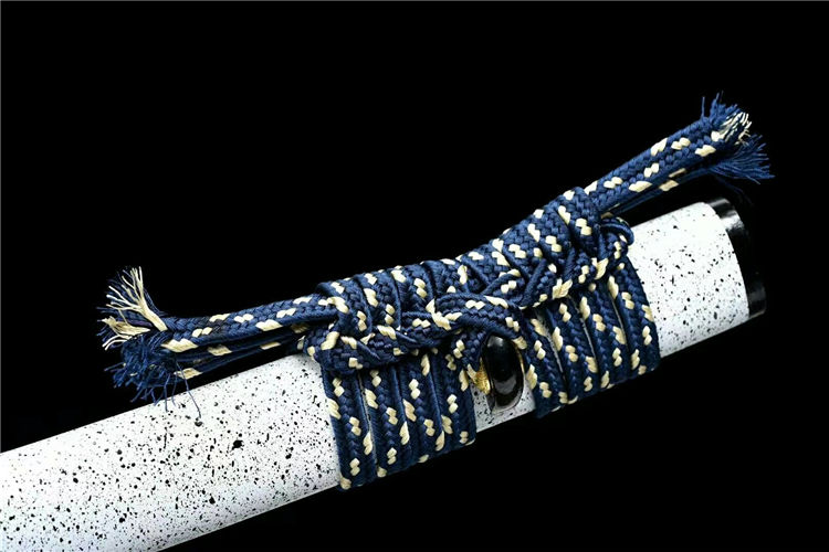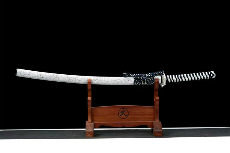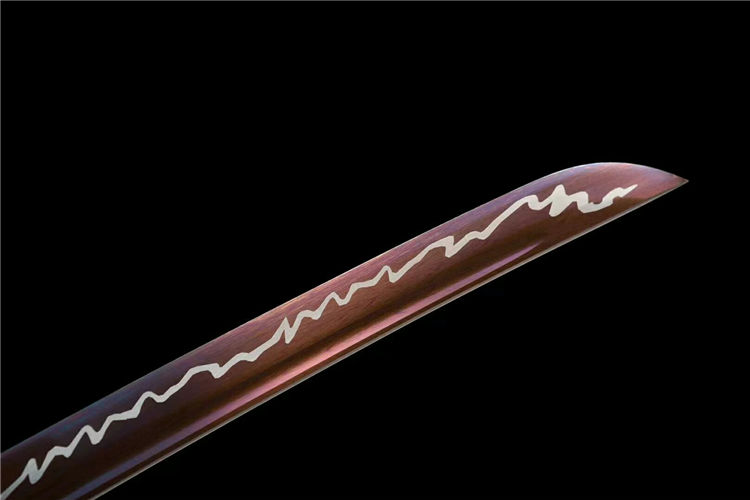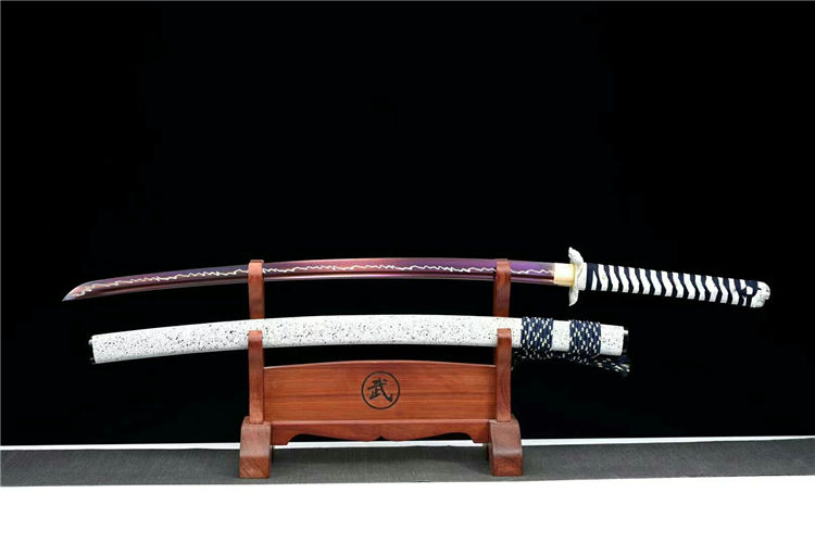 蓬莱武士刀 全长:103cm 刃长:71cm 柄长:26cm 刃宽:3.2cm 刃厚:0.7cm 材质:高性能锰钢 硬度:60 鞘材:实木漆鞘,配高端锦 工艺:烤紫“惊雷纹”研磨工艺