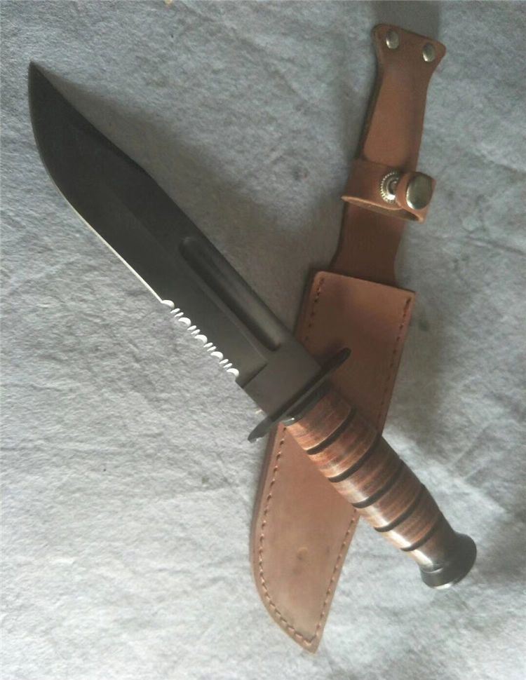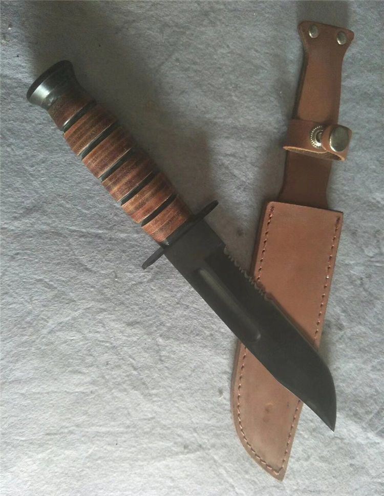 刀鞘:头层纯牛皮 纯牛皮的刀套、纯牛皮的刀柄!刀身采用440高级不锈钢制造,刀刃锋利,刀身厚度甚至比美国产卡巴还要厚,可能是仿造者更倾向于让它来干些粗暴的活吧。 绝对超值的一把刀,如果你舍不得用原品来干活的话那就用这把国产的1217来干吧!