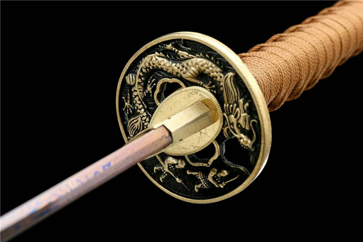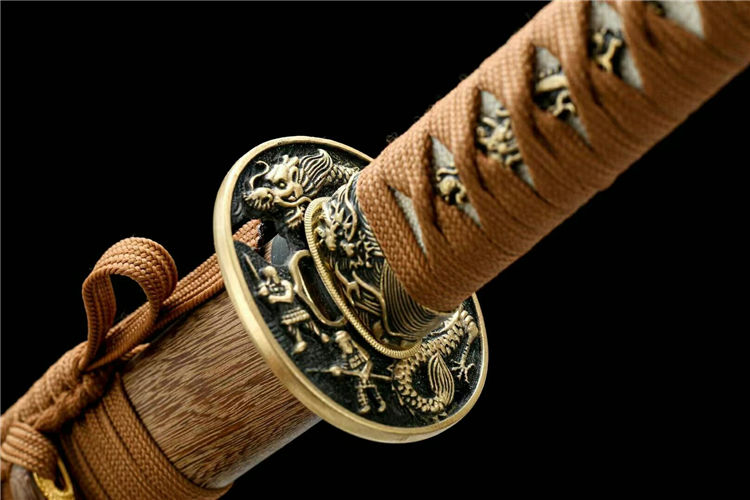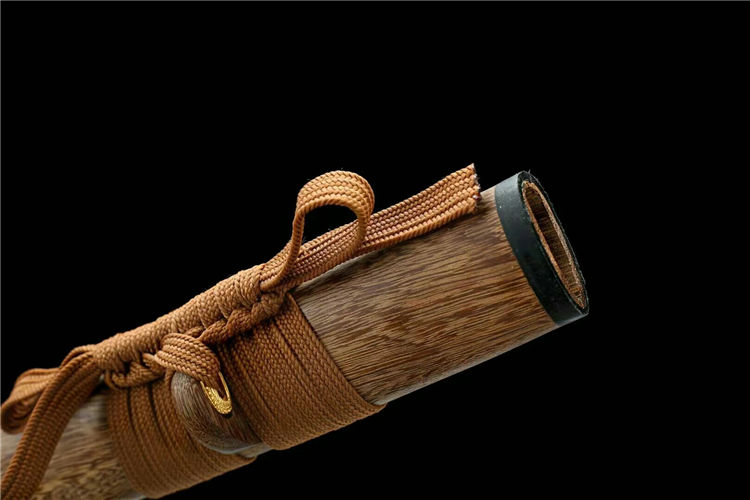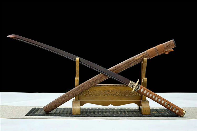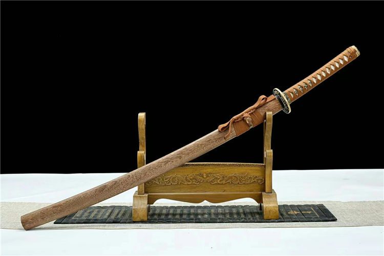 原鸣武士刀 全长:103cm 柄长:24cm 刃长:73cm 刃厚:3cm 总重:1.5kg 刃材:花纹钢扭转烤蓝,精细研磨 工艺:花梨木鞘 装具:全铜装具,真鱼皮木柄 适于:收藏,送礼,防身,摆设等