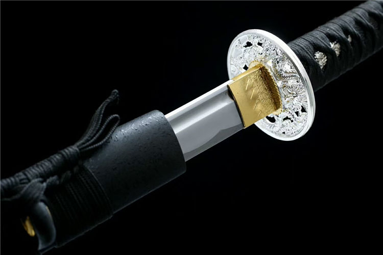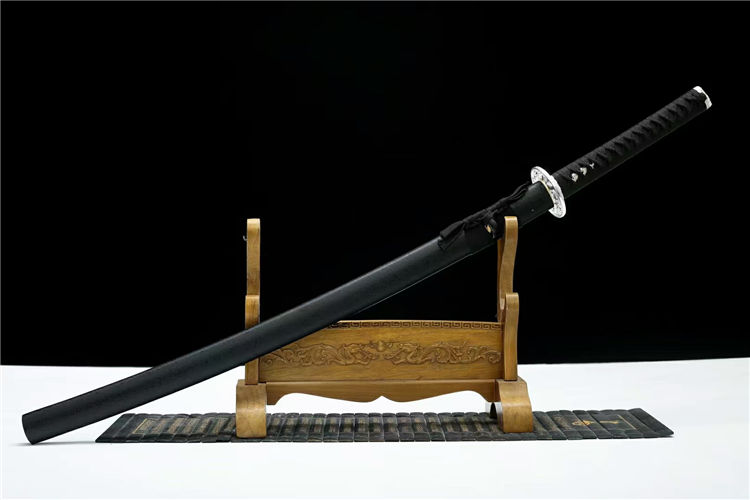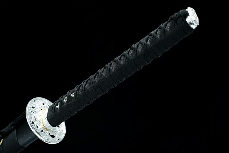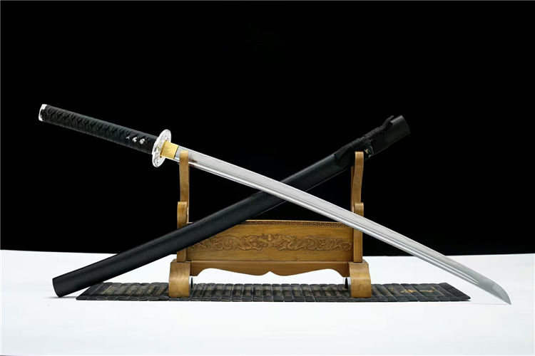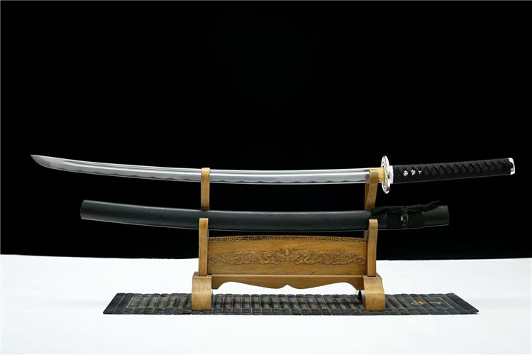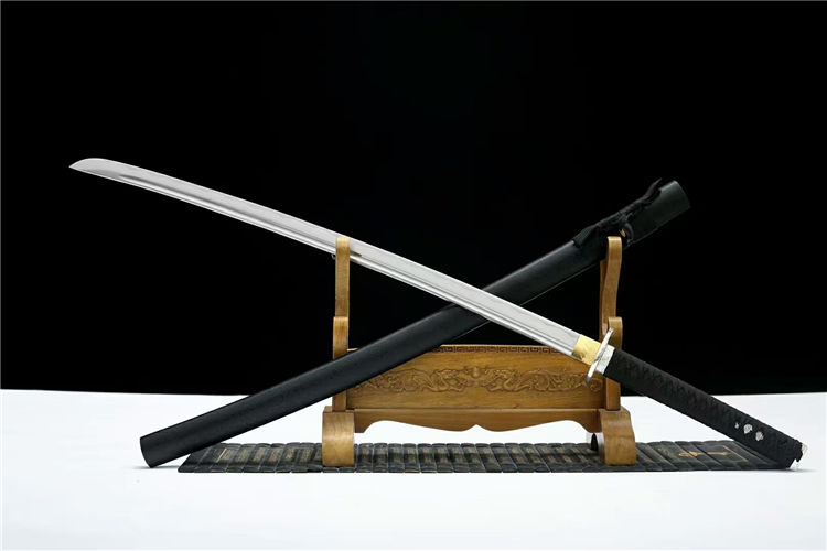 弘月武士刀 全长:103cm 柄长:24cm 刃长:73cm 刃厚:3cm 总重:1.4kg,标准重心(附瓦楞盒) 刃材:高碳钢锻炼,可削,可过水瓶 工艺:实木鞘外罩汽车漆 装具:合金,鎏银纹案 适于:收藏,送礼,防身,摆设等