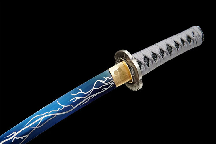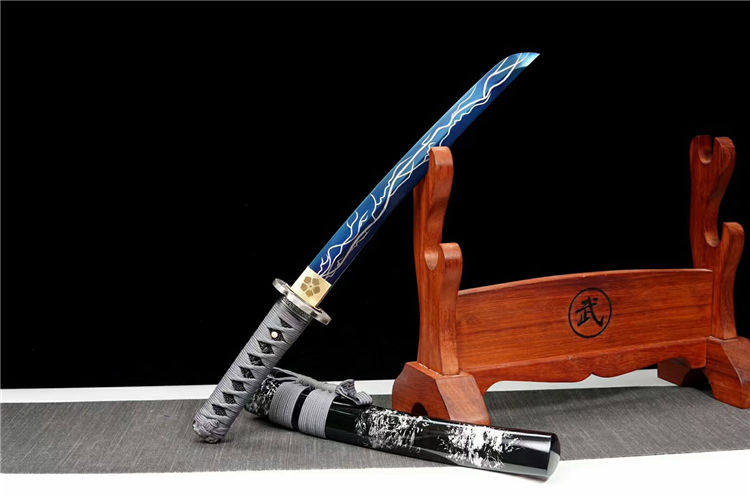 星月助差武士刀 全长:55cm 刃长:33cm 柄长:17cm 刃宽:3.2cm 刃厚:0.6cm 重量:0.7KG 装具:锌合金刀镡,实木漆鞘 配高端锦盒 锰钢锻打弯曲90度不变形,刀身烤蓝工艺闪电处理,刀身刻花工艺处理