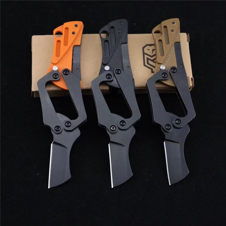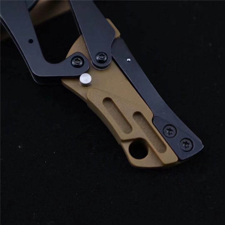 坦克变型机械折刀 全长:119mm 柄长:79mm 刃长:28mm 刃厚:2.2 mm 刃宽:23mm 表面:黑钛 硬度:58HRC 刃材:5铬钢 柄材:G10(合超外围3.8cmx52cm) 净重:41g 包装:纸盒